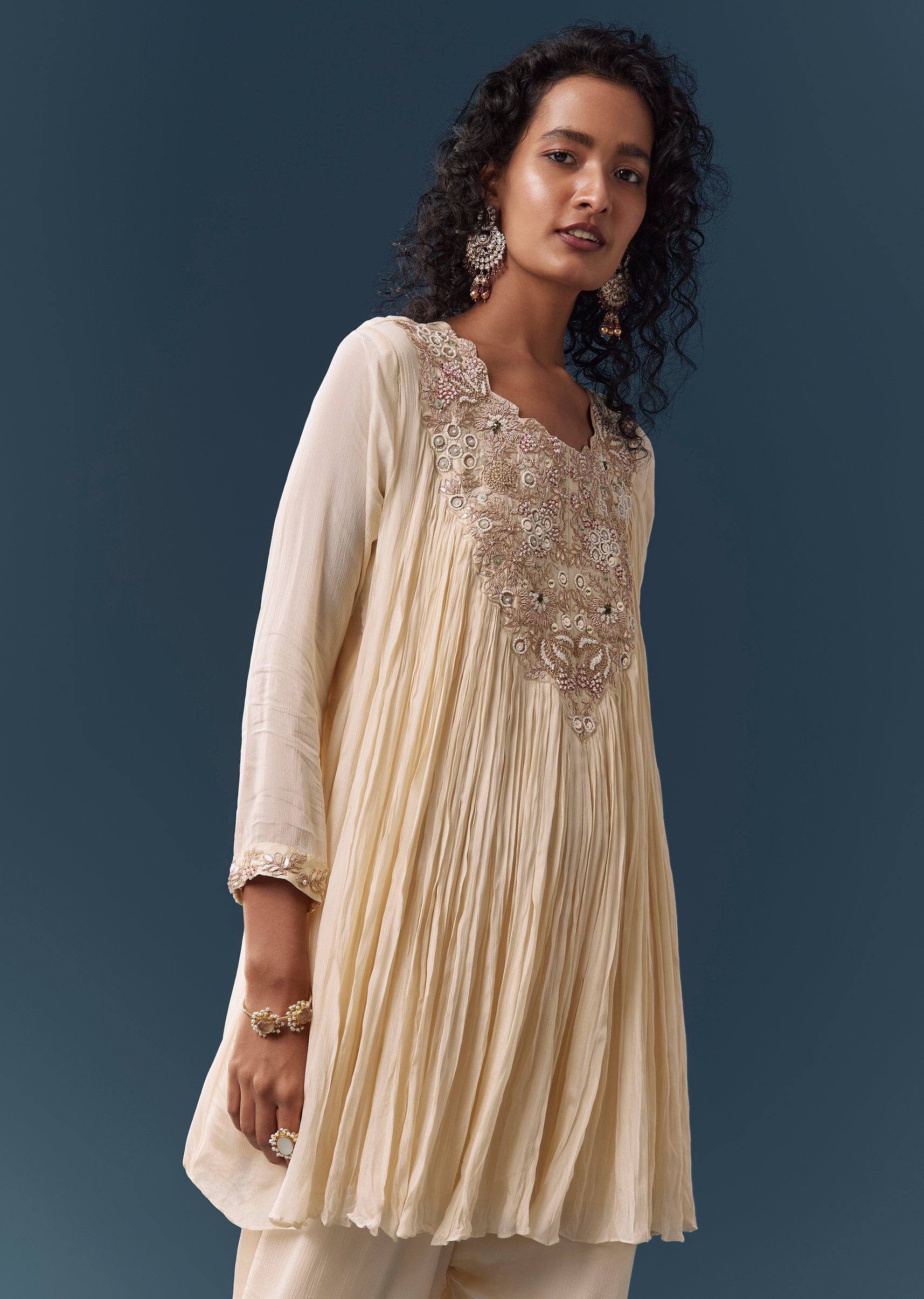 This ivory cape-style sharara set is crafted in chinon and finished with delicate zardosi and moti embellishments for understated glamour. Featuring a round neckline and 3/4th sleeves, the A-line top... More Product Details