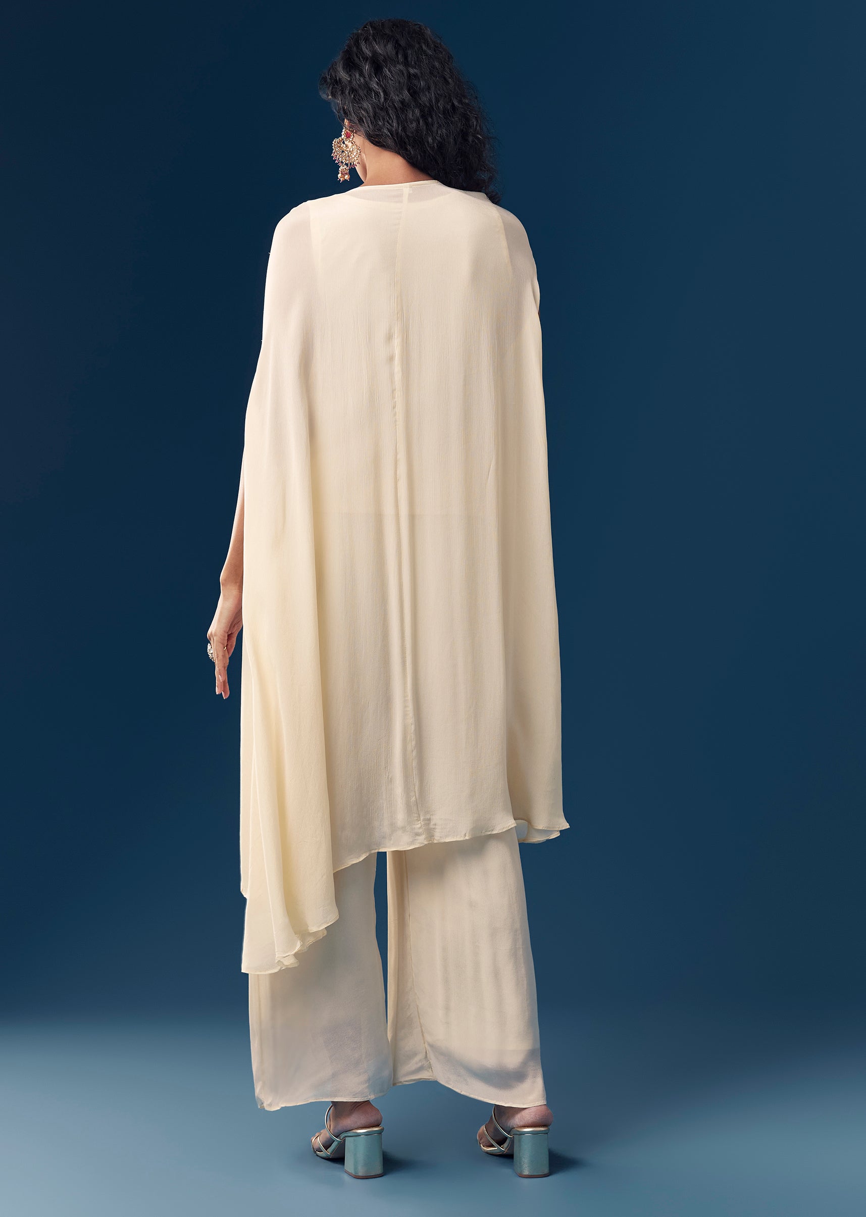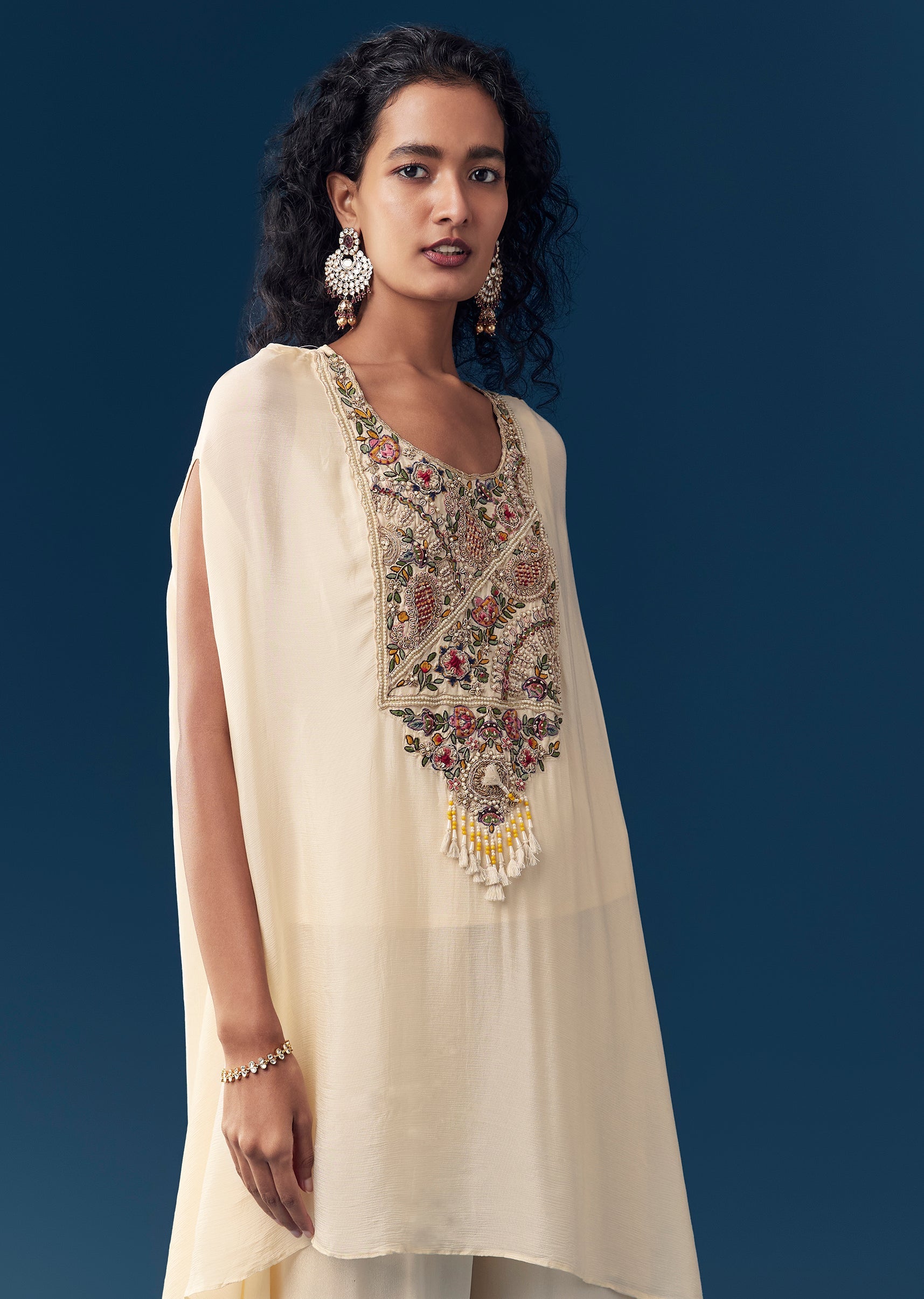 Pair with minimal jewellery and soft makeup, allowing the embroidery and sleeve movement to remain the focal point.