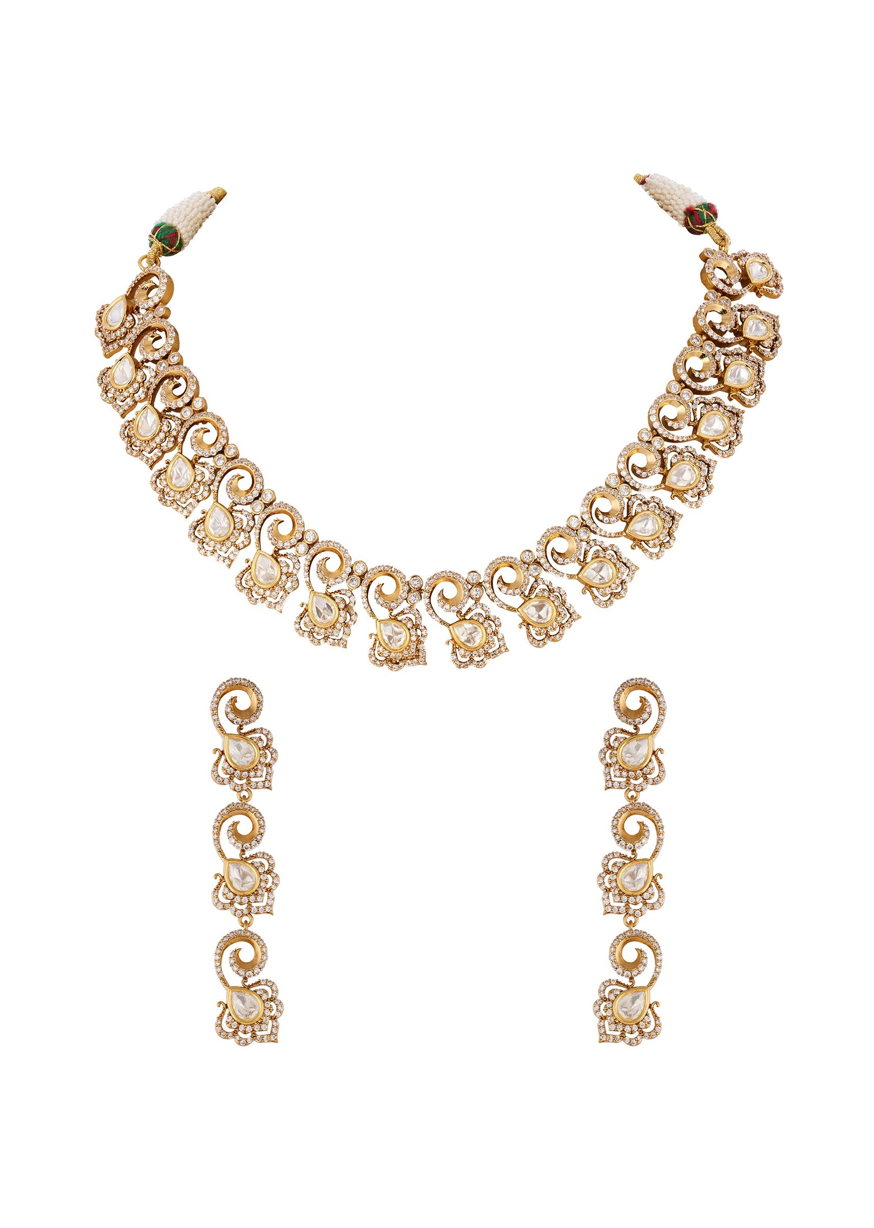 A handcrafted gold white jewellery set created using the traditional Kundan Jadau technique. It features Polki uncut diamonds and semi precious stones with delicate drops reflecting exquisite craftsmanship and classic Indian jewelry traditions. Perfect for weddings festive occasions and special celebrations this piece adds a regal and elegant touch to any ensemble. Awarded as the Most Trusted Brand, we're delivering styles you love, just as promised.