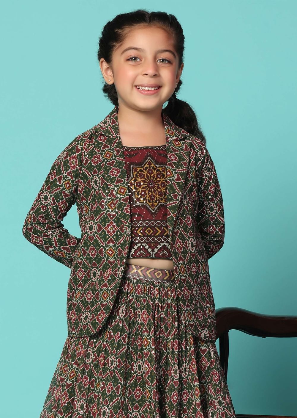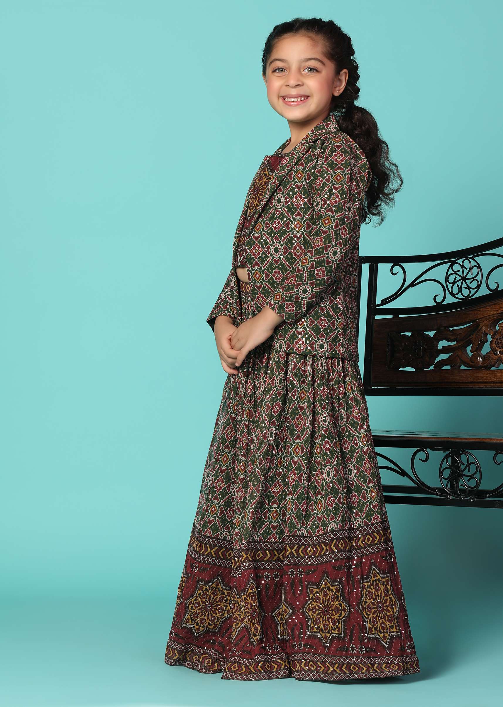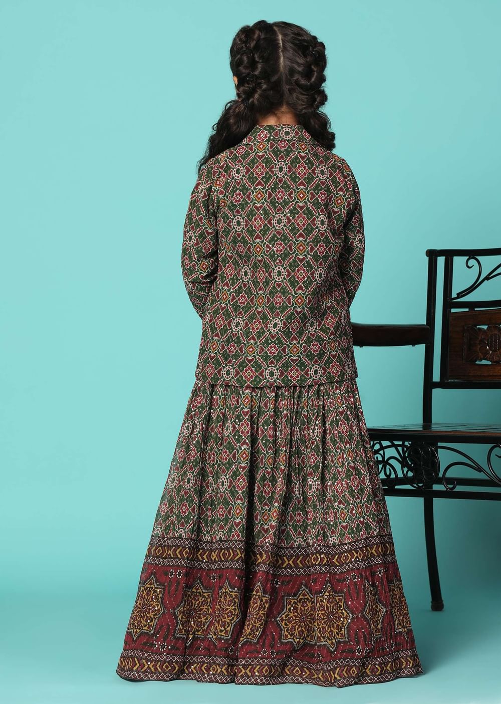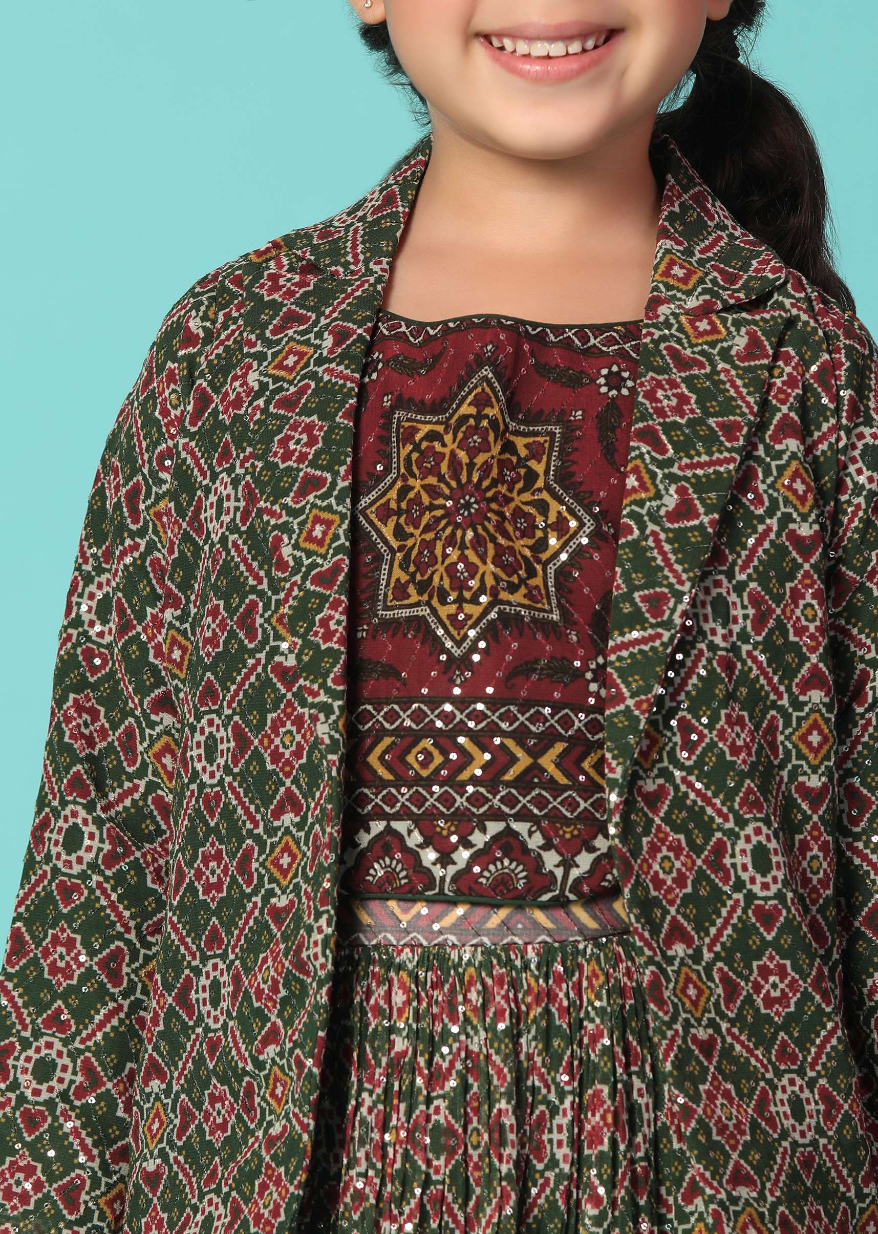 Dress your little princess in our stunning green top and lehenga set. This stunning ensemble exudes elegance and charm with its intricate sequin detailing. The top has a shirt collar neckline and comes with full sleeves. The set comes with a matching jacket.EVENT - Ideal for festive events.Change folds regularly. Awarded as the Most Trusted Brand, we're delivering styles you love, just as promised.