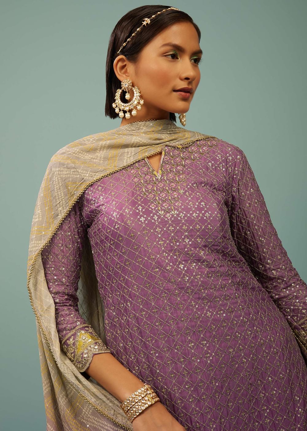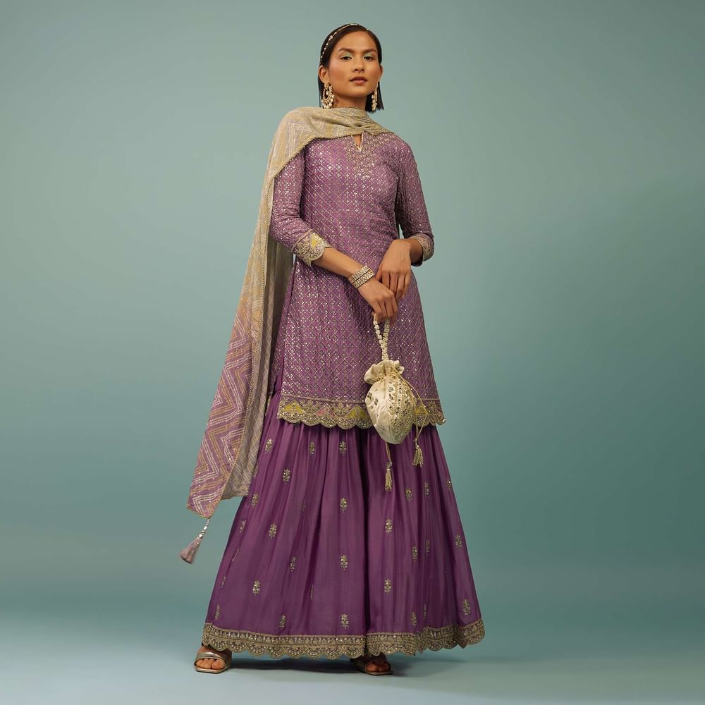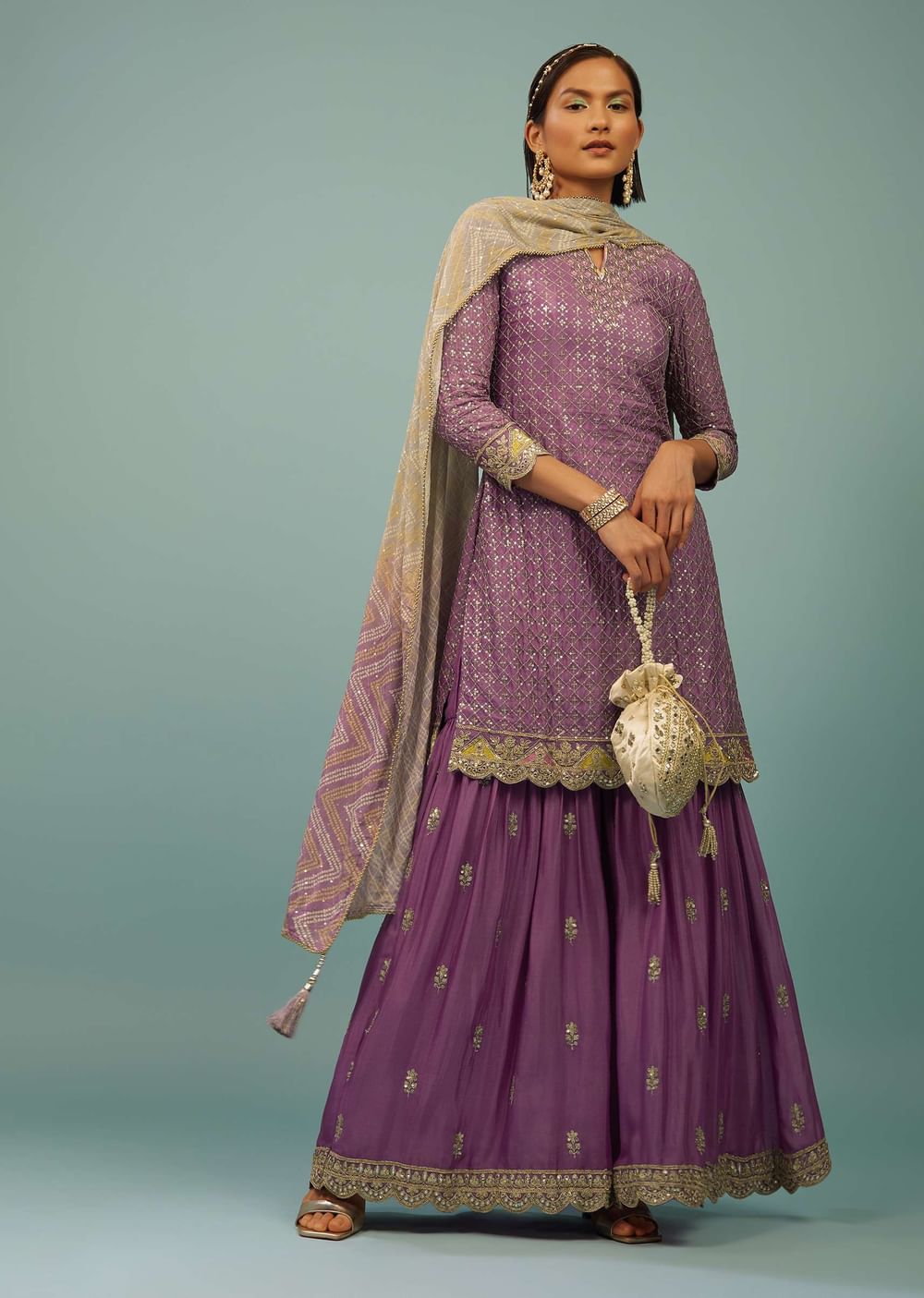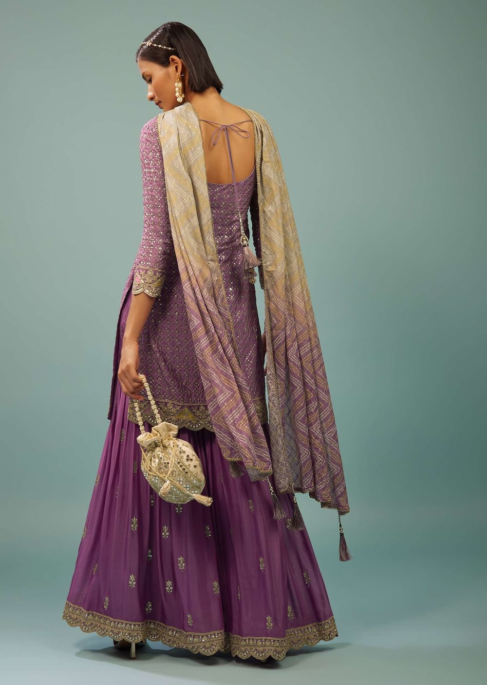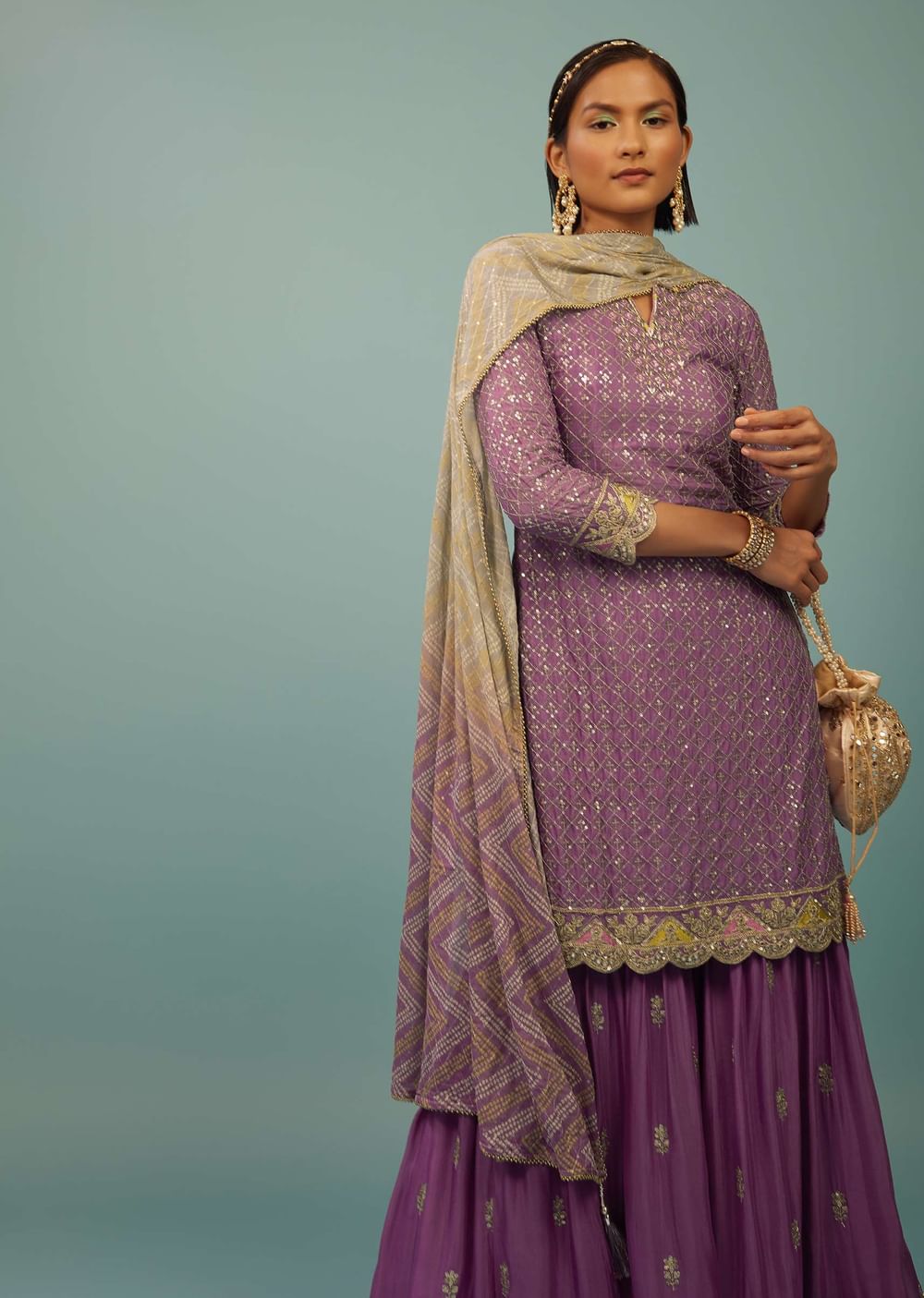 Lavender Purple Sharara Suit With Embroidery And Bandhani Dupatta