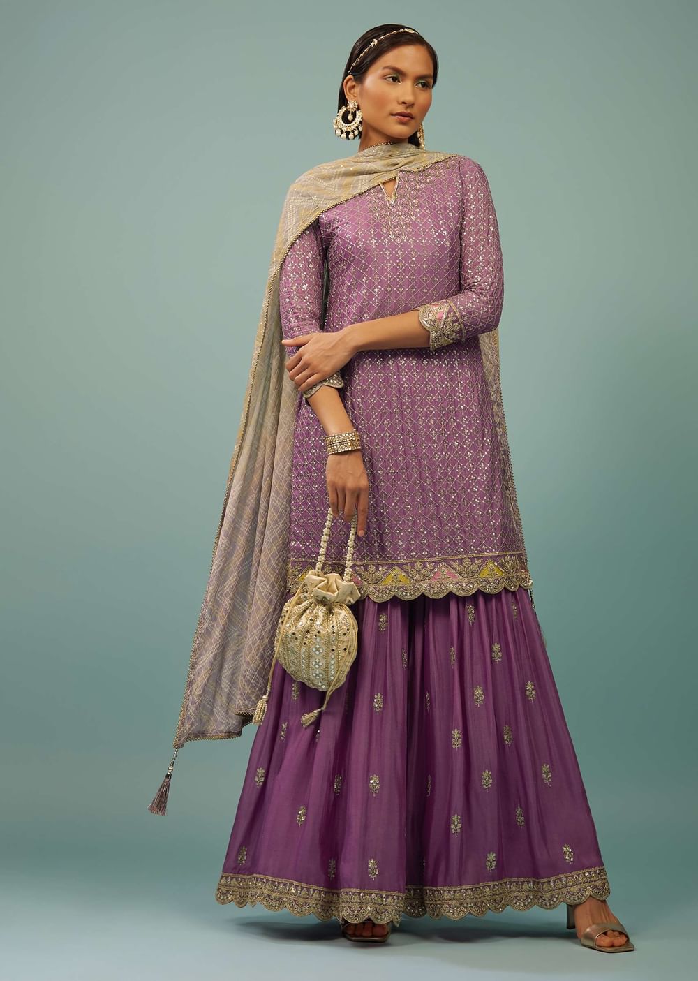 Kalki dusty lavender purple sharara suit set with embroidery in chinon. The kurta comes in a slash neckline, poth embroidered yoke with cut dana, zardosi, and beads, and a back... More Product Details
