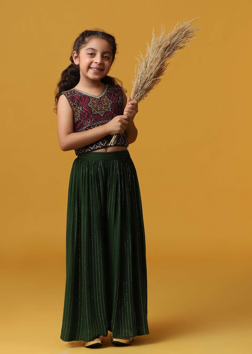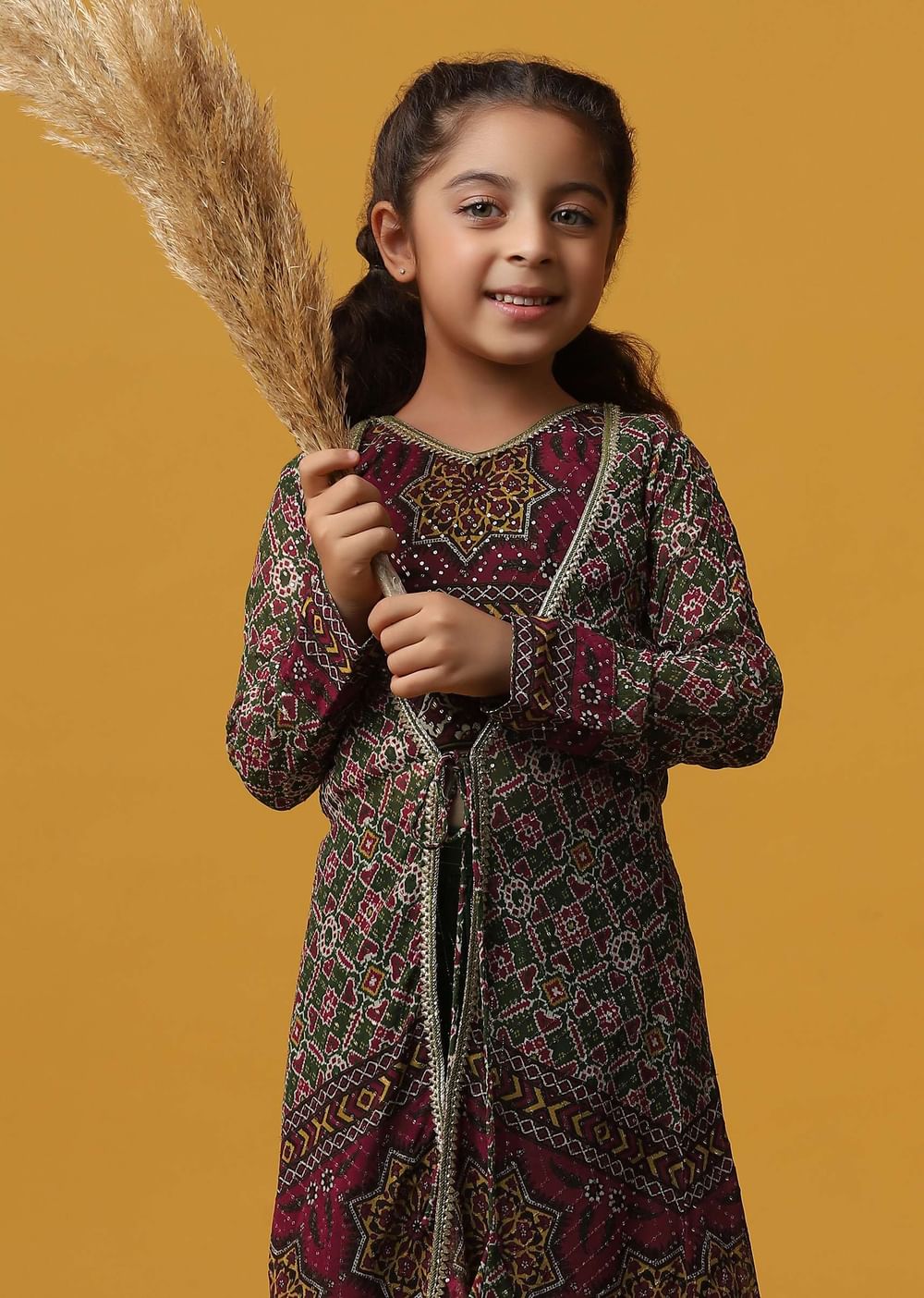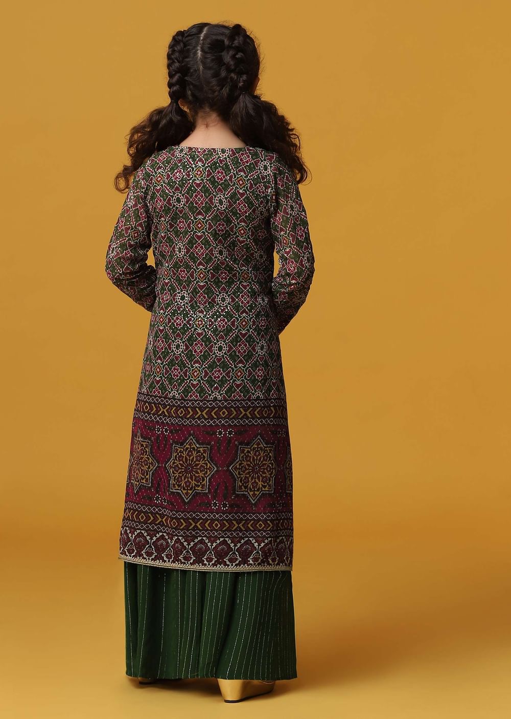 Dress your little girl in our forest green top and palazzo set with jacket, crafted in soft viscose georgette. The set features a captivating print pattern adorned with shimmering sequins... More Product Details