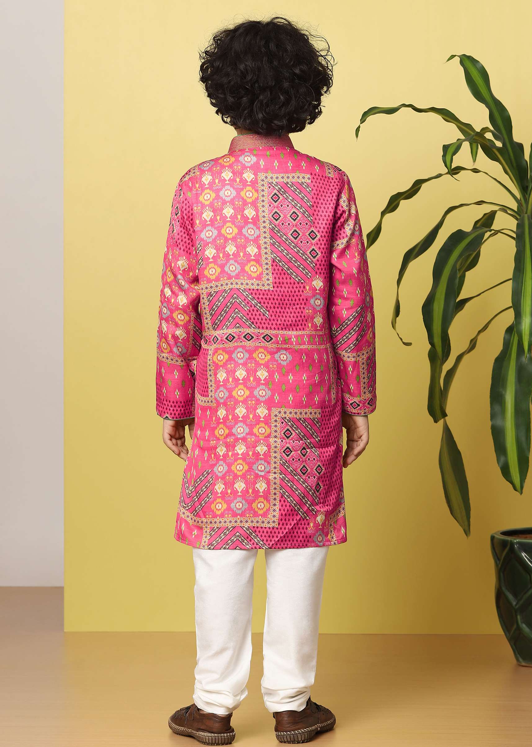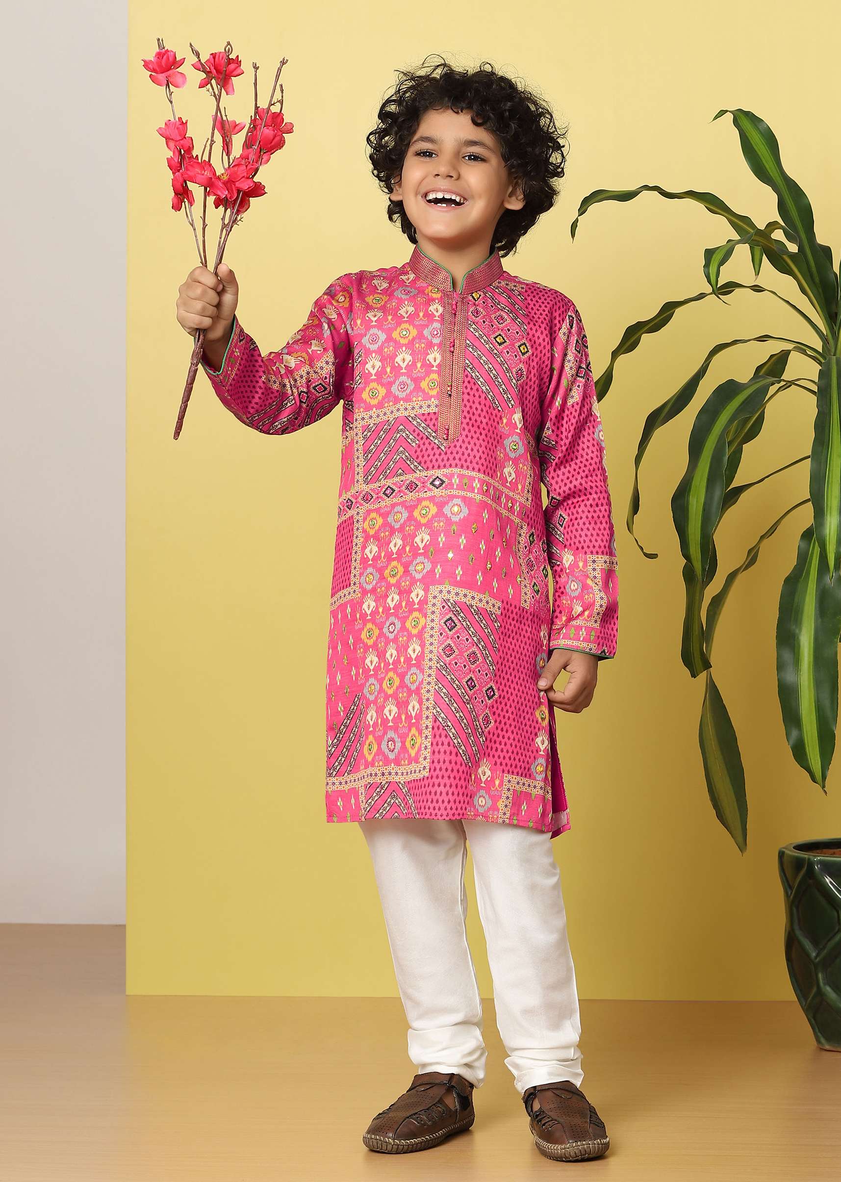 Introducing our eye-catching fuchsia pink boy's kurta set, a perfect choice for young boys. This set features an attractive abstract print in contrasting colors, accented with intricate mirror work and zari work around the yoke, adding a touch of elegance and sophistication to the outfit.The set also includes a matching churidar.EVENT - Perfect for a family gathering, religious ceremony, or any other special occasion. .The garment should be kept in Soft Muslin fabric. Do not spray perfume directly on the garment. Kindly keep the garment in a moderate climate as some of the embroidery material tends to react with the weather change. Awarded as the Most Trusted Brand, we're delivering styles you love, just as promised.