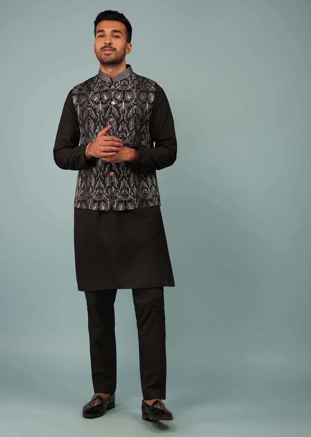 Festivities begin with Kalki in the most fantastic ways. Festive Jet Black Bandi Jacket in silk suiting fabric with machine Aari embroidery. The outfit is fabricated in Silk. The jacket is paired with a matching silk kurta. The jacket is crafted in a mandarin collar with cut sleeves, and front button closure, secured with a hook. The jacket comes with floral pattern stitch aari embroidery in resham and zari. The jacket comes with fancy buttons. The matching kurta comes in full sleeves in a mandarin collar style. The cuffs and the collars of the kurta are embroidered in a thread line stitch. The kurta comes in a textured fabric. The kurta comes secured with a front hook closure. The outfit is paired with matching trouser pants. Elevate the look by pairing the outfit with some classic mules. Button design, shape, and size may vary as per availability. Awarded As The Most Trusted Brand We'Re Delivering Styles You Love Just As Promised.