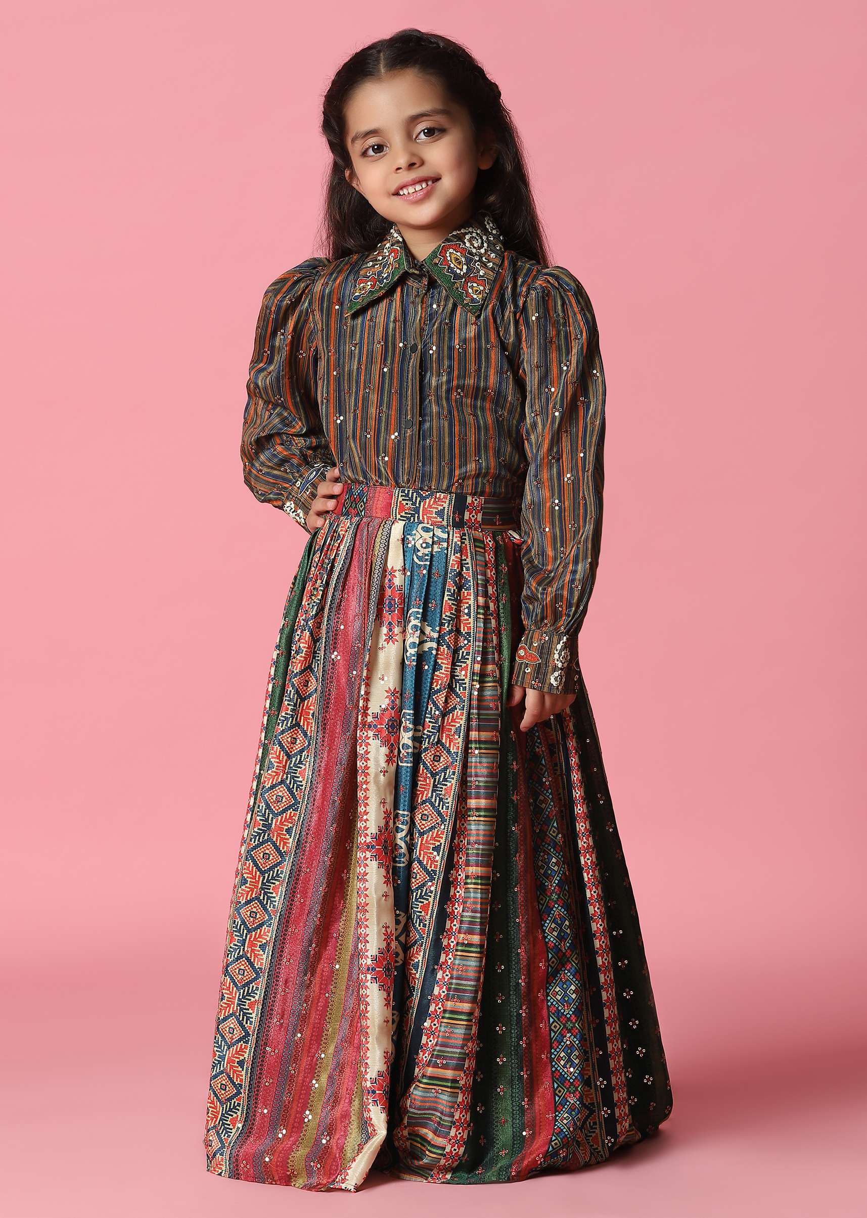 Elevate your little girl's wardrobe with this stunning multicolor skirt and top set. The set features a beautiful shirt collar design with sequin and threadwork embroidery that adds a touch... More Product Details