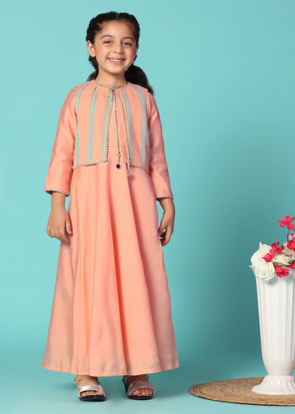 Kalki Peach Pink Printed Gown And Jacket Set In Cotton For Girls