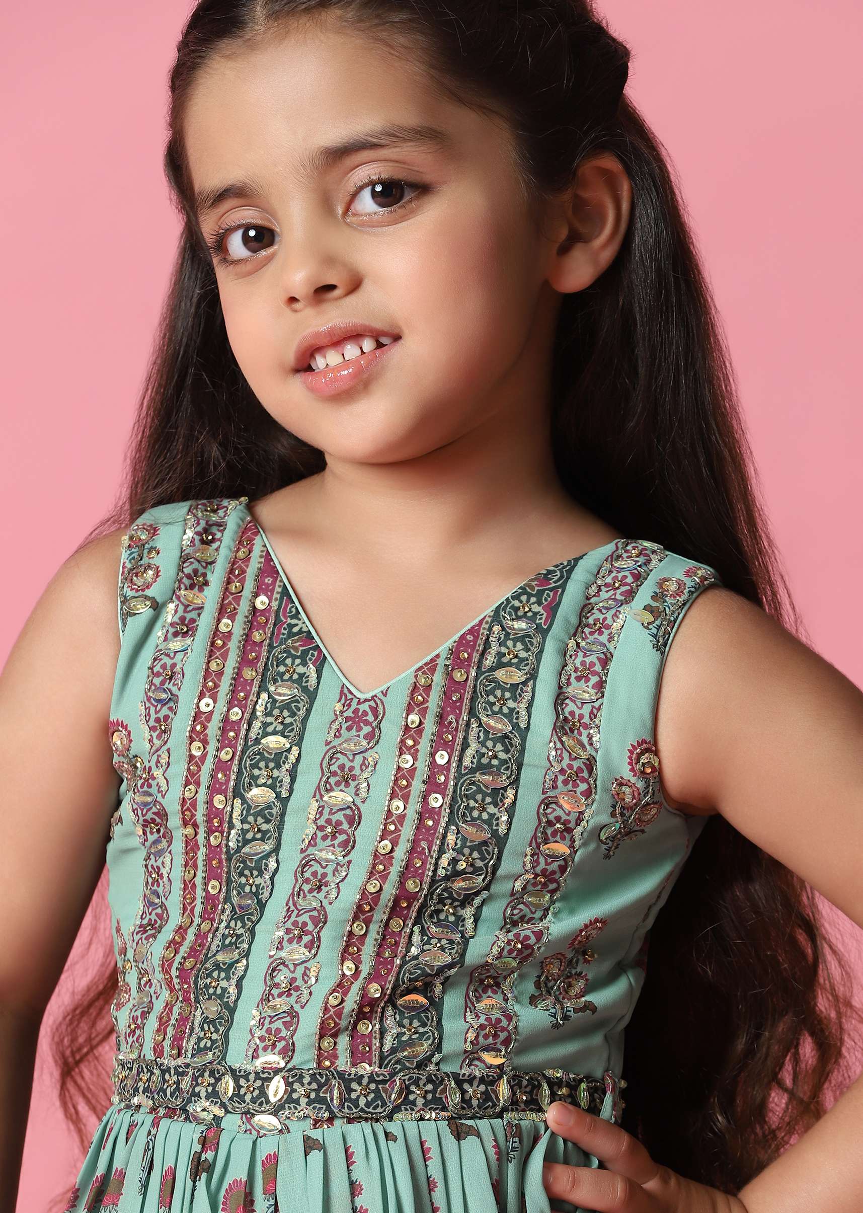 Add a pop of color to your little girl's wardrobe with this sea-green embroidered jumpsuit.The jumpsuit features a playful floral print all over, adding a touch of whimsy to the outfit.The upper part of the jumpsuit is adorned with intricate sequins and beads work, creating a glamorous and eye-catching look.The jumpsuit has a V-neckline and comes sleeveless.EVENT - The jumpsuit is perfect for festive celebrations, including Raksha Bandhan.Change folds regularly. Awarded as the Most Trusted Brand, we're delivering styles you love, just as promised.