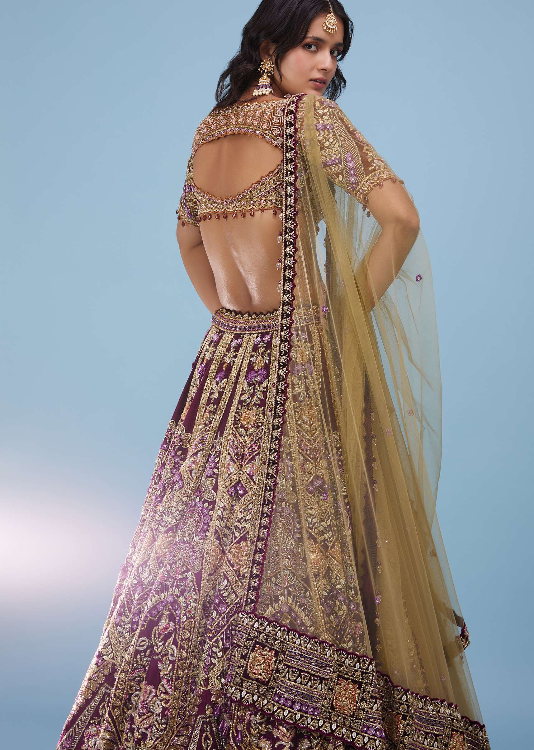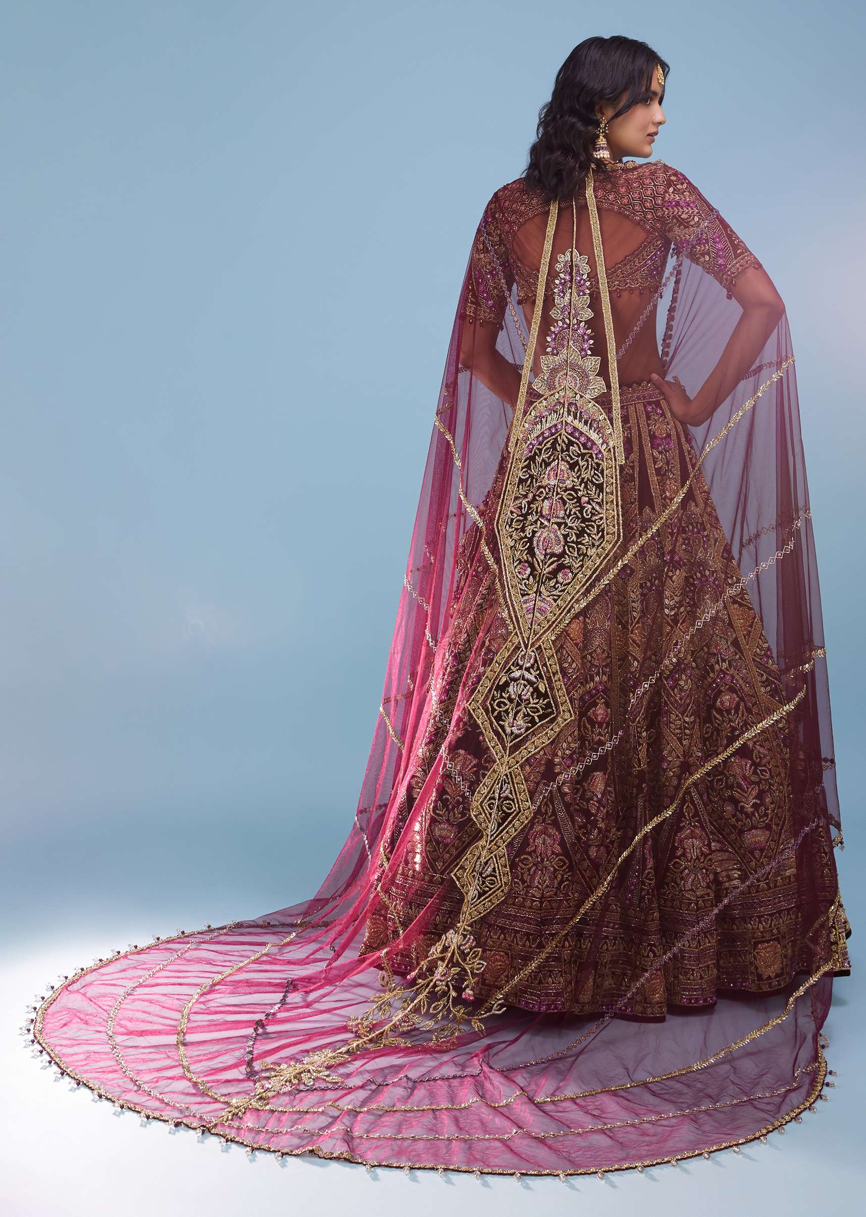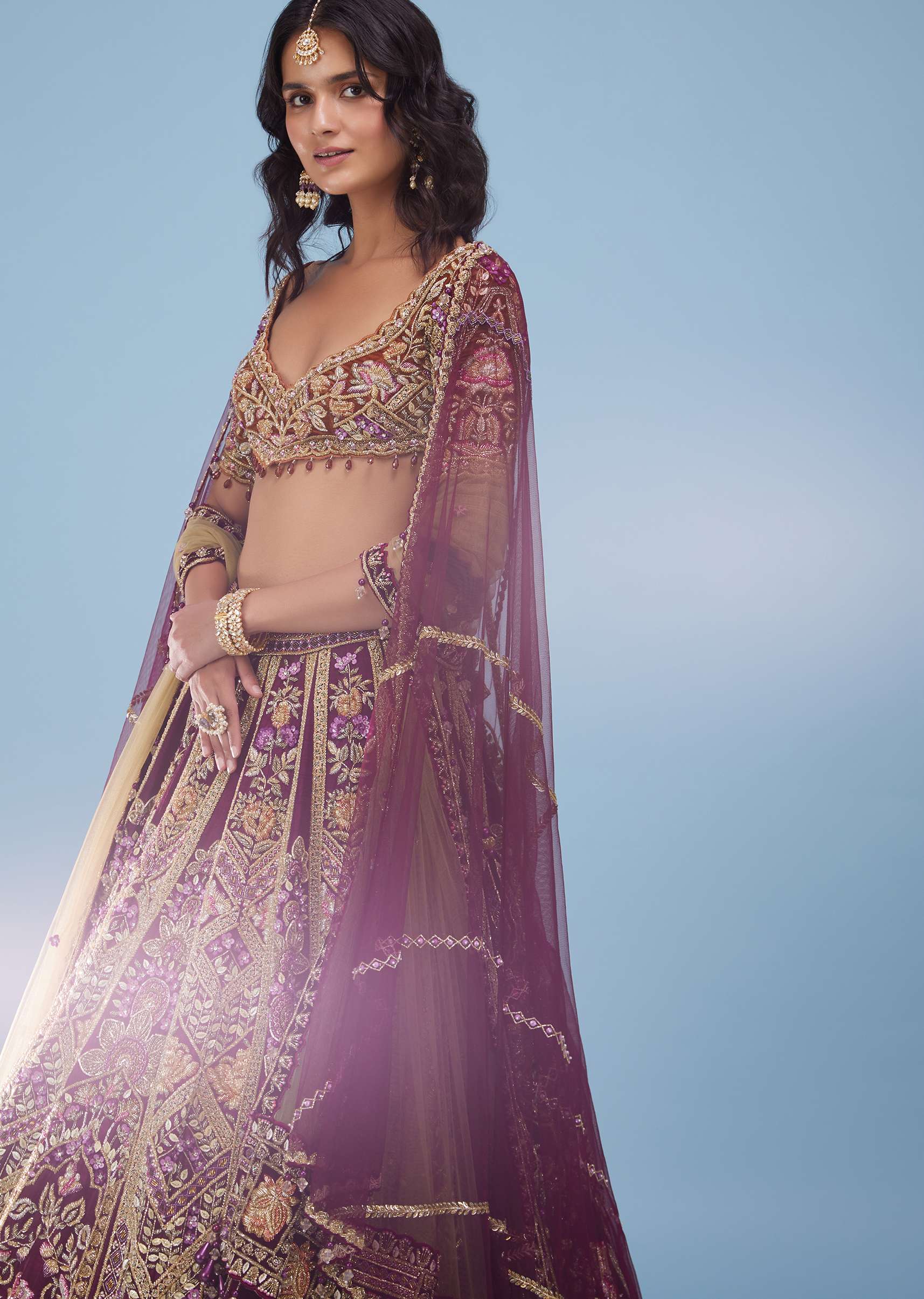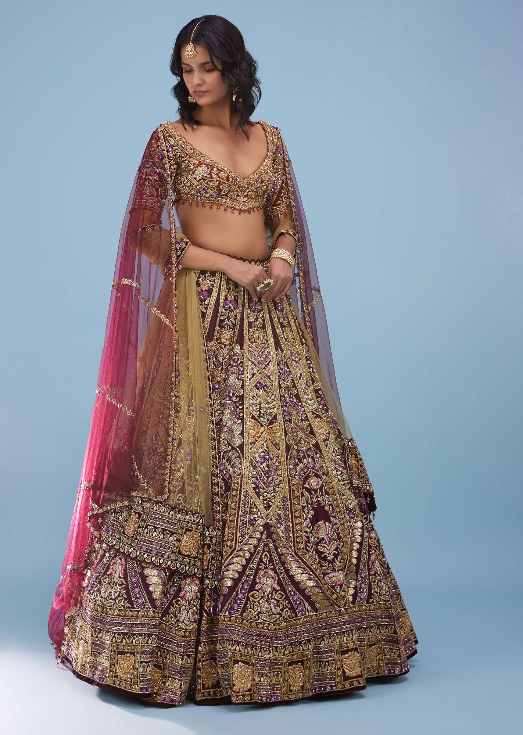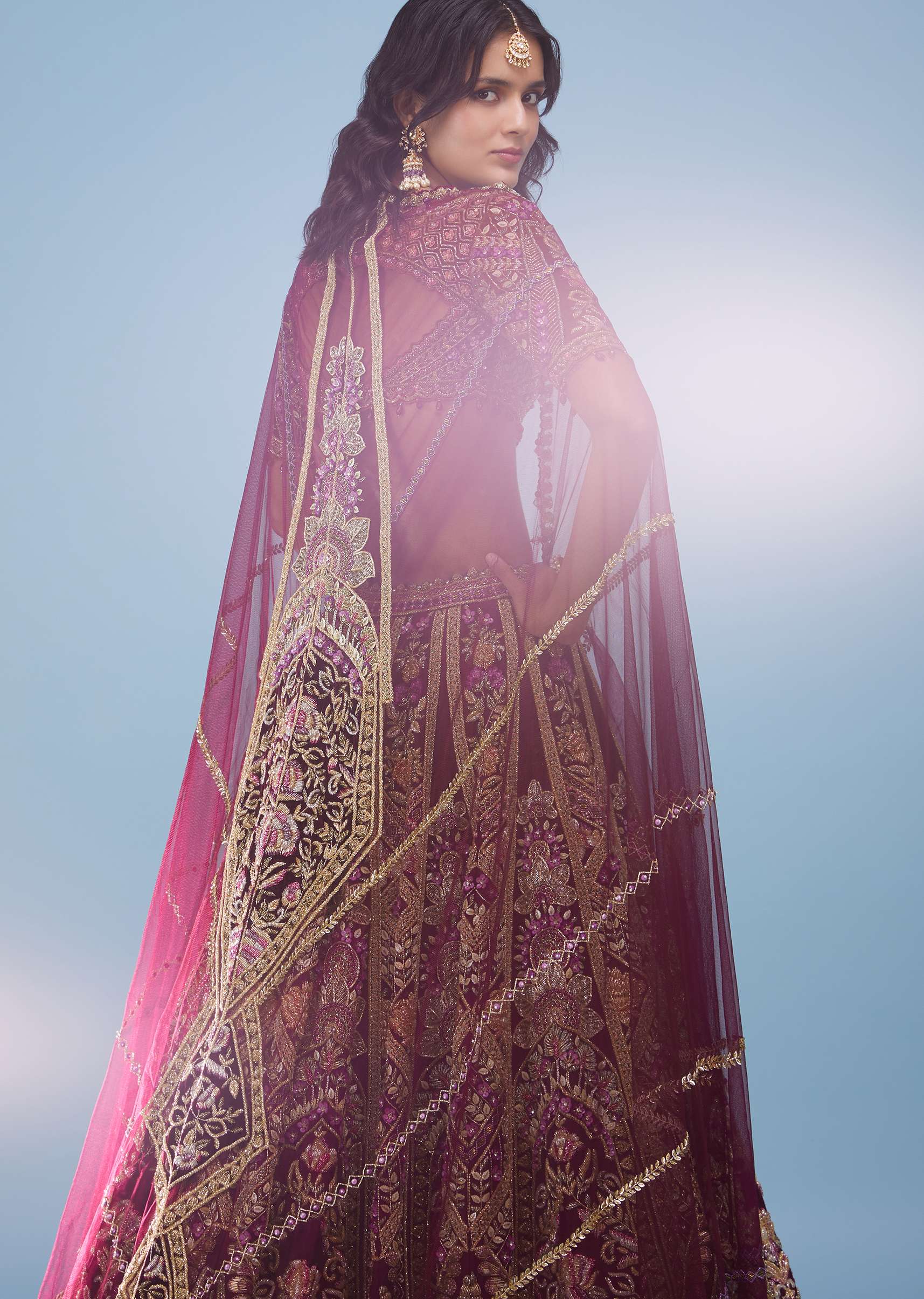 Wine Red Queenly Bridal Lehenga In Velvet With Heavy Floral Embroidery - NOOR 2022