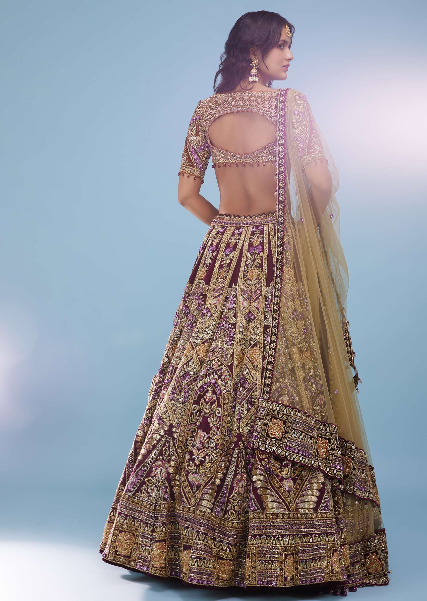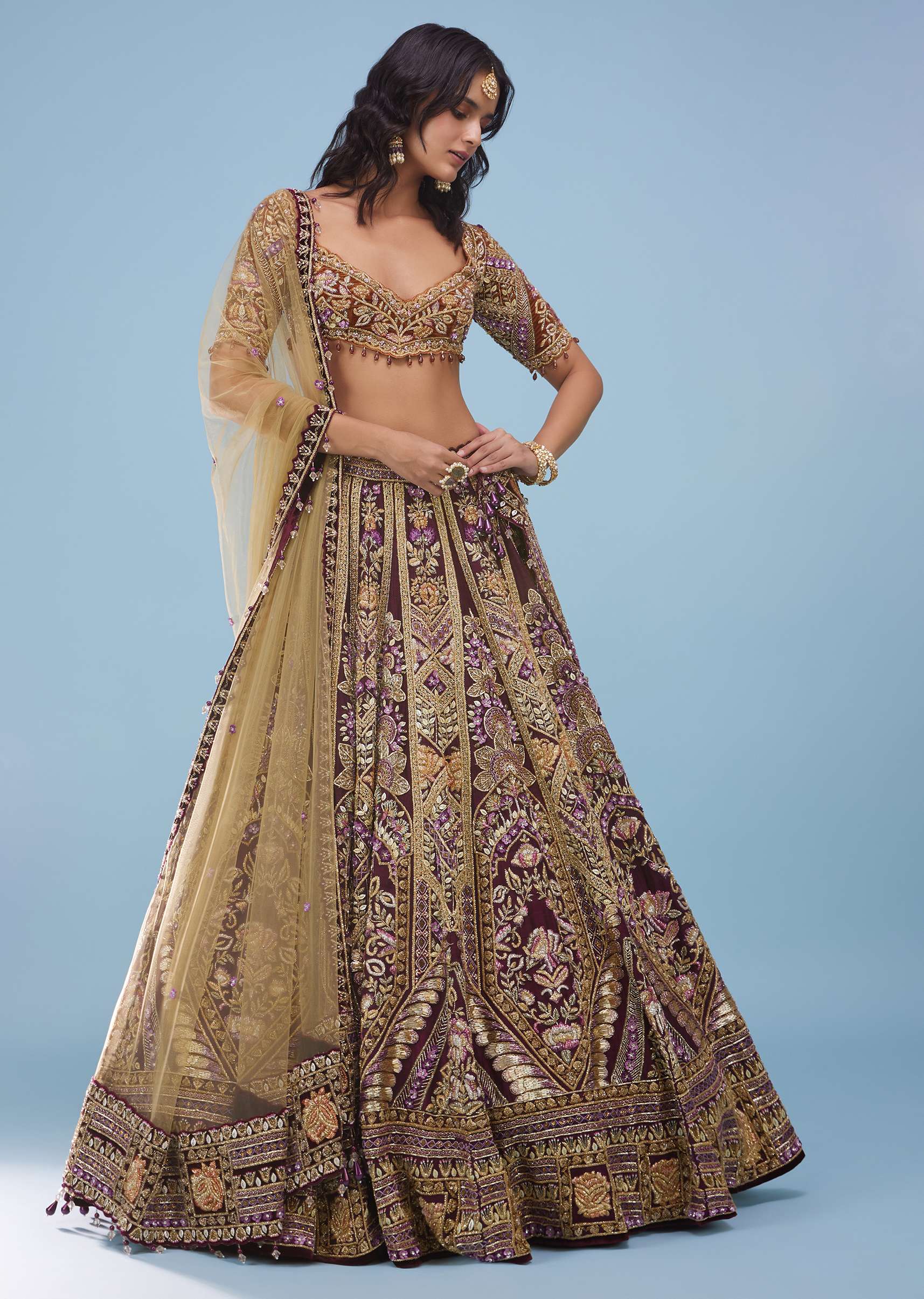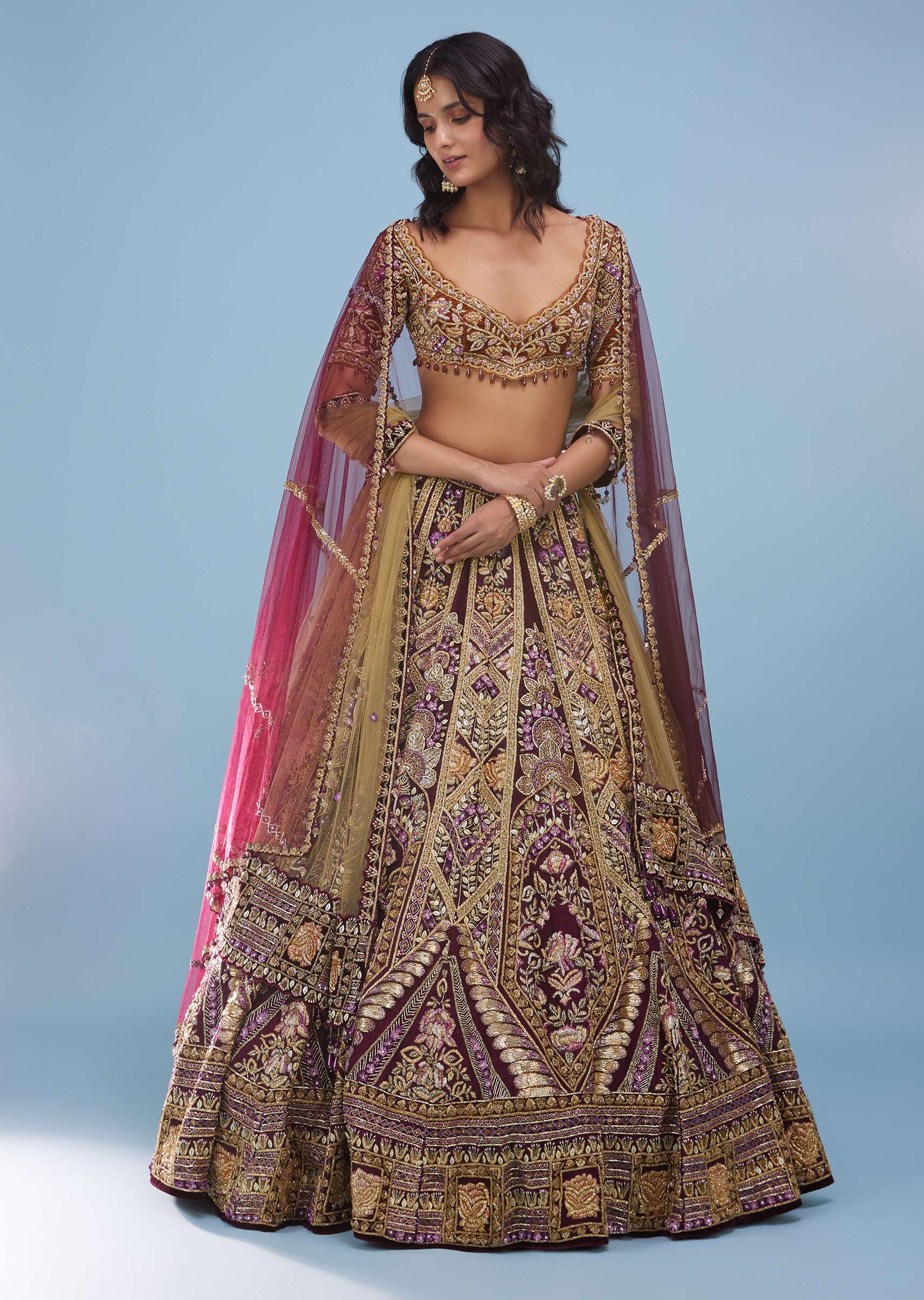Elevate your magnificent ethnic collection and revamp it with an infusion of details with this jaw-dropping wine-coloured lehenga set. The set has a lehenga, a blouse & 2 dupattas. A stunner lehenga tailored in velvet paneled in intricate embroidery of floral and geometric motifs in zardosi, beads, stones & 3D flowers. The blouse is beautifully stitched in a sweetheart neckline with elbow sleeves and embroidery all over on velvet. The net dupattas have detailed borders with buttis all over in contrasting colours of beige & wine for you to drape as per your choice. The blouse comes with soft padding and the lehenga has a cancan attached. Awarded As The Most Trusted Brand We'Re Delivering Styles You Love Just As Promised.