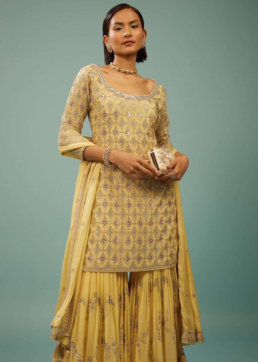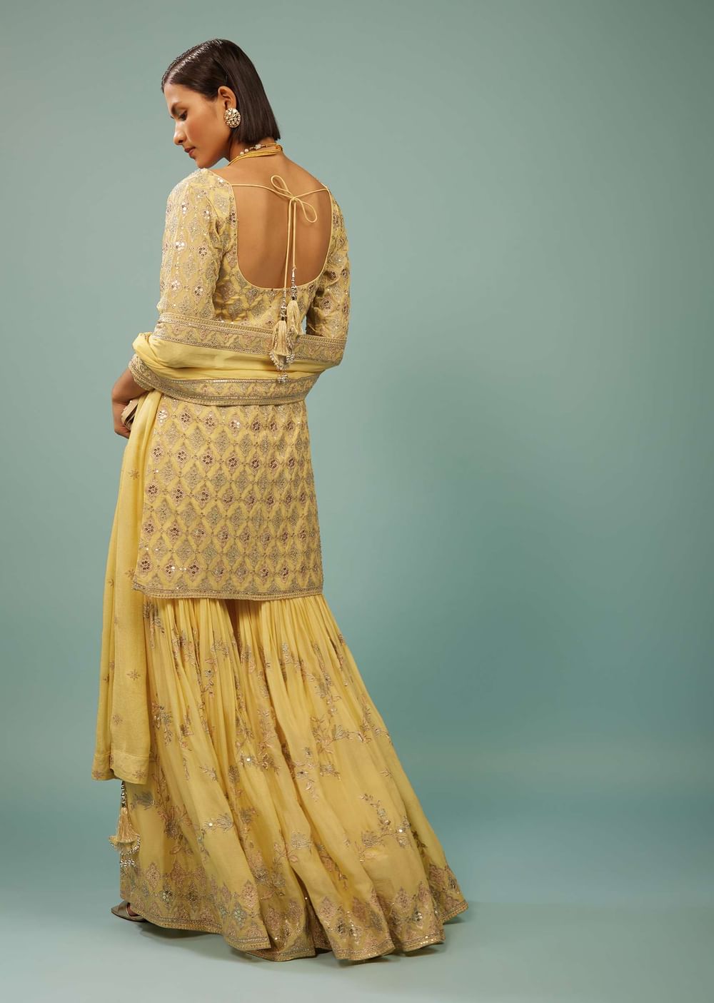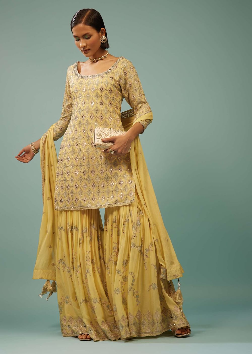 Kalki yellow cream sharara suit set with embroidery in georgette.The kurta comes in a round neckline, embroidered yoke mirrors along with a back scoop neckline with tassel dori, and 3/4... More Product Details