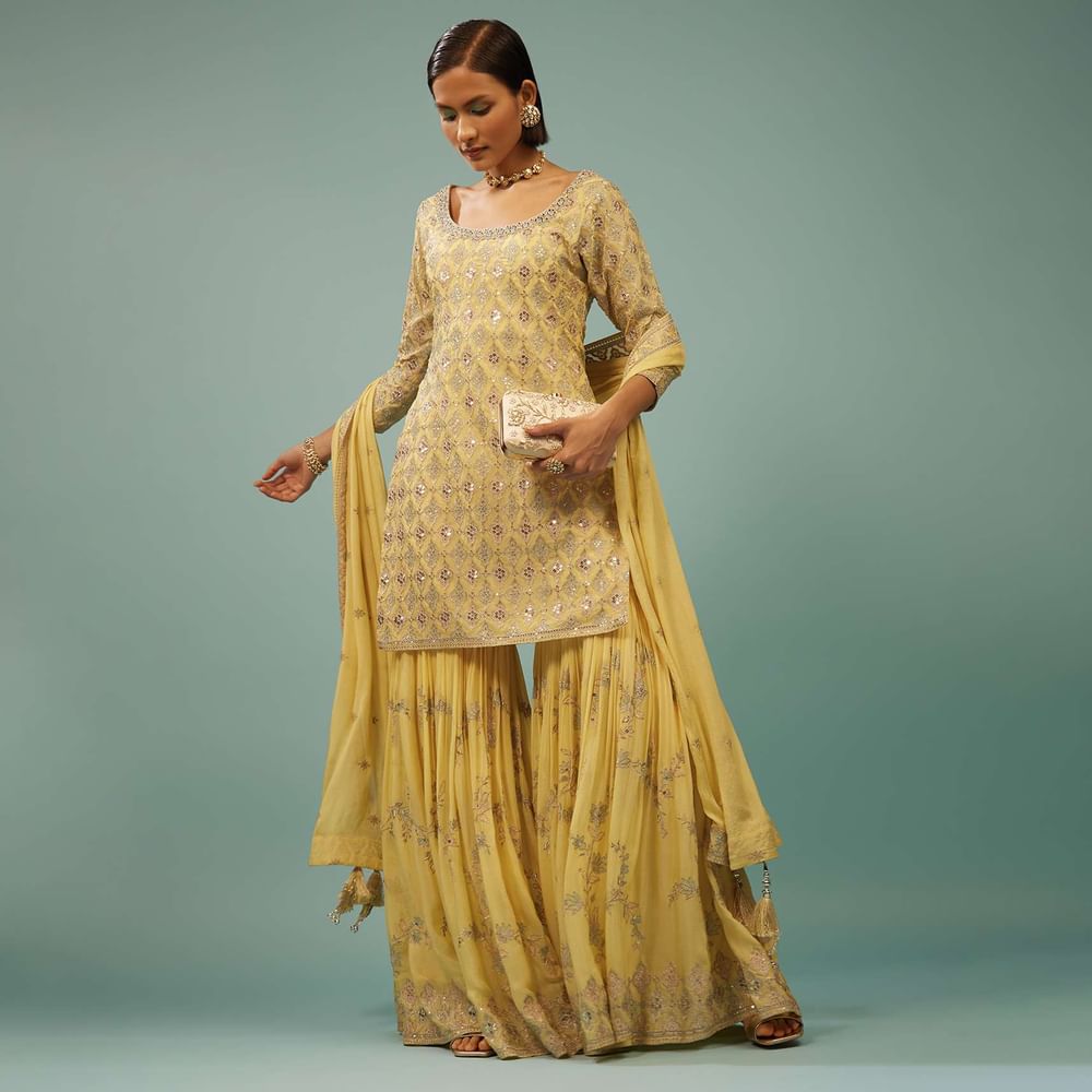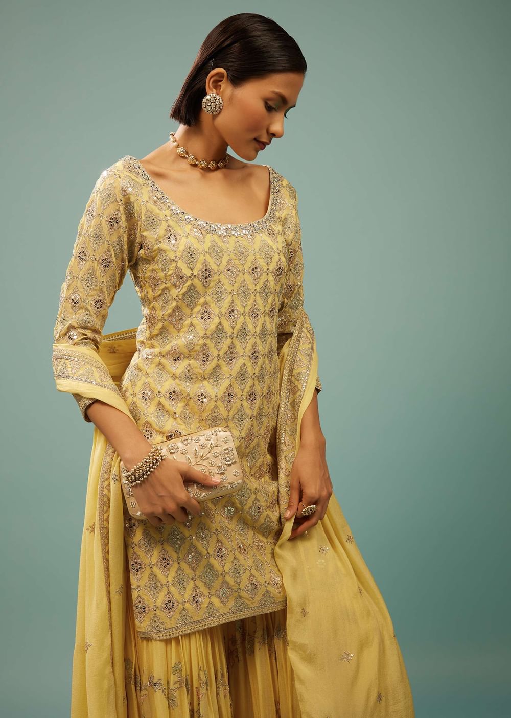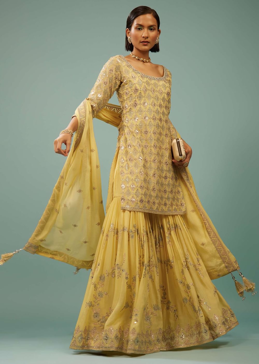 Kalki yellow cream sharara suit set with embroidery in georgette.The kurta comes in a round neckline, embroidered yoke mirrors along with a back scoop neckline with tassel dori, and 3/4... More Product Details