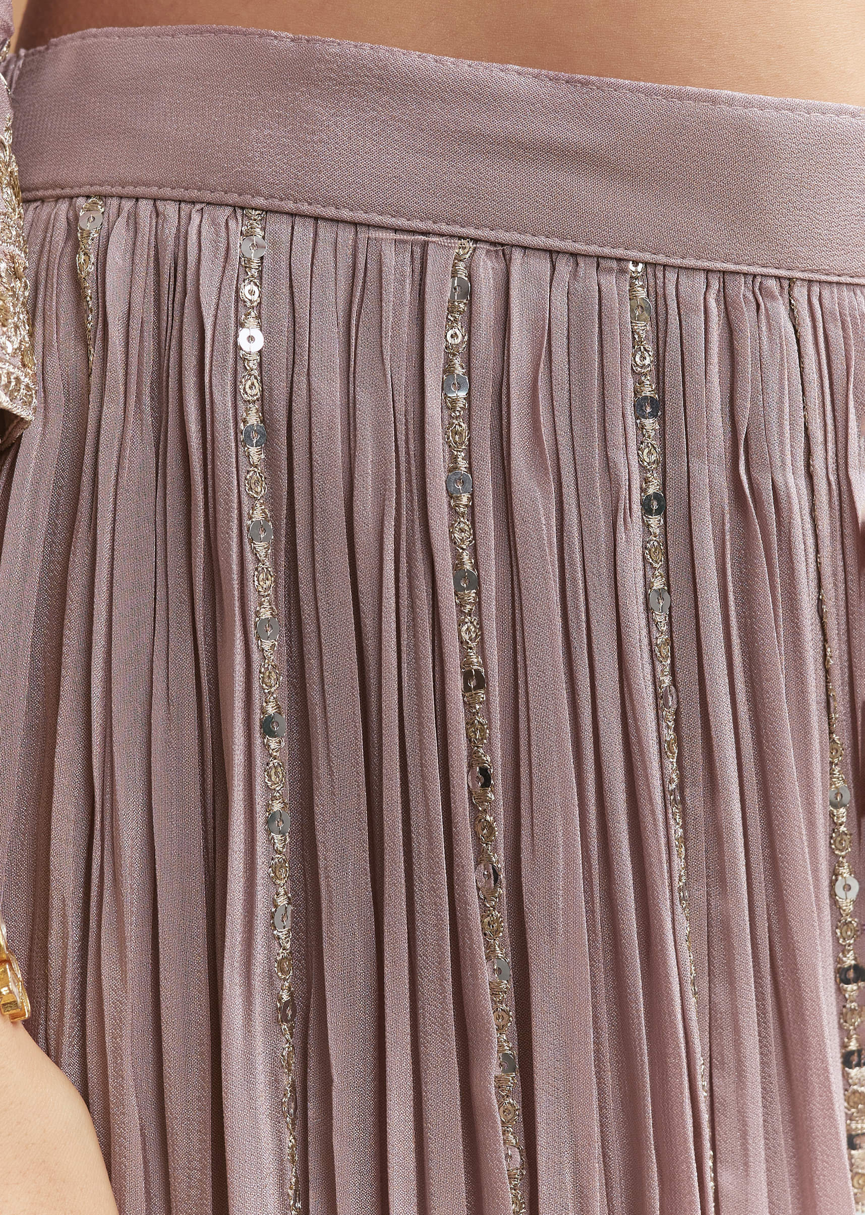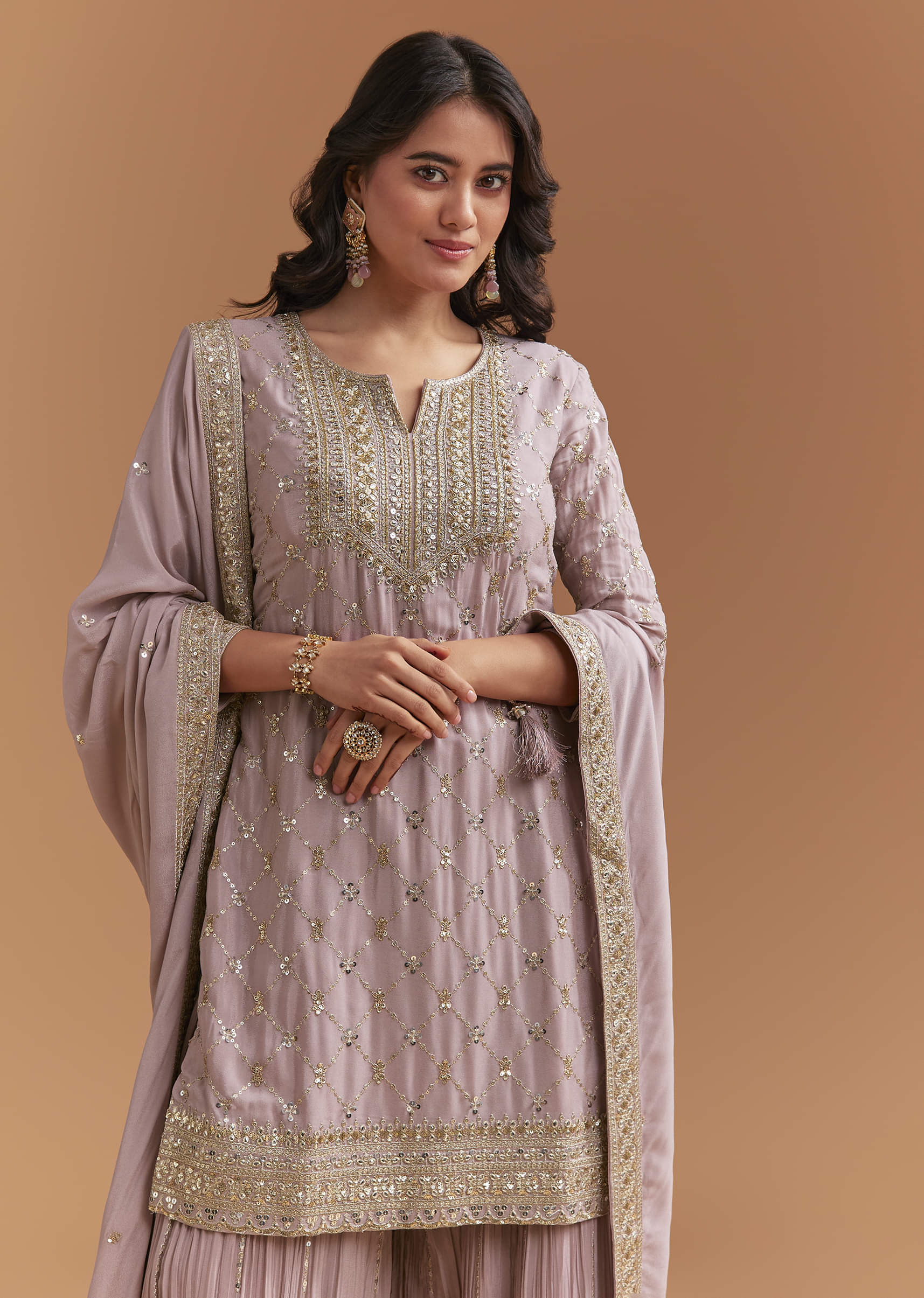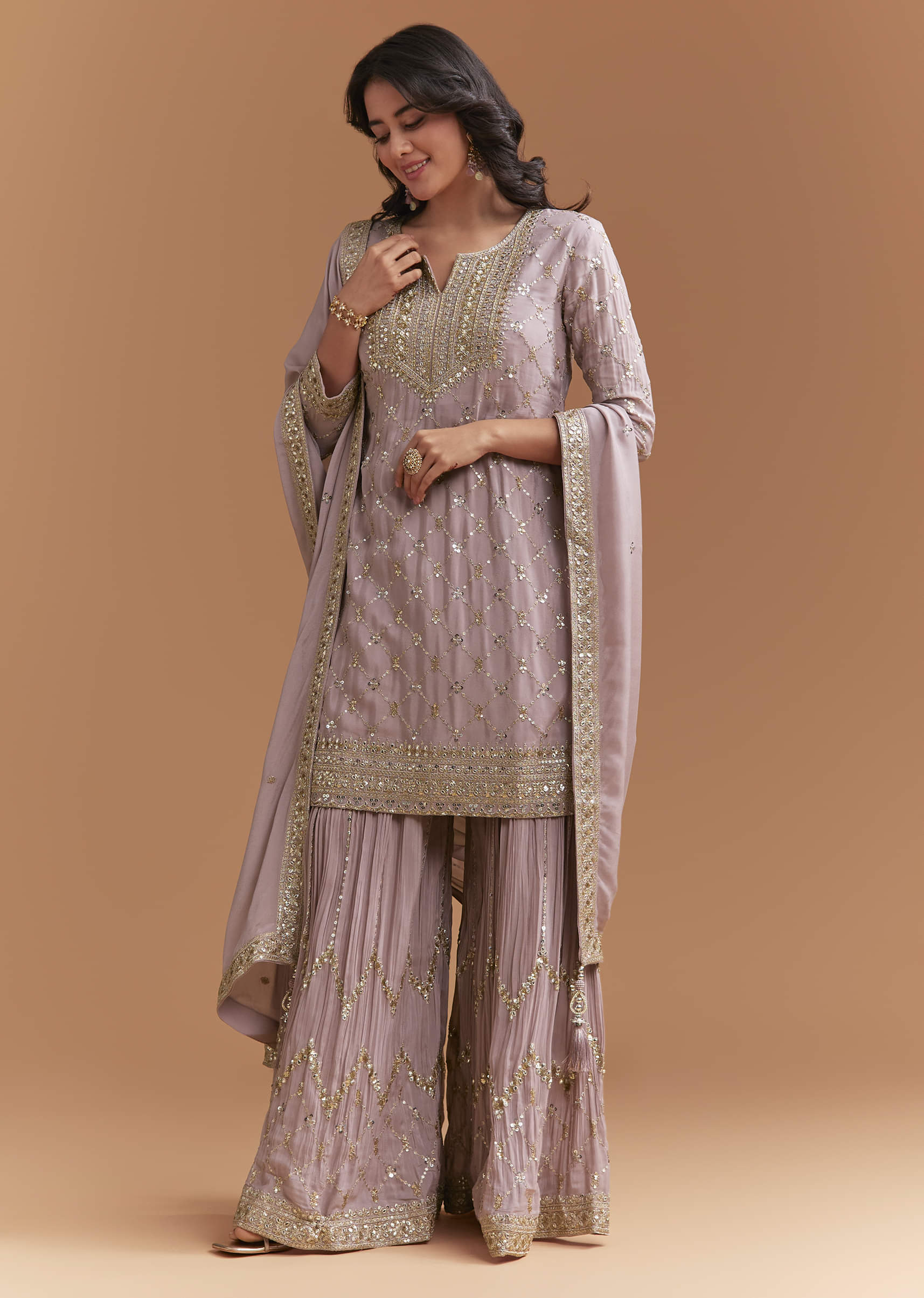 A gentle palette keeps things elegant as this lavender chinon palazzo suit adds just enough shimmer in motion. Sequins on the kurta create a fine, even sparkle that reads refined up close. It fits right into festive celebrations and feels at home at a mehendi, sangeet or engagement event. Please note: The standard length of the palazzo will be 44 inches. Awarded as the Most Trusted Brand, we're delivering styles you love, just as promised.