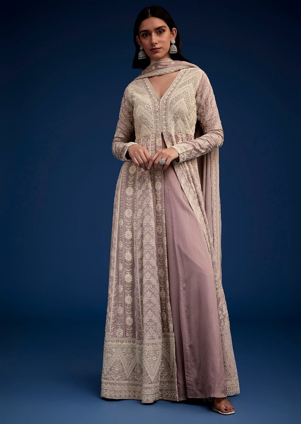 Exude Ethereal Charm In This Lavender Kurta Palazzo Set Beautifully Adorned With Intricate Embroidery And Delicate Detailing. The Flowy Silhouette Paired With The Soft Dupatta Creates A Graceful And Sophisticated... More Product Details
