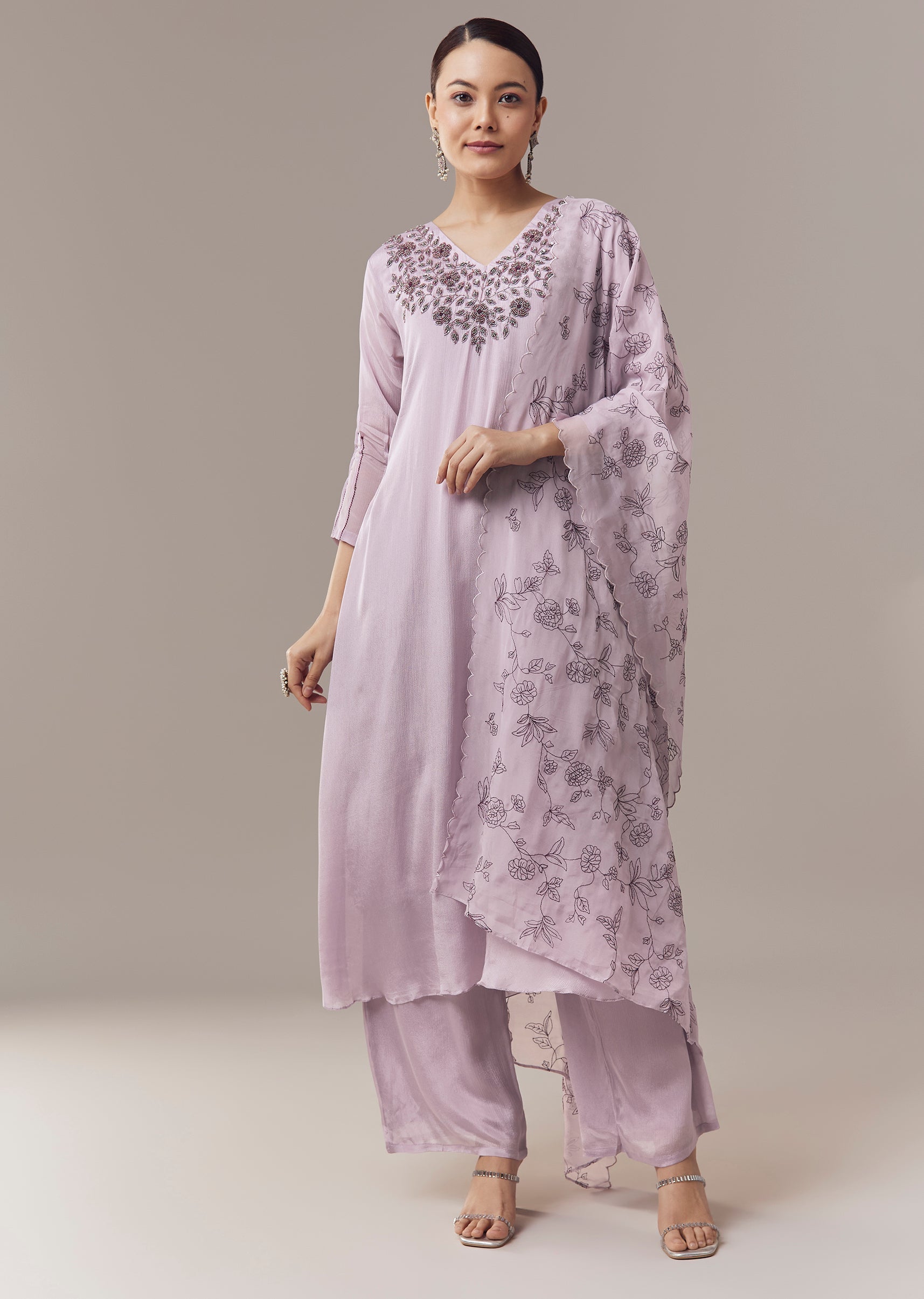 Soft and elegant, this lavender kurta set is designed in a refined Pakistani style for casual celebrations and day events. Crafted in lightweight chinon fabric, the kurta is enhanced with delicate beads, sequins, and cut dana embroidery that adds subtle sparkle and texture. Featuring three fourth sleeves and a V neckline, it comes paired with a coordinated dupatta, creating a graceful and comfortable ensemble for effortless style. Awarded as the Most Trusted Brand, we're delivering styles you love, just as promised.