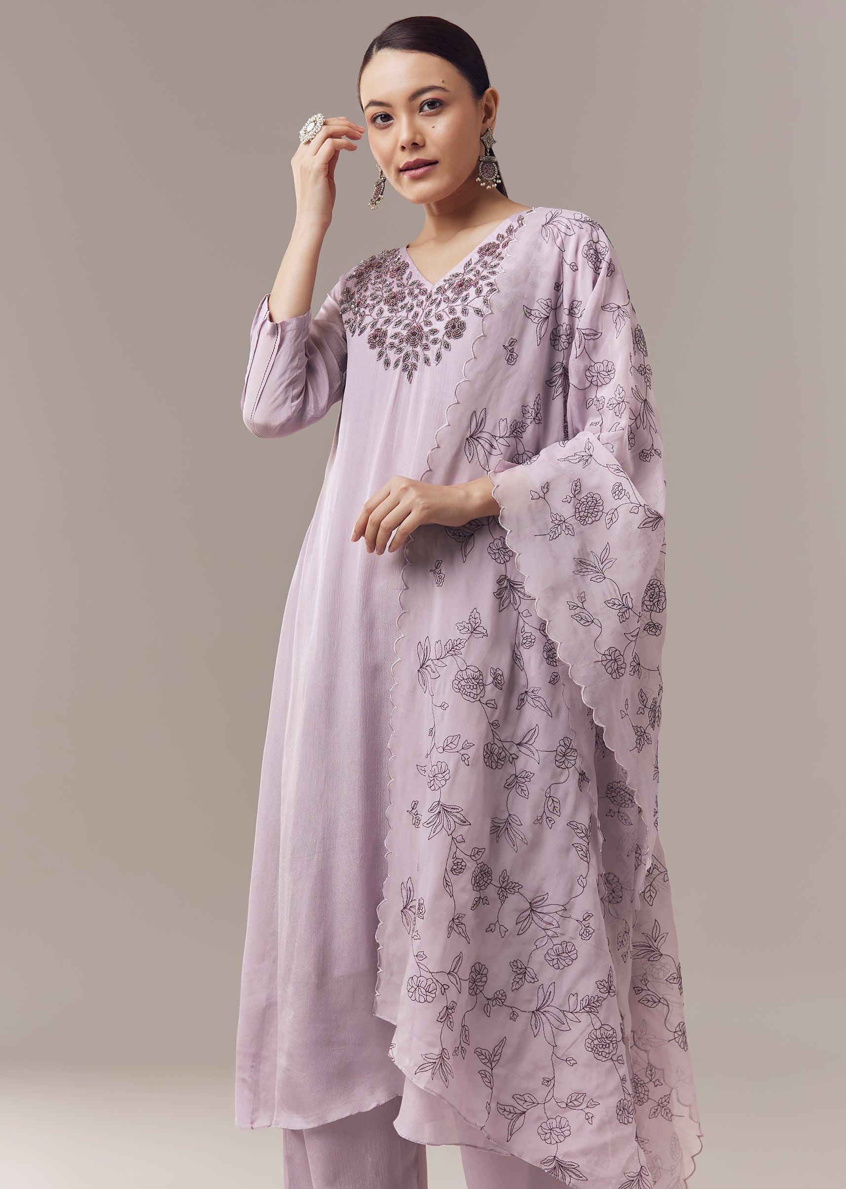 Lavender Pakistani Style Kurta Set With Beads Sequins And Cut Dana Work And Dupatta