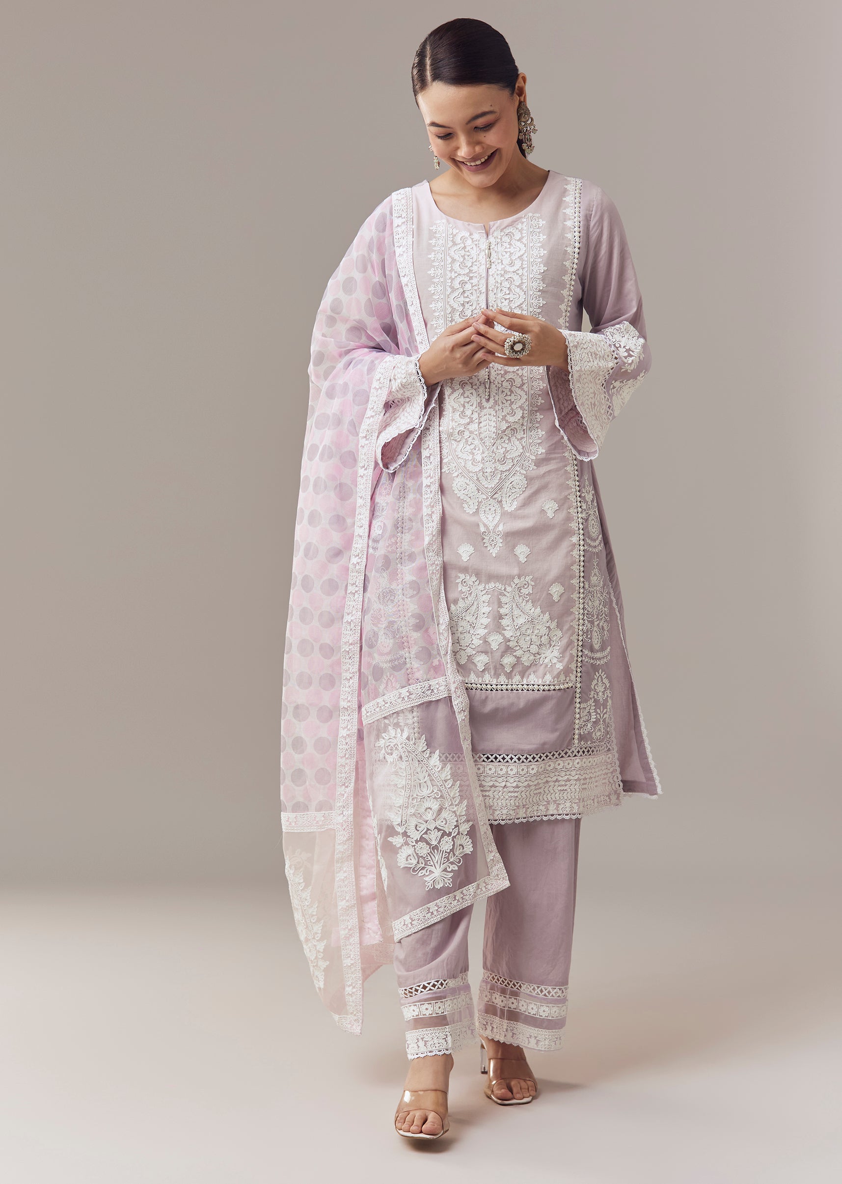 Lavender Pakistani Style Kurta Set With Thread Work And Dupatta