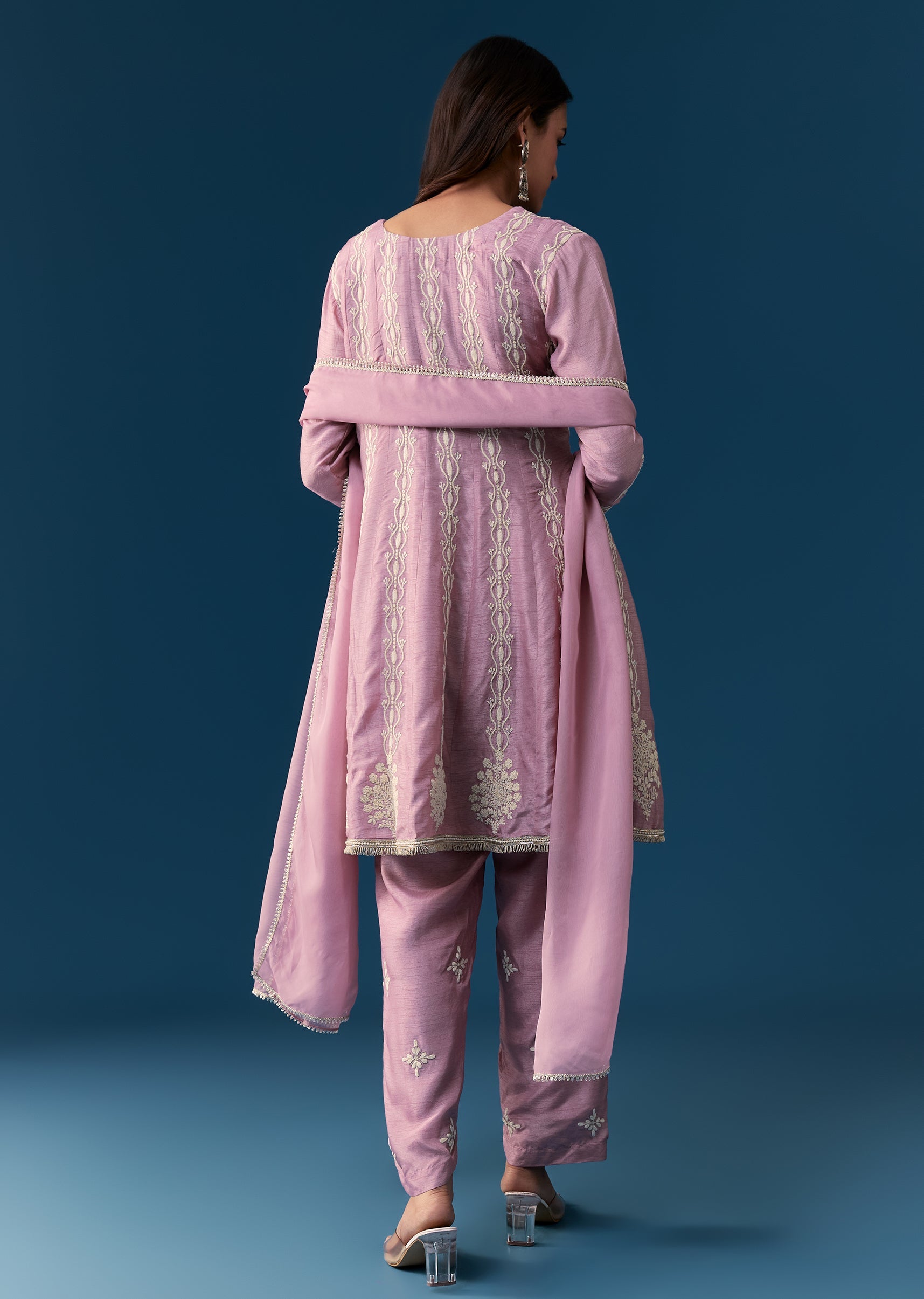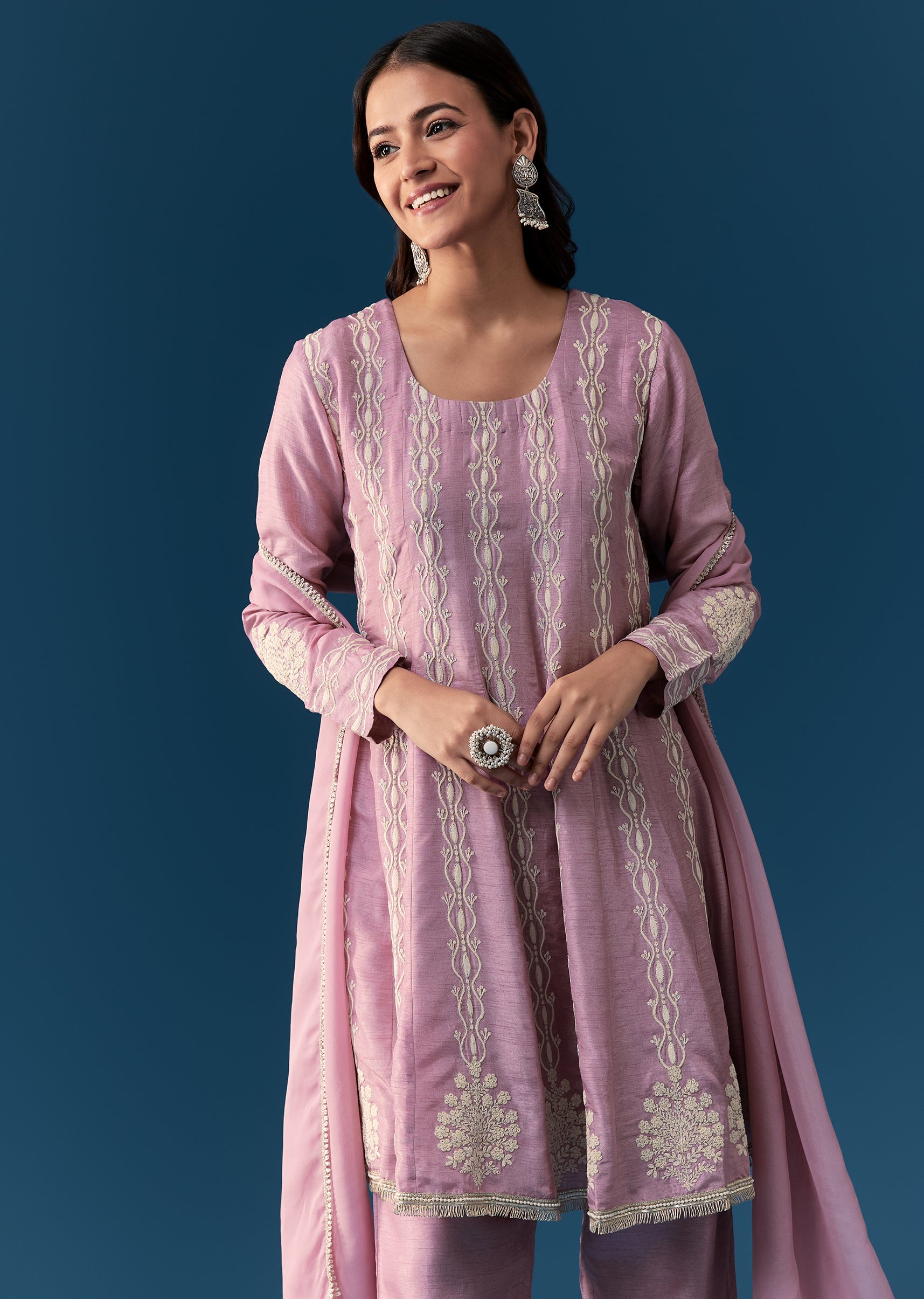 This lavender pastel anarkali suit is crafted in luxurious silk with exquisite thread work embroidery. The suit features full sleeves and a classic round neckline for a timeless look. Designed with a side zip closure on the top, it combines elegance with easy wearability. Enhanced with a coordinating dupatta, this ensemble is perfect for festive occasions and formal gatherings. Awarded as the Most Trusted Brand, we're delivering styles you love, just as promised.