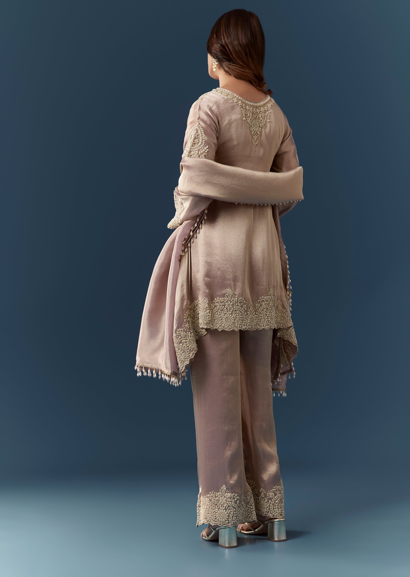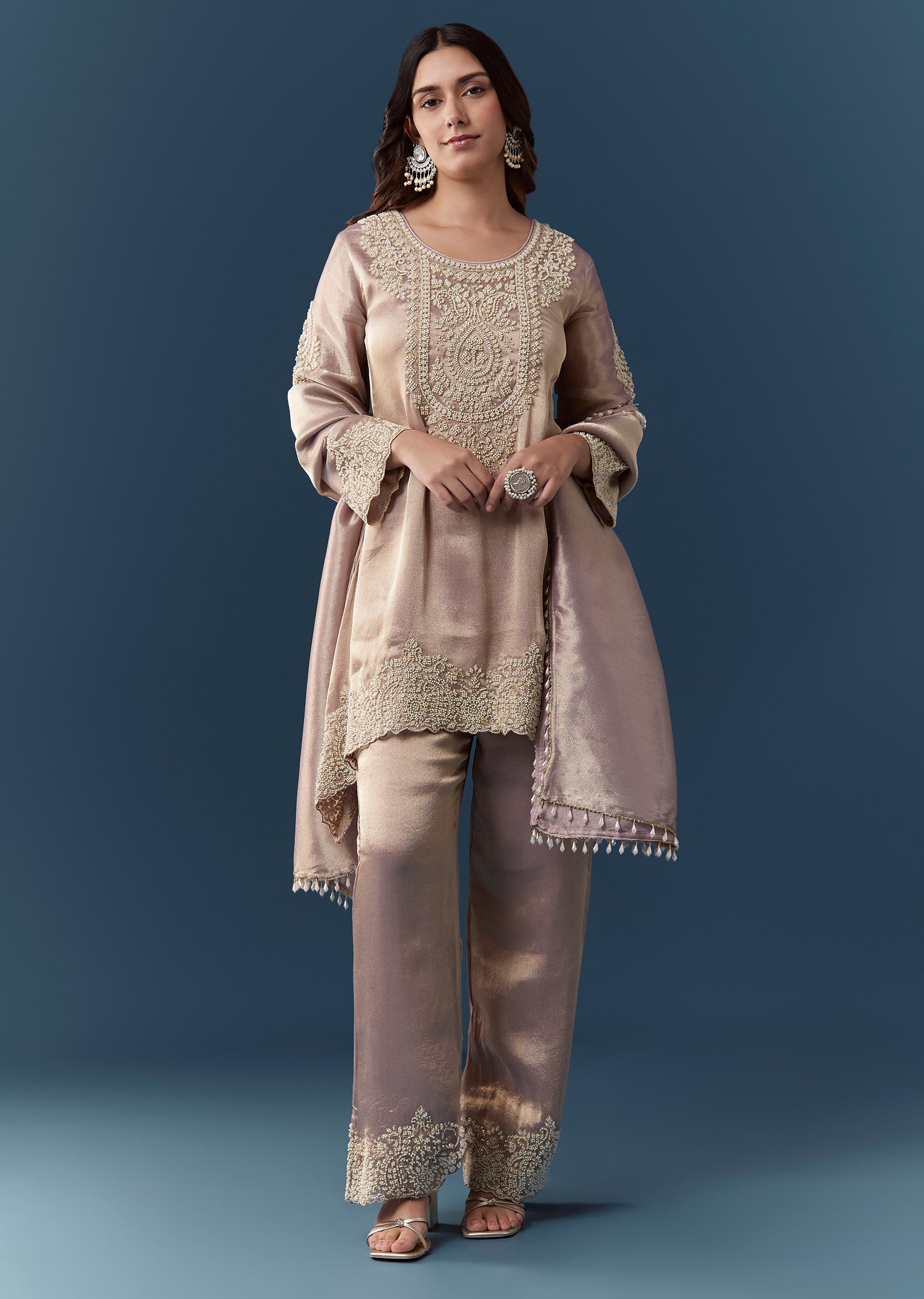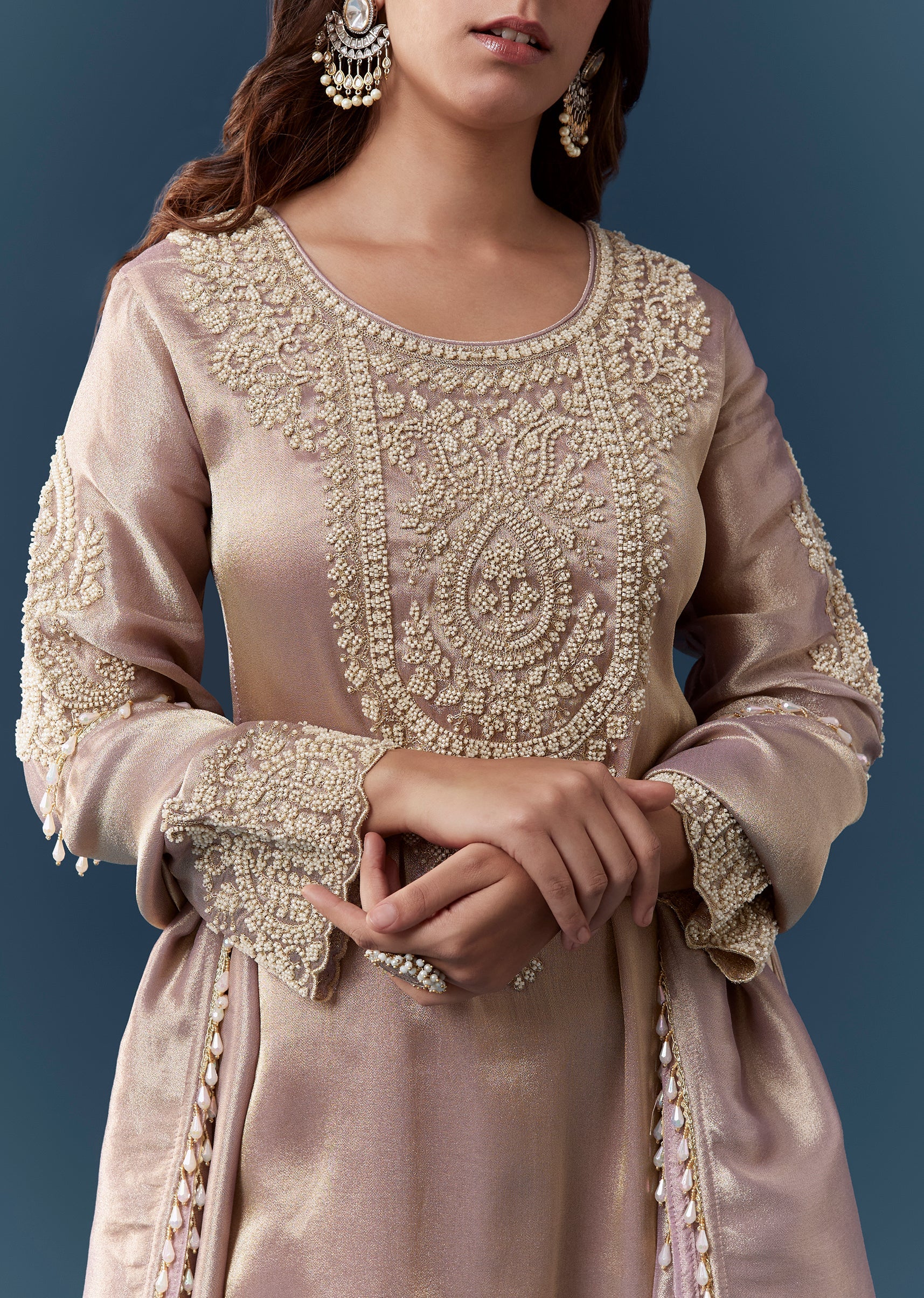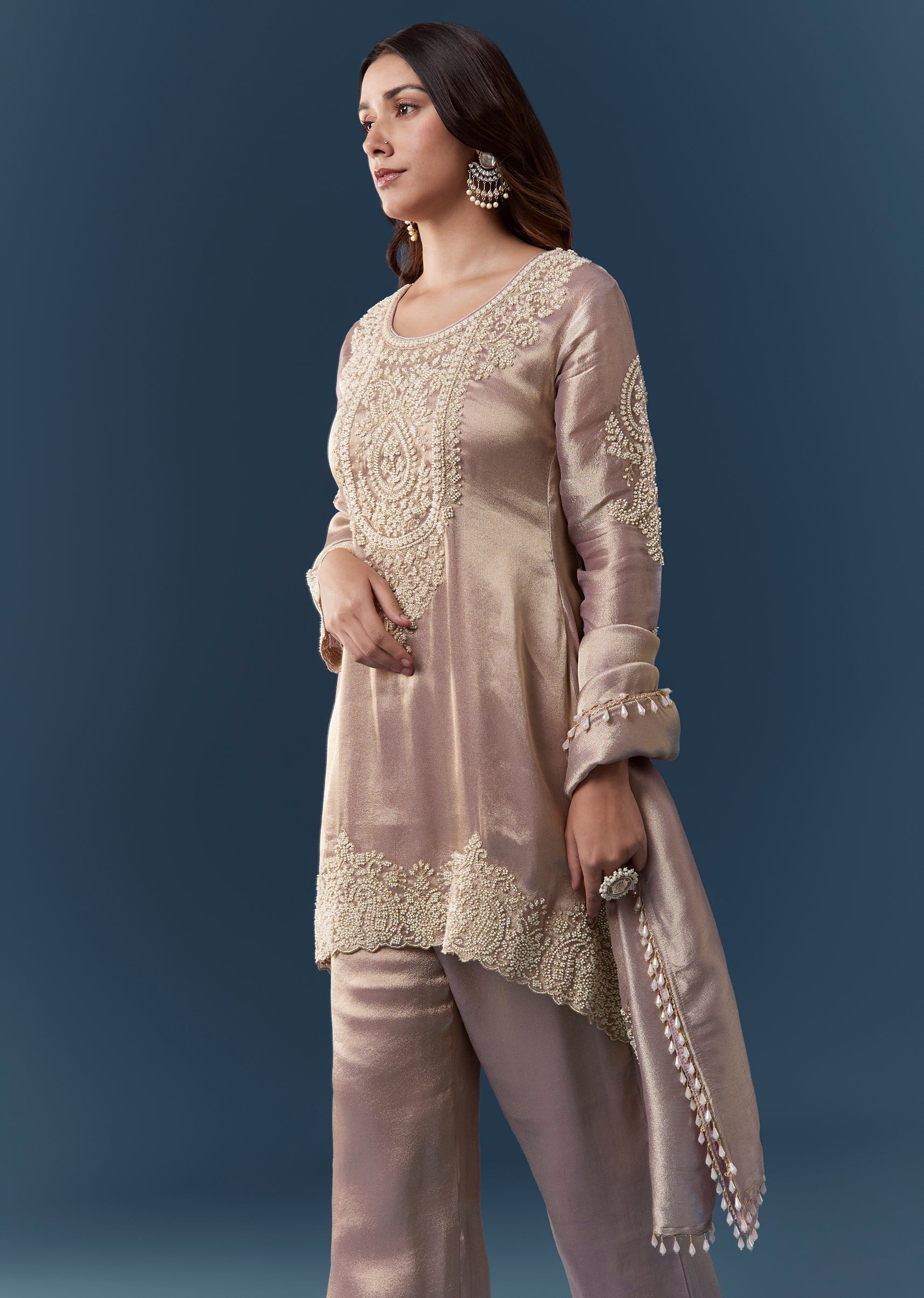 Elevate your festive look with this lavender tissue kurta set beautifully detailed with moti embellishments, delicate cut dana accents, and a practical kurta pocket that adds a modern touch. The... More Product Details