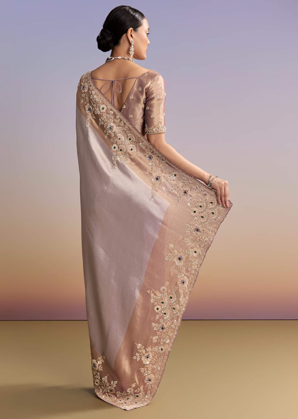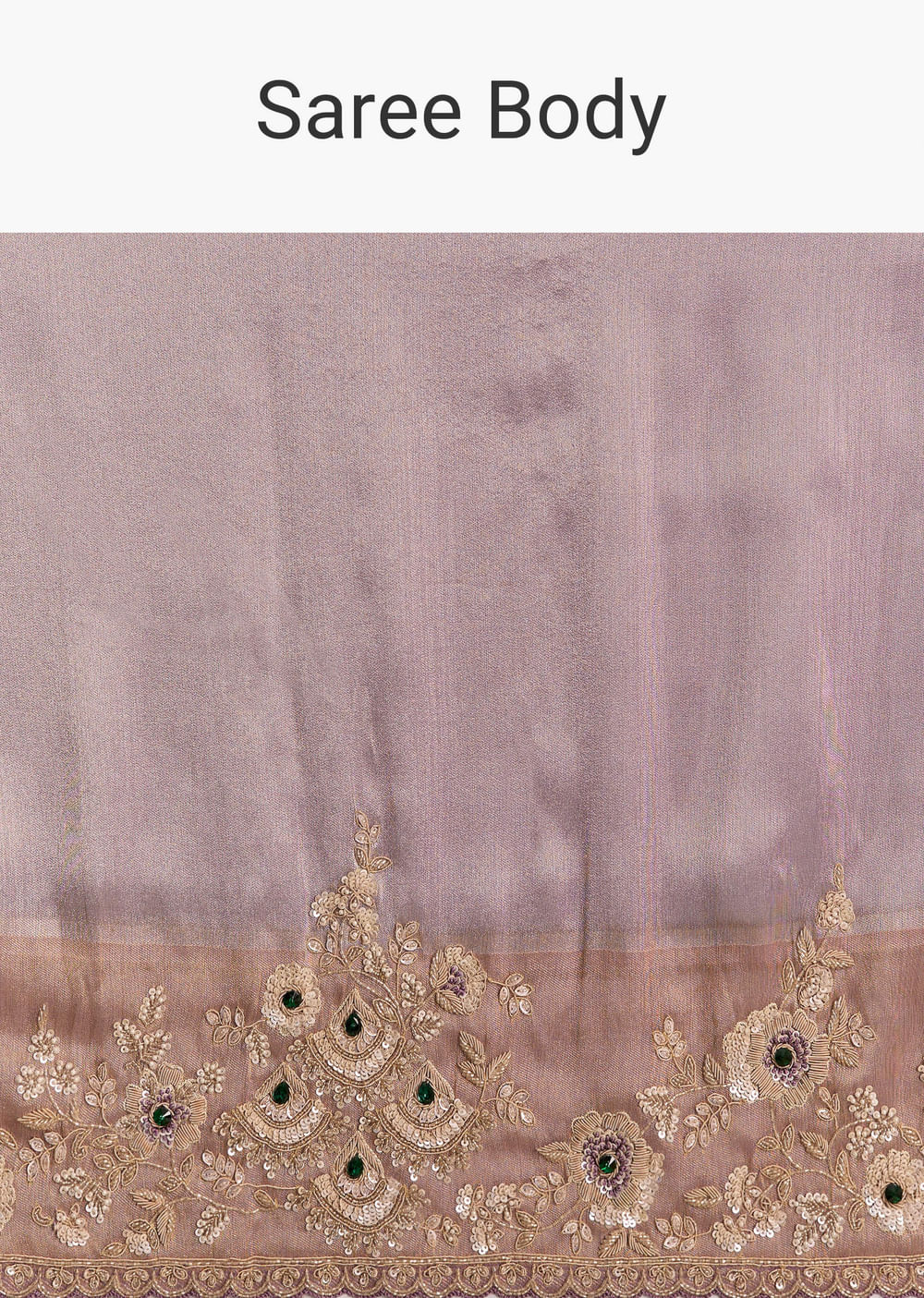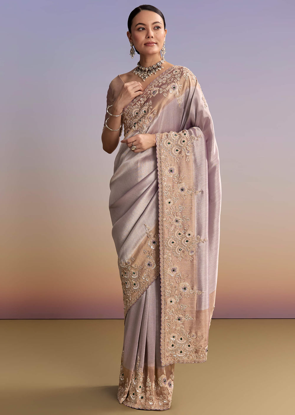Lavender Tissue Embroidered Saree With Zari Border And Bead Work