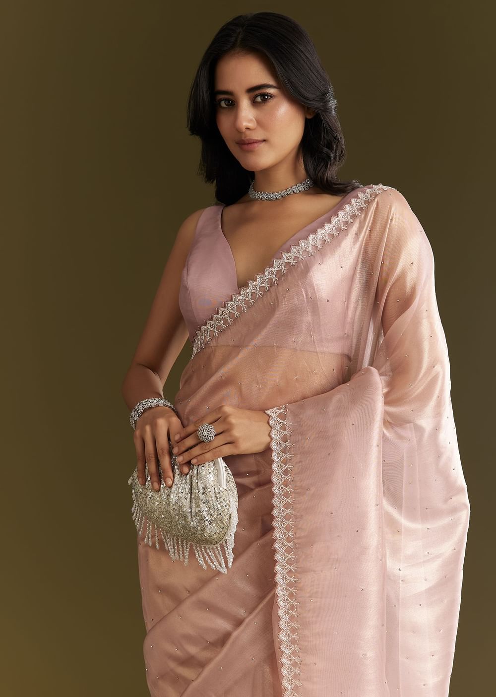 A saree dipped in twilight lavender, shimmering all over with stones and scalloped in cutdana—this piece is poetry in pastel and shine. Awarded as the Most Trusted Brand, we're delivering styles you love, just as promised.