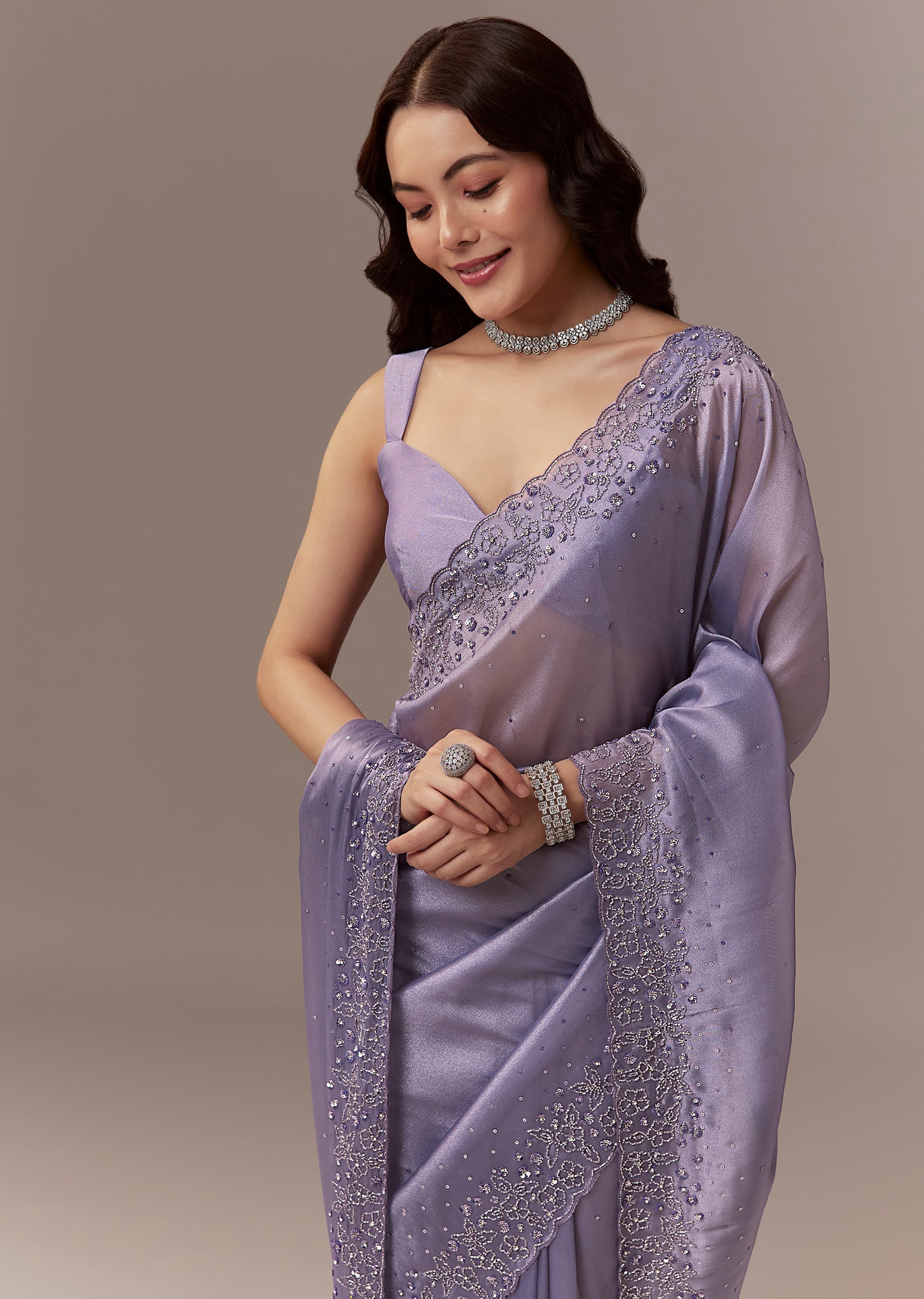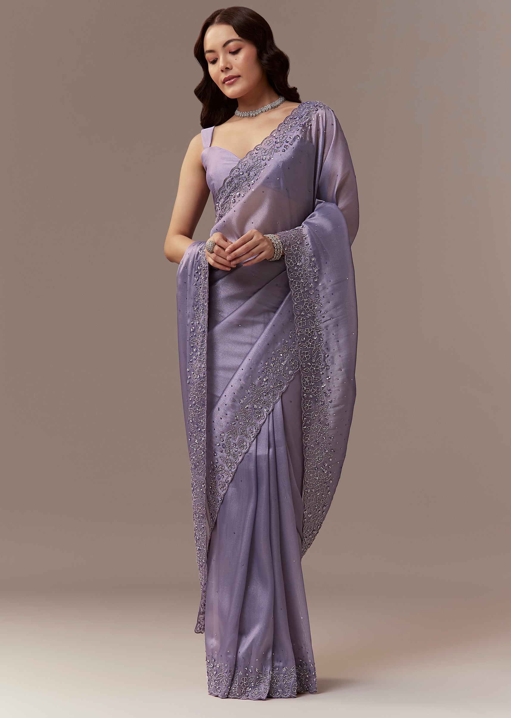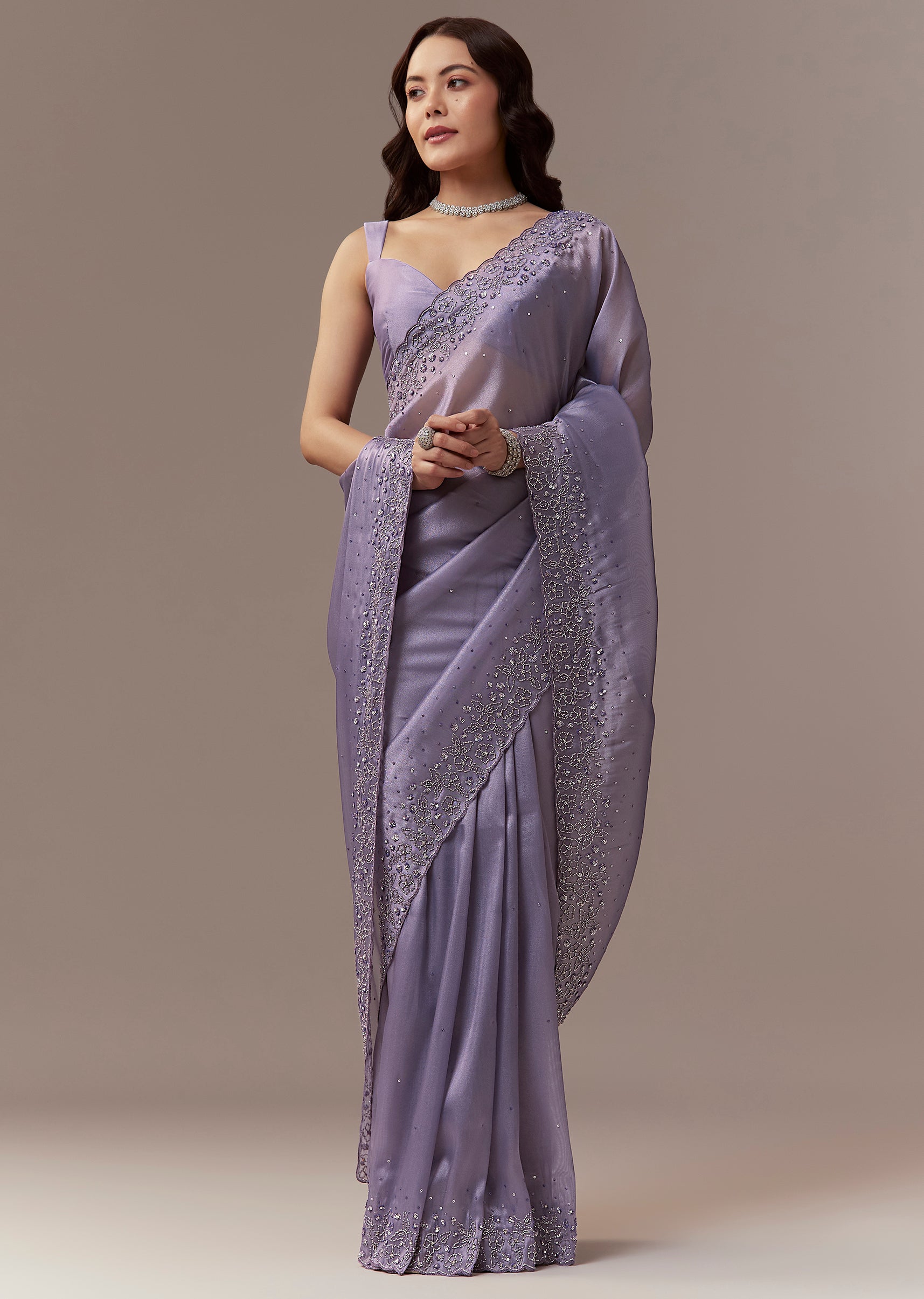Soft elegant and festive this lavender tissue saree is perfect for sangeet celebrations as a wedding guest. The pastel hue is enhanced with a scalloped border embroidered with cutdana and sequins creating a delicate shimmer and refined look. The saree comes with unstitched blouse fabric allowing a customized and comfortable fit. Ideal for evening functions it exudes grace sophistication and celebration ready charm. Awarded as the Most Trusted Brand, we're delivering styles you love, just as promised.
