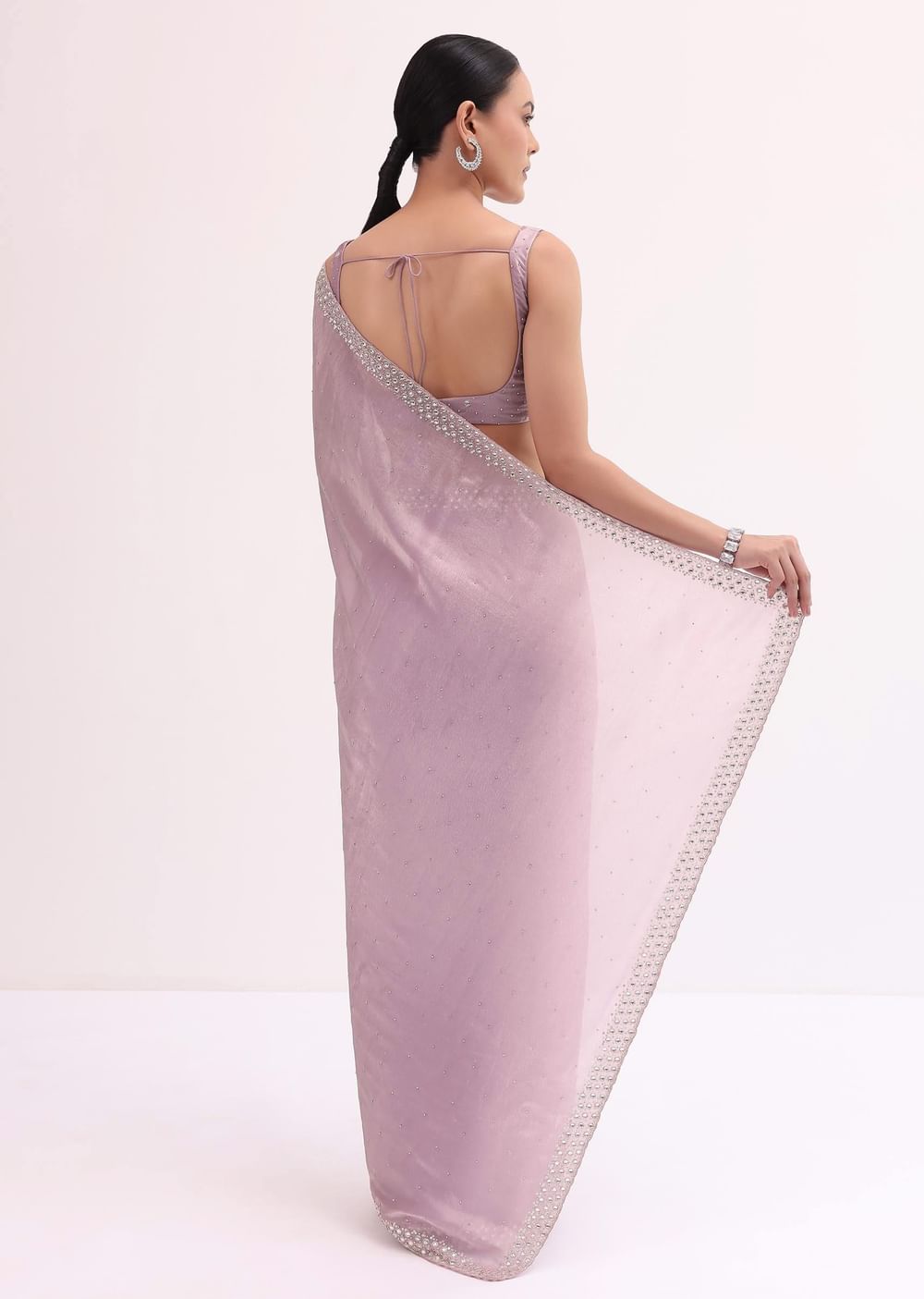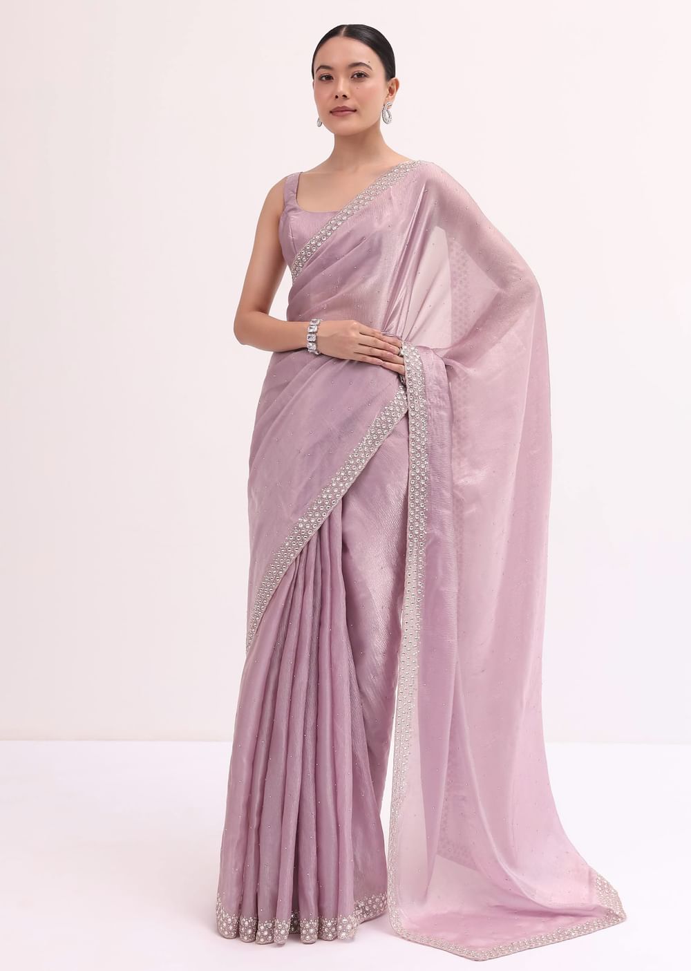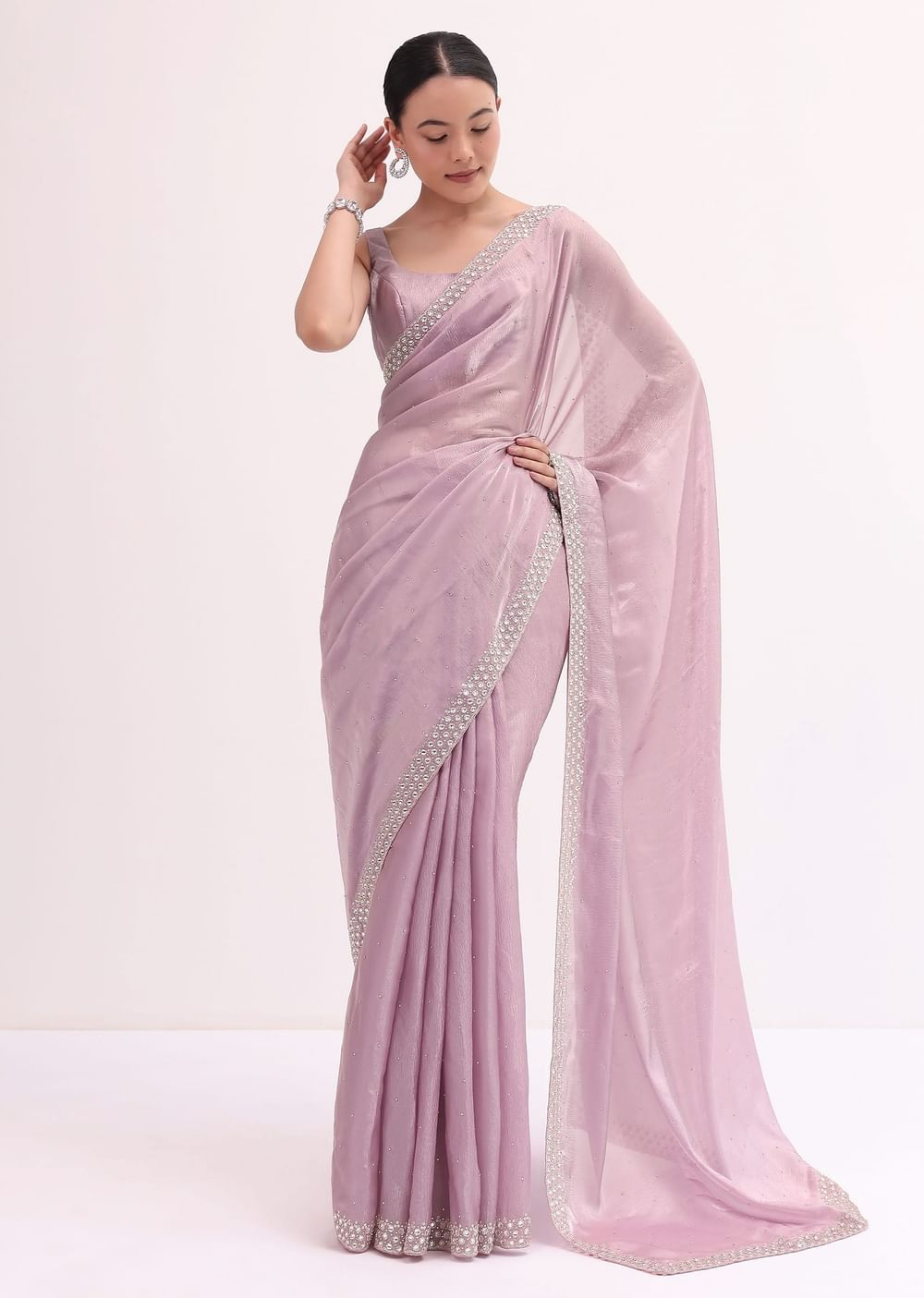 Opt for delicate silver or pearl jewelry can complement the soft hue beautifully.Fit Tip:Pay attention to the length of the saree to achieve the desired look.