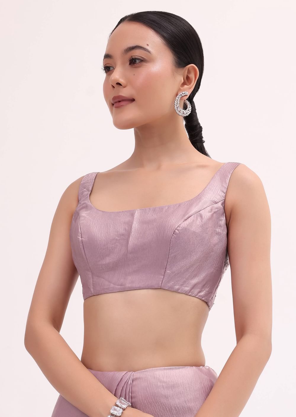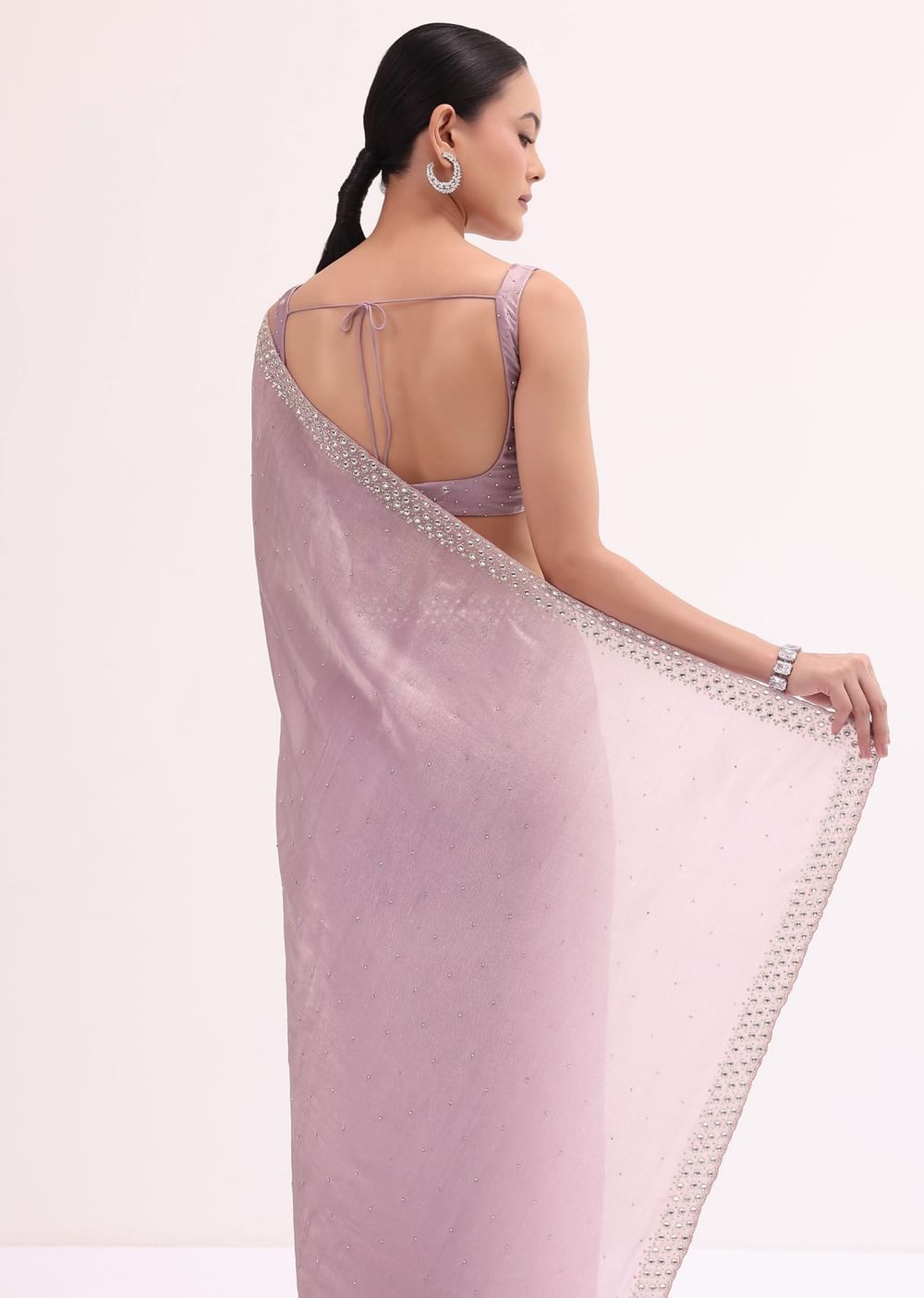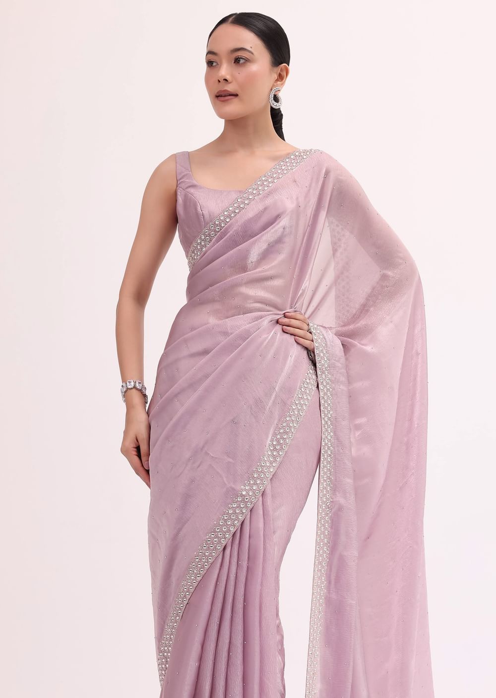 Opt for delicate silver or pearl jewelry can complement the soft hue beautifully.Fit Tip:Pay attention to the length of the saree to achieve the desired look.