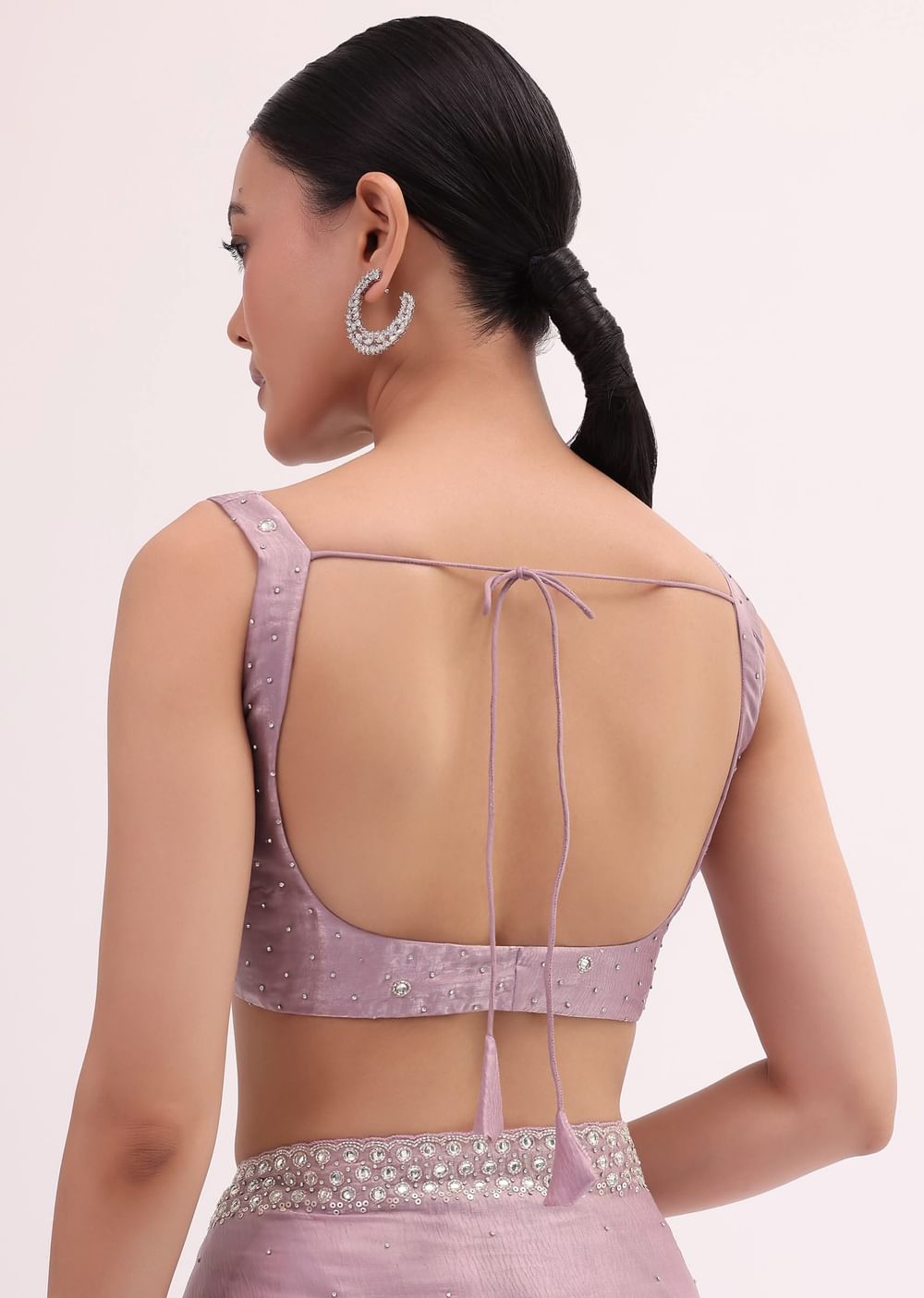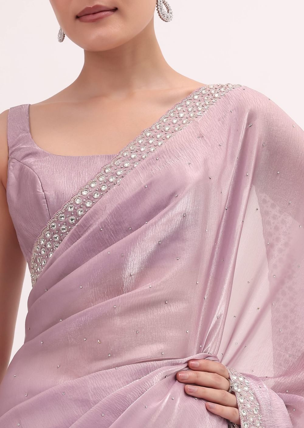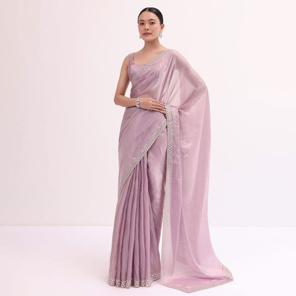 Rejoice in grace with this purple saree, which features a cutdana embroidered border. Made with an elegant tissue fabric. The saree is paired with an unstitched blouse. Style this saree at cocktail events or weddings. Awarded as the Most Trusted Brand, we're delivering styles you love, just as promised.