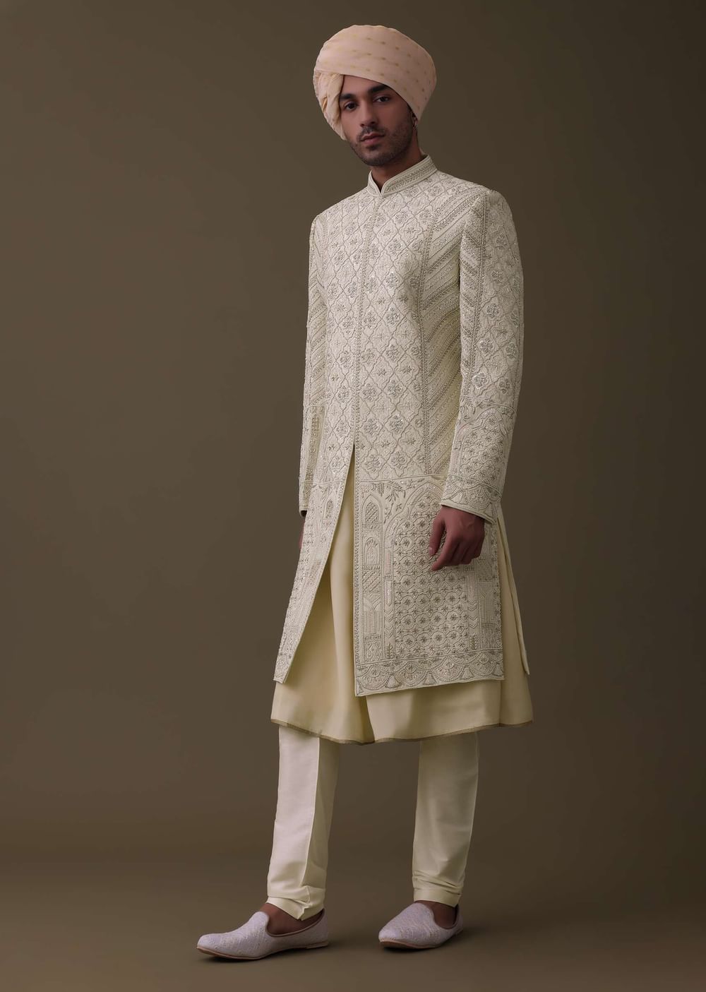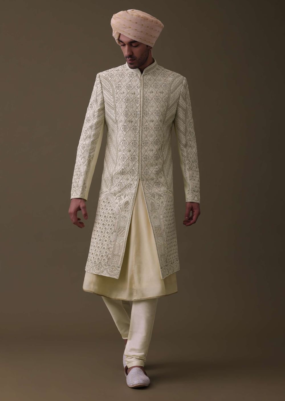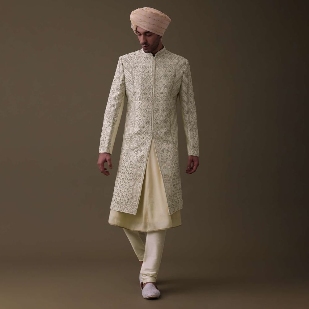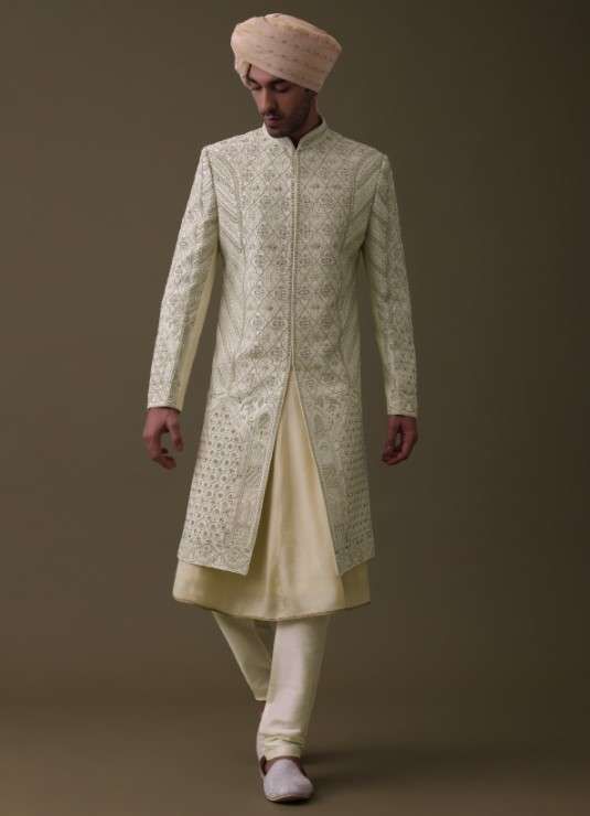 Introducing our embroidered sherwani set, expertly crafted with premium silk. The set includes a matching sleeveless anarkali kurta, a mala, and a churidar.The embroidery on the sherwani is intricate and detailed, with beautiful patterns. The sherwani comes in a mandarin collar neckline with full sleeves. EVENT - Perfect for weddings and receptions.NOTE - Buttons and accessories may vary in color, shape and size.Change folds regularly. Awarded as the Most Trusted Brand, we're delivering styles you love, just as promised.
