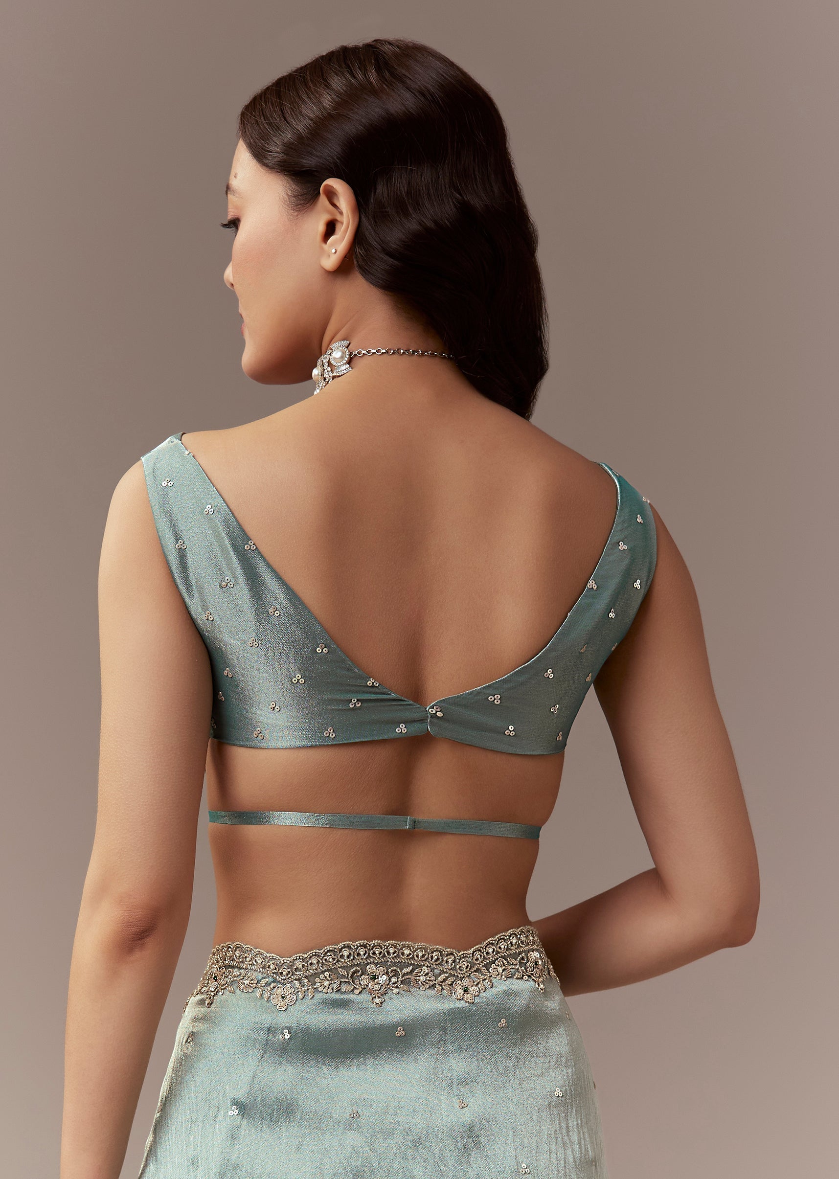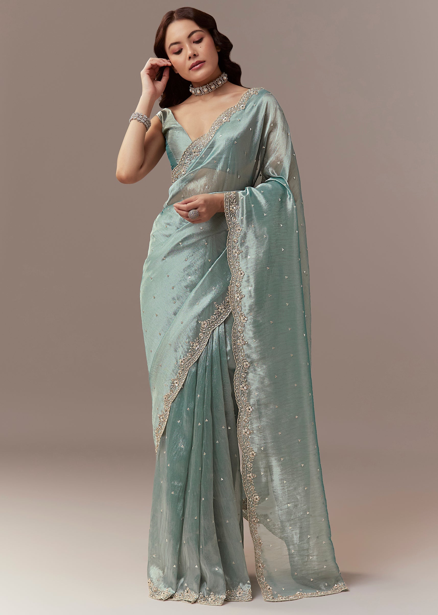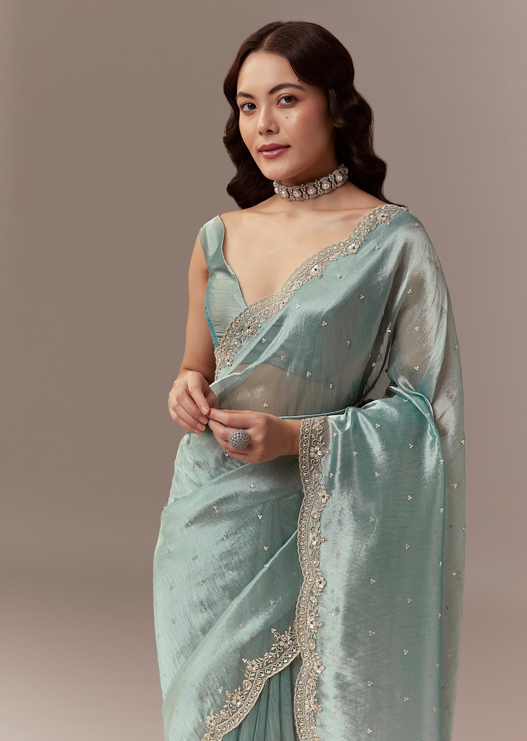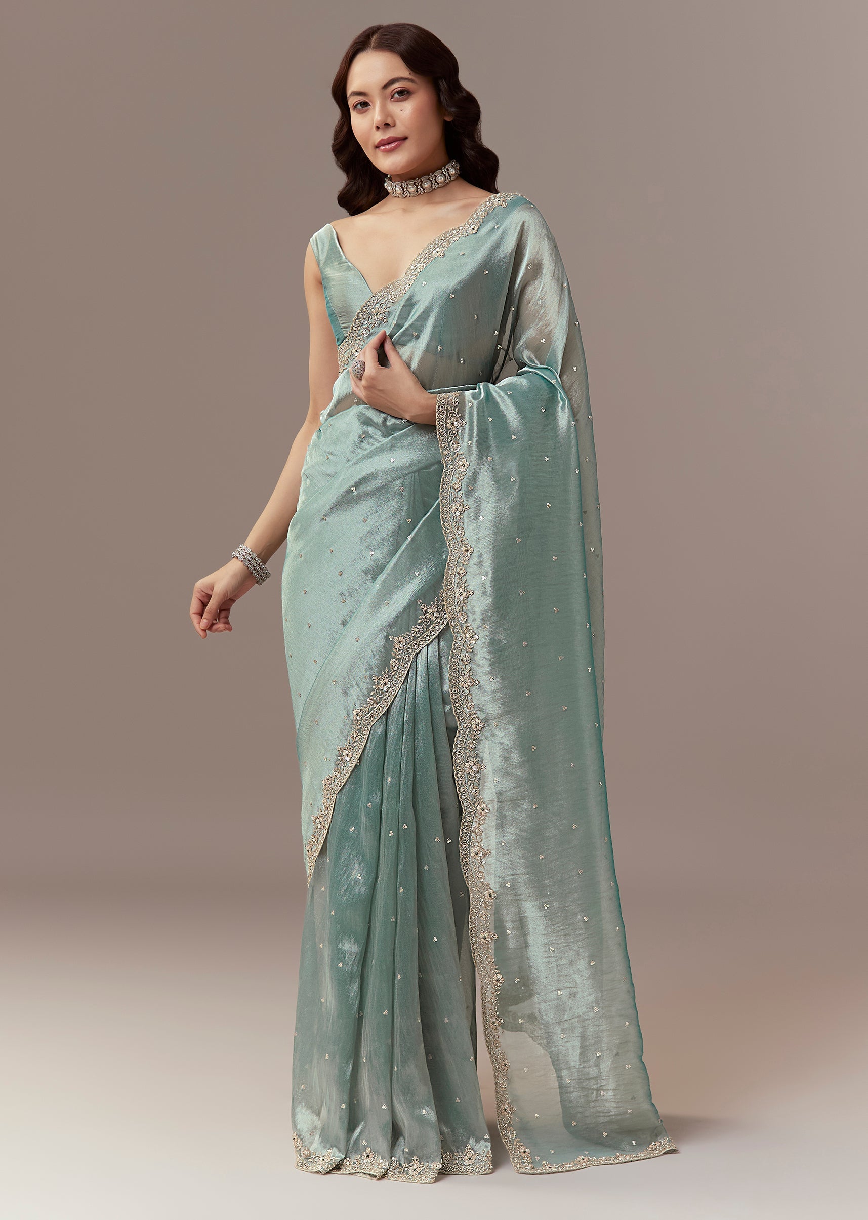 Soft elegant and festive this light blue tissue silk saree is perfect for mehendi and reception celebrations as a wedding guest. The pastel hue is enhanced with a scalloped border embroidered with cutdana beads and sequins creating a delicate shimmer and refined look. The saree comes with unstitched blouse fabric allowing a customized and comfortable fit. Ideal for daytime or evening functions it exudes grace sophistication and celebration ready charm. Awarded as the Most Trusted Brand, we're delivering styles you love, just as promised.