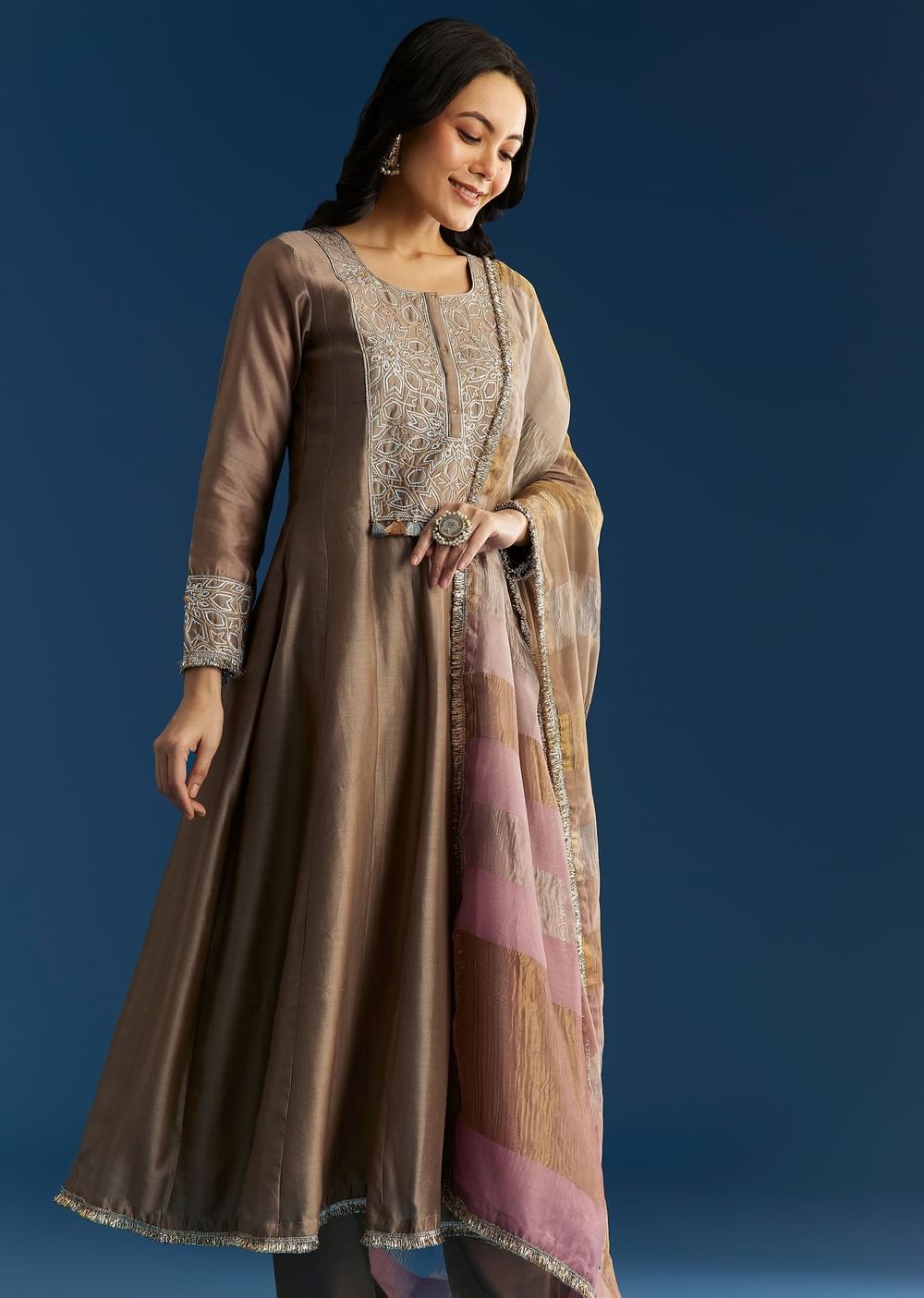 A light brown Anarkali in rich Chanderi fabric, embellished with gotta lace work. Paired with a crush tissue dupatta featuring a gotta border, this outfit brings effortless grace to festive... More Product Details