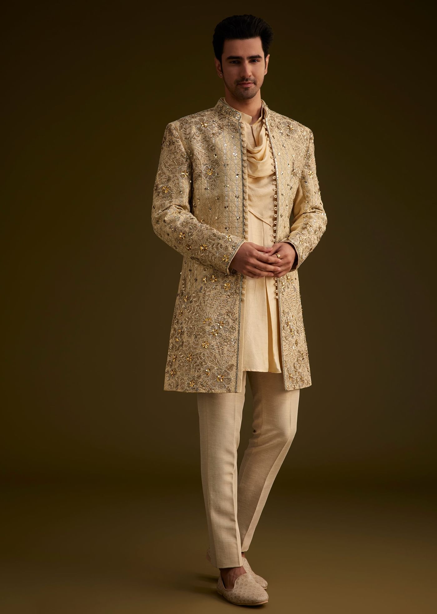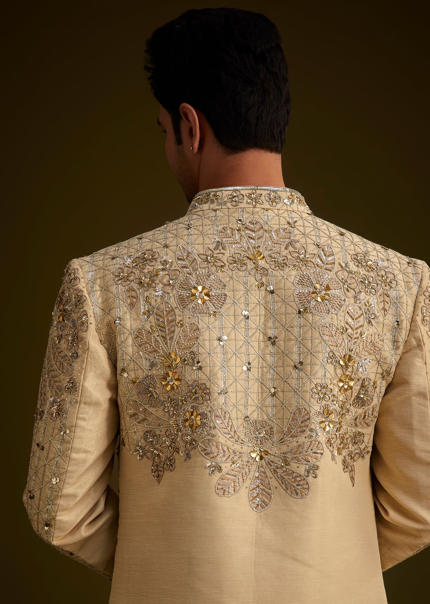 Light Gold Silk Open Sherwani Set With Zardosi Handwork