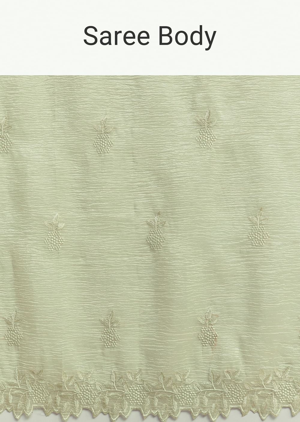 - A blend of grace and fine artistry this light green crushed tissue saree features an exquisite resham thread embroidered cutwork border.