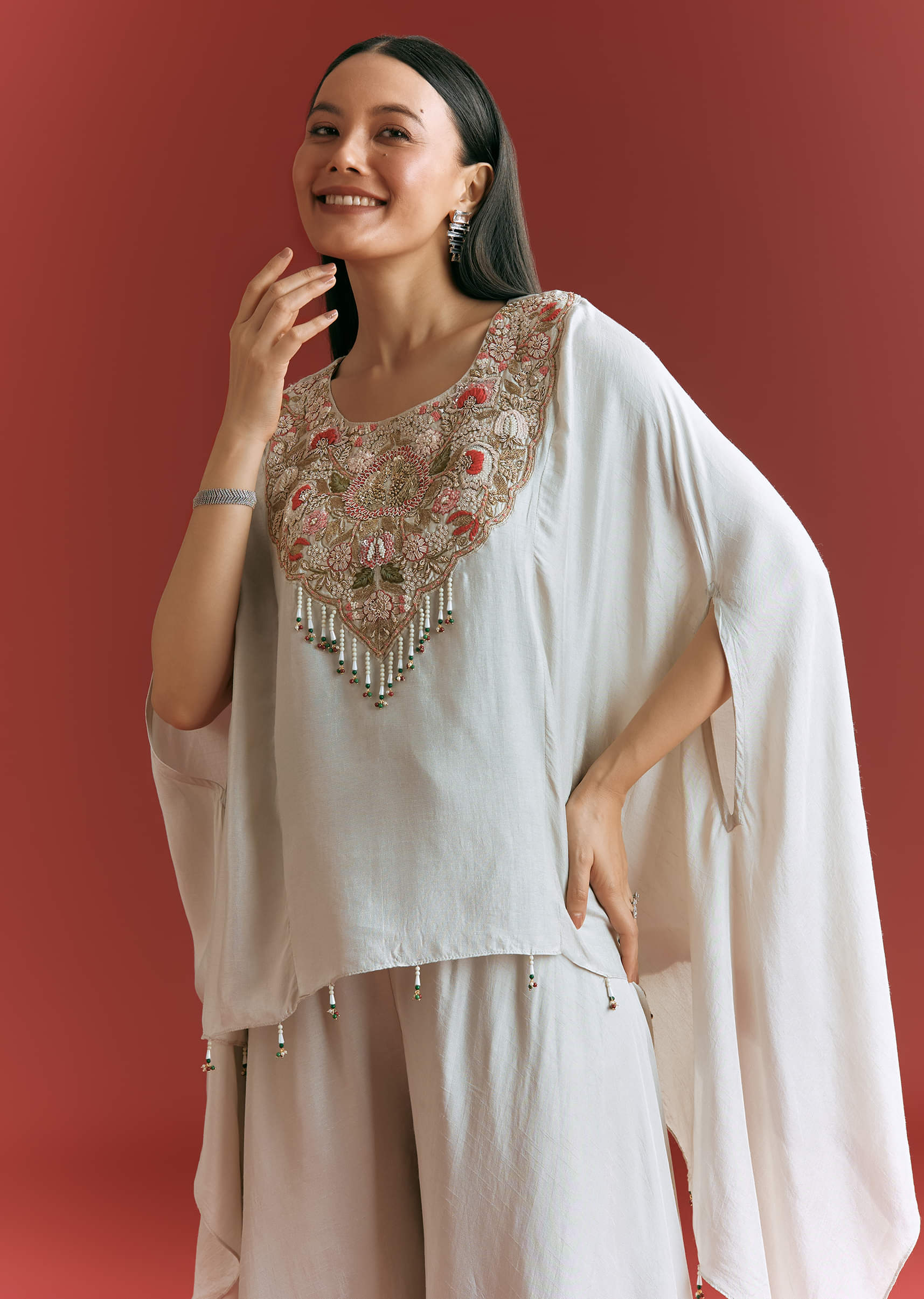 Subtle yet striking, this light grey dola silk kaftaan sparkles with delicate zardosi embroidery—crafted to charm in minimal tones. Awarded as the Most Trusted Brand, we're delivering styles you love, just as promised.