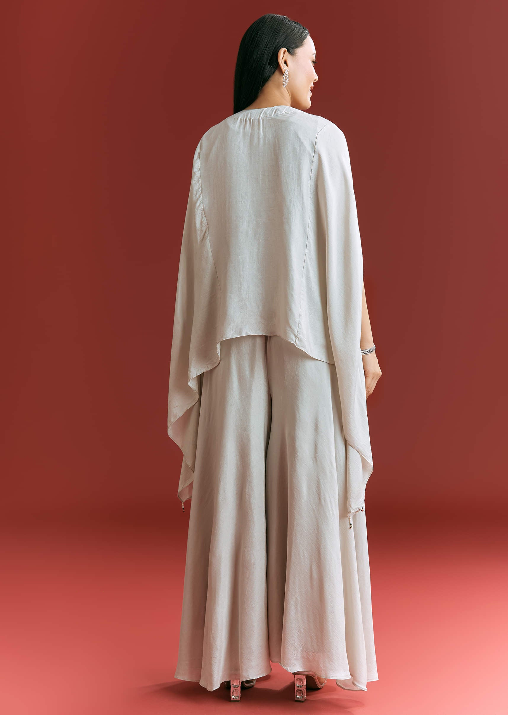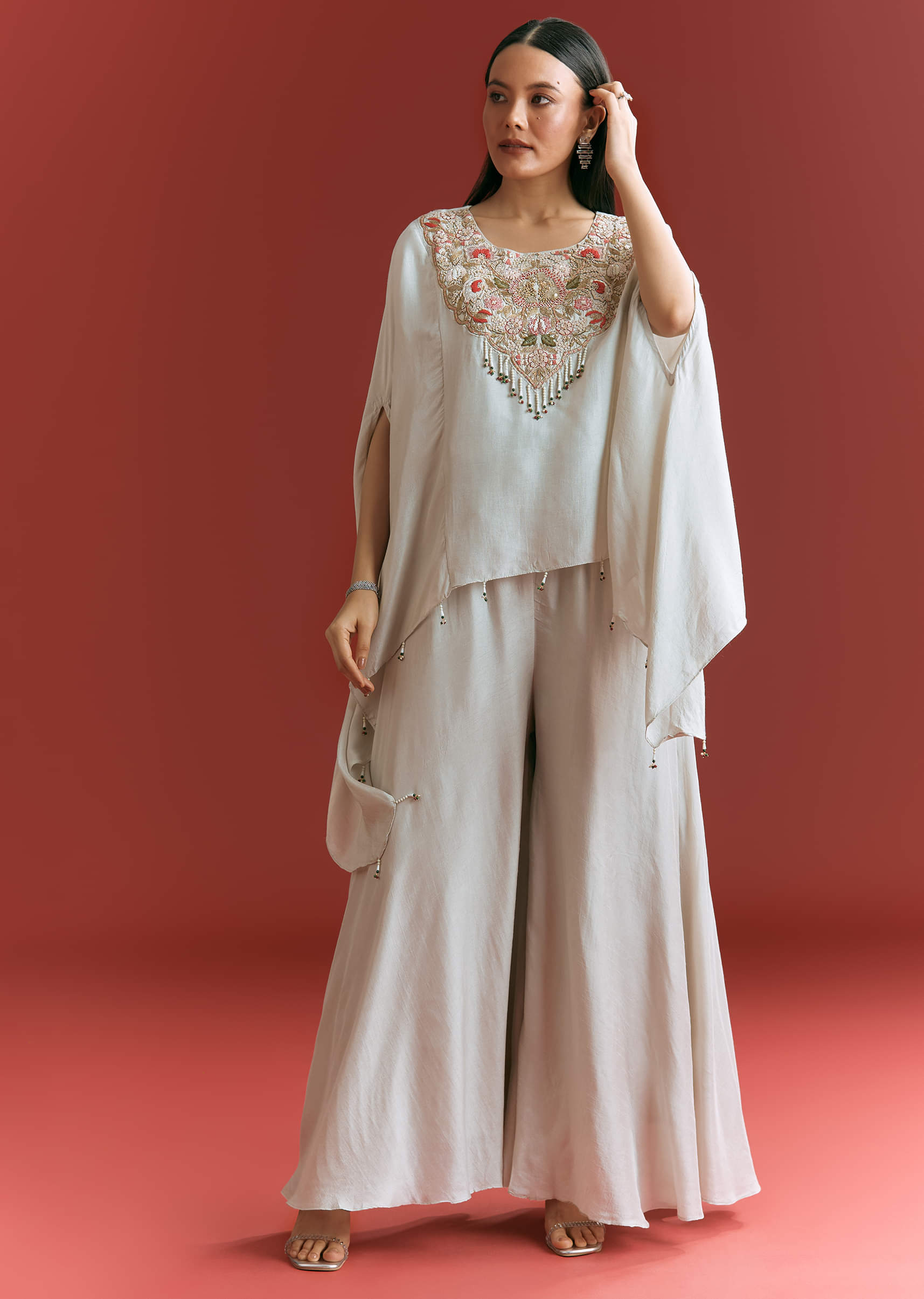 Light Grey Dola Silk Kaftaan Suit With Zardosi Work