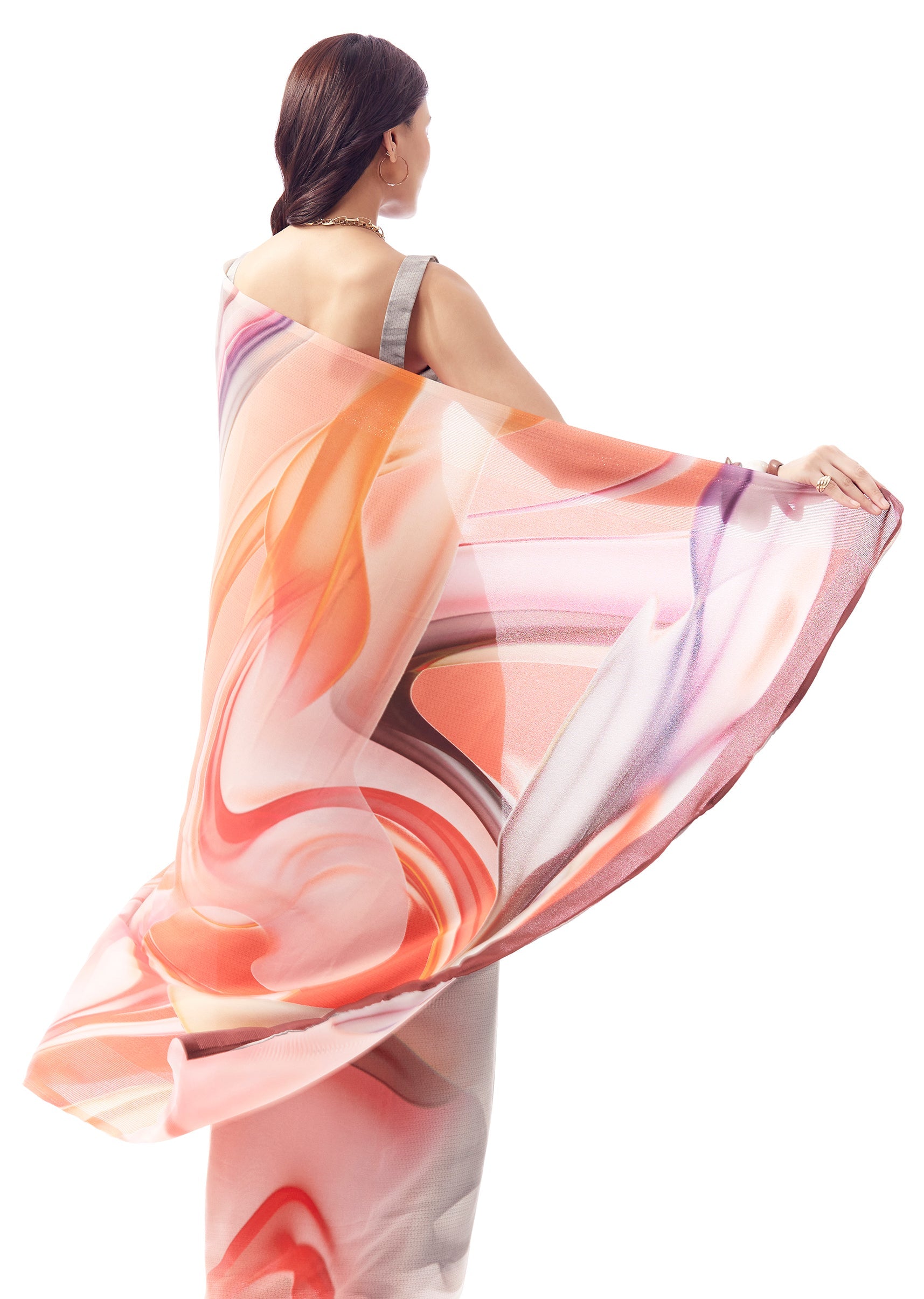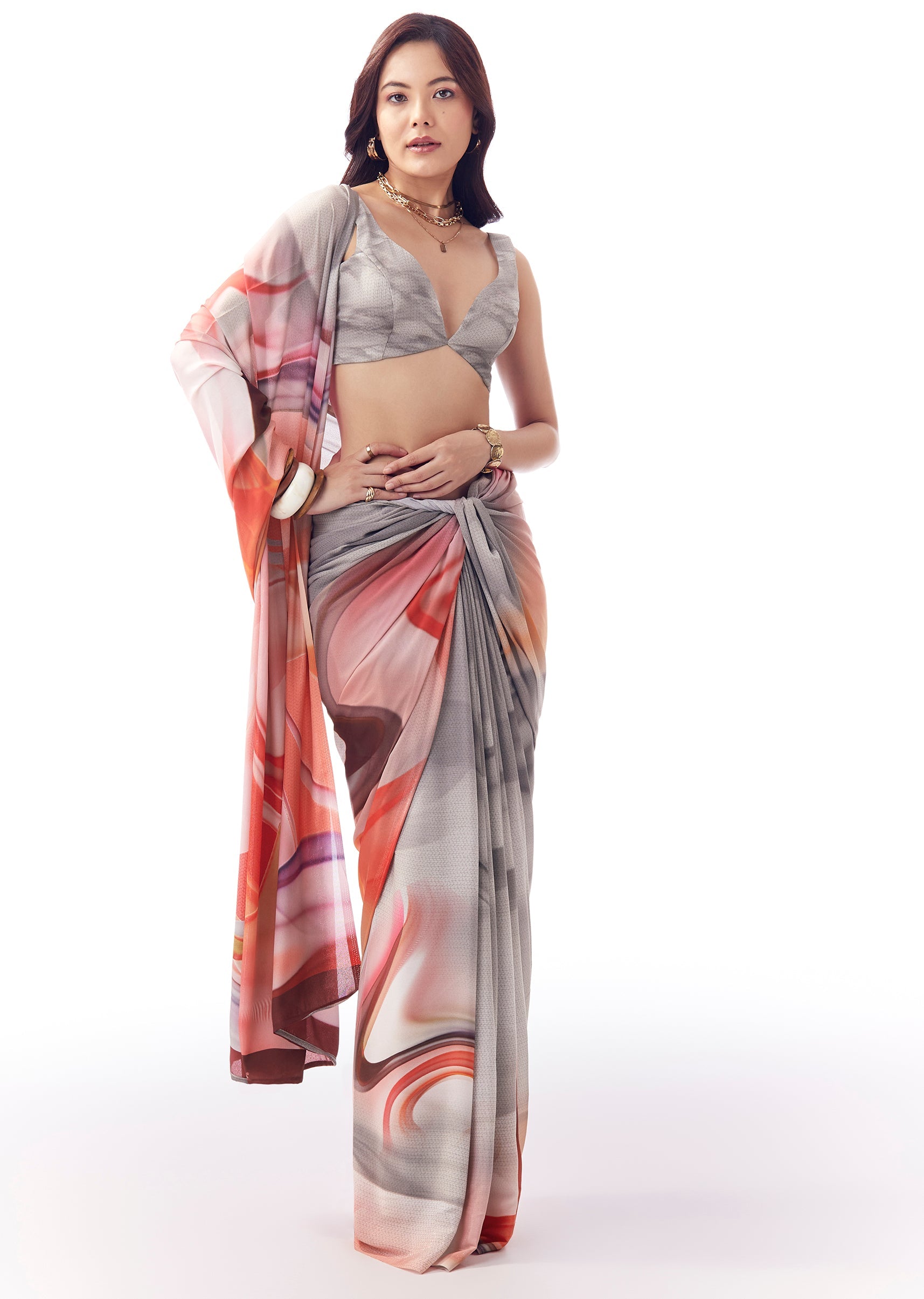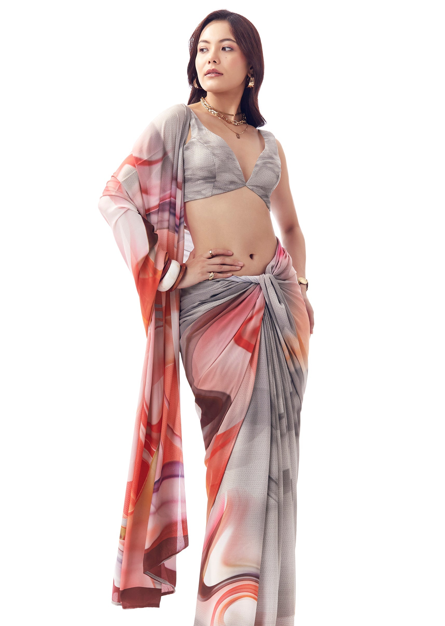 This light grey georgette saree features multicolour abstract print with a textured look, making it a fun everyday statement without feeling loud. Comes with printed blouse fabric and works perfectly for casual outings and relaxed occasions.