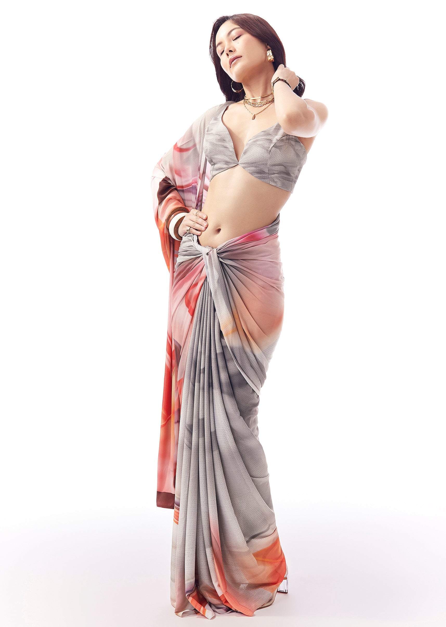 Fit Tips:Pin the pallu near the shoulder to keep the print looking clean and aligned.