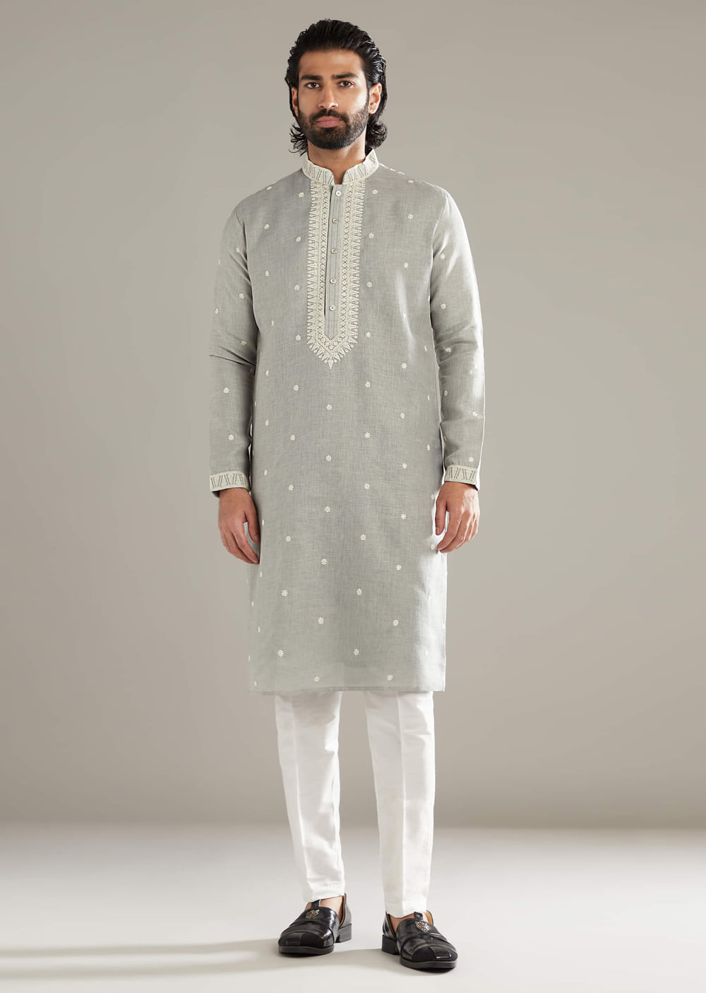 Light Grey Linen Kurta Set For Men With Resham Hand Work
