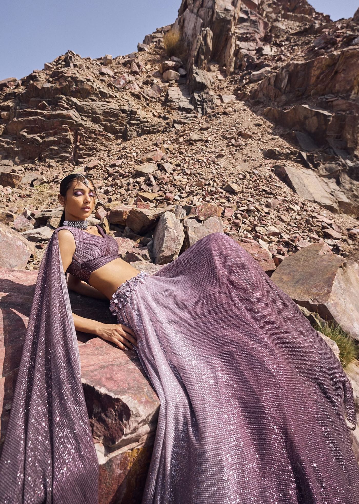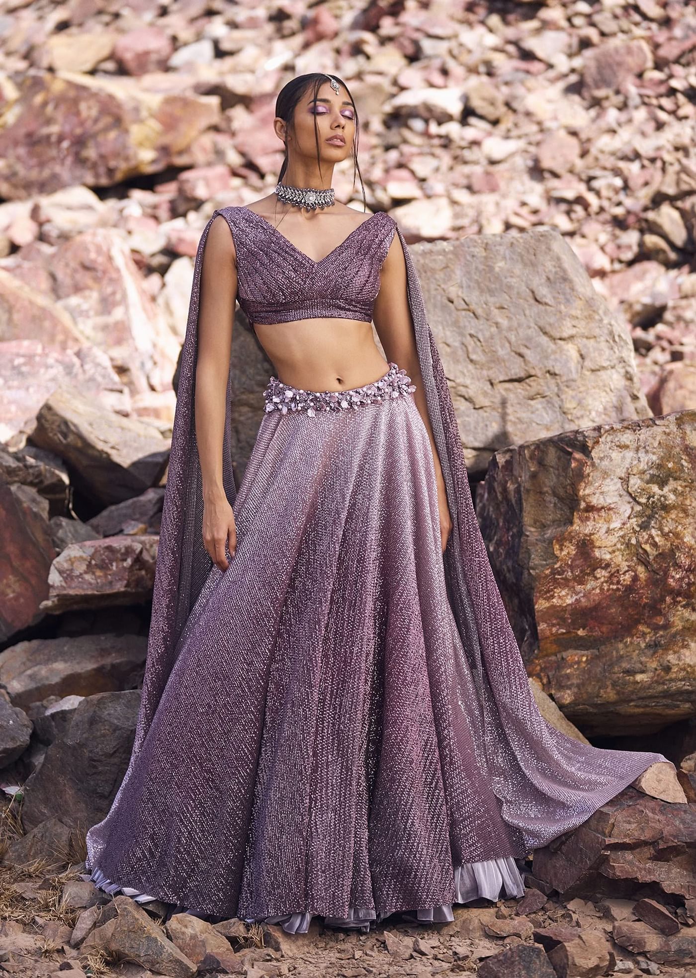 Lilac Crushed Shimmer Lehenga With Blouse And Cape