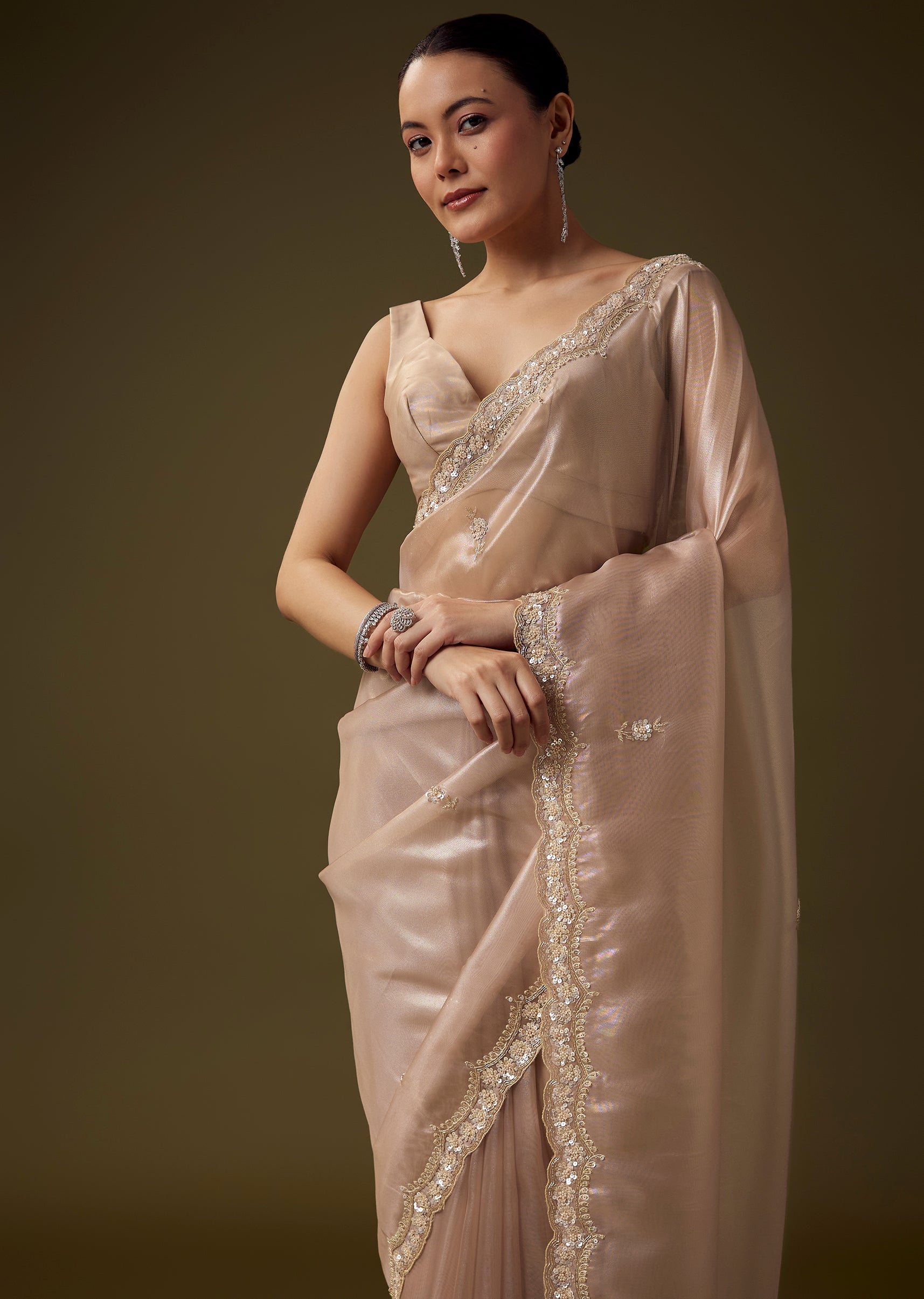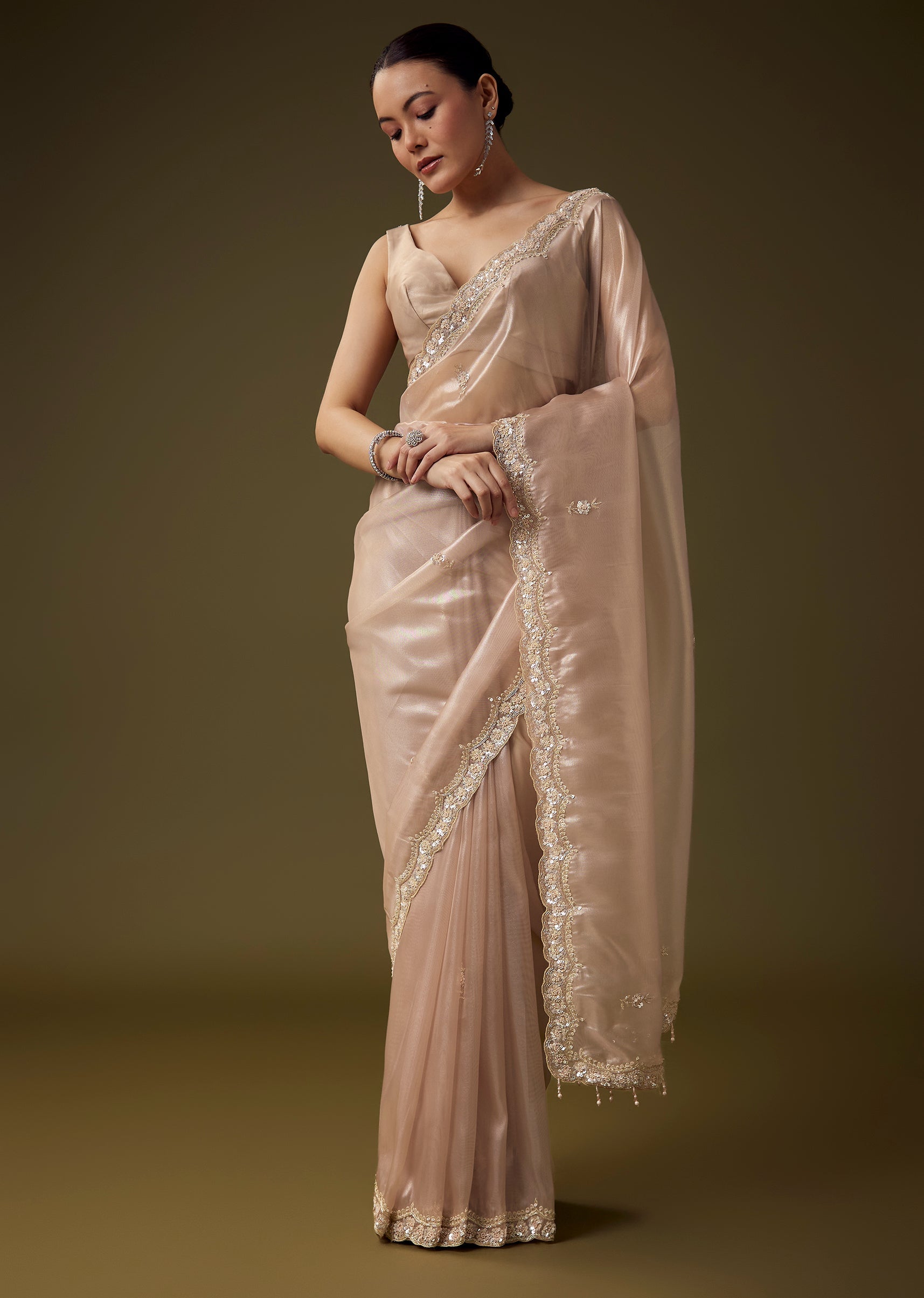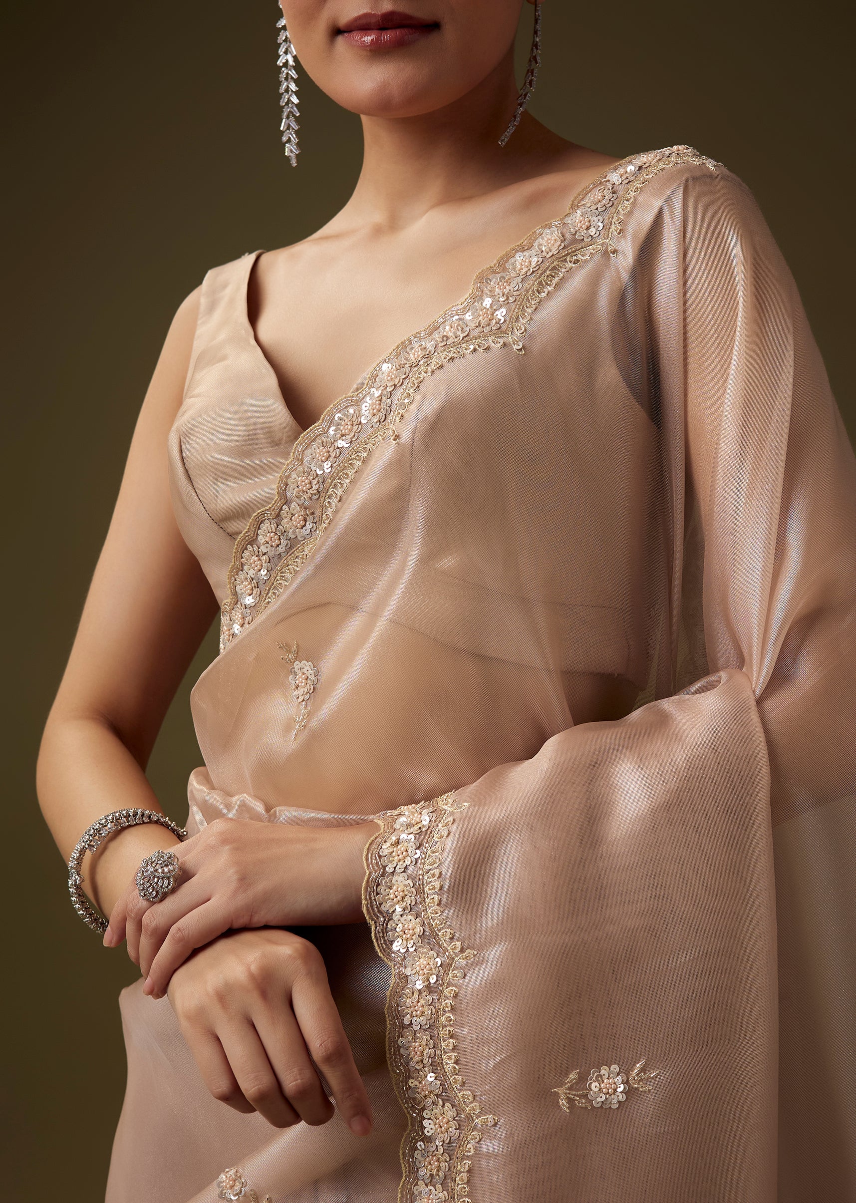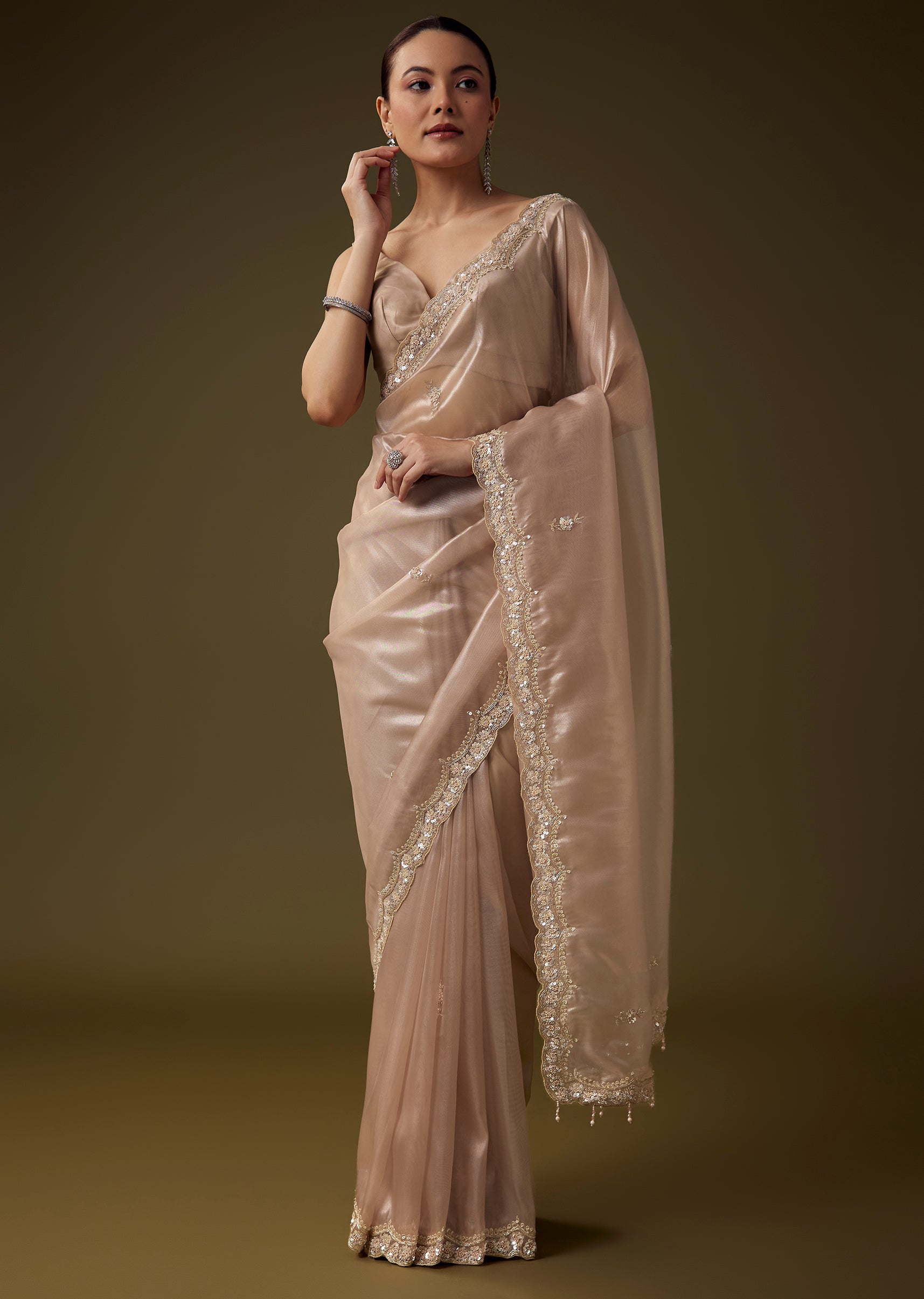Delicate tissue fabric gives this saree an ethereal sheen, brought to life with intricate hand embroidered butti work and a beautifully crafted scallop border enriched with cut dana, zardosi, sequins,... More Product Details