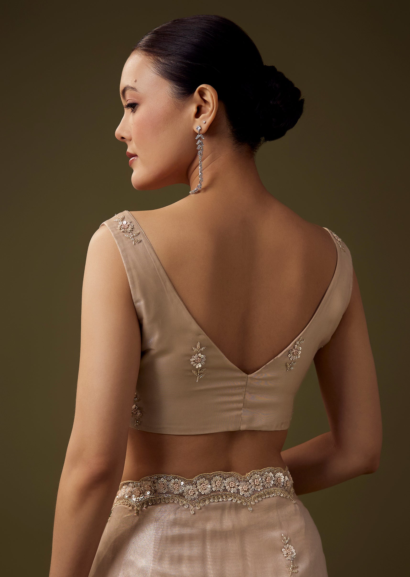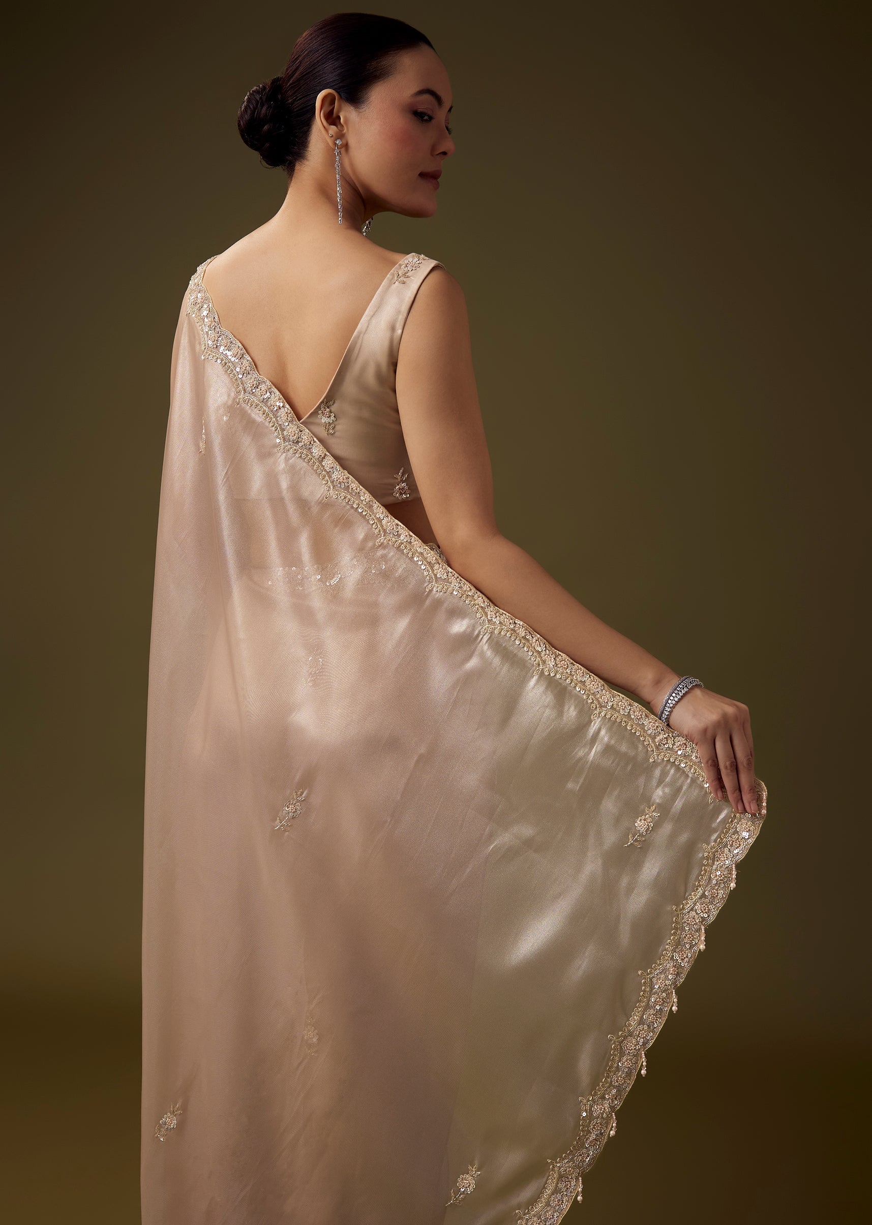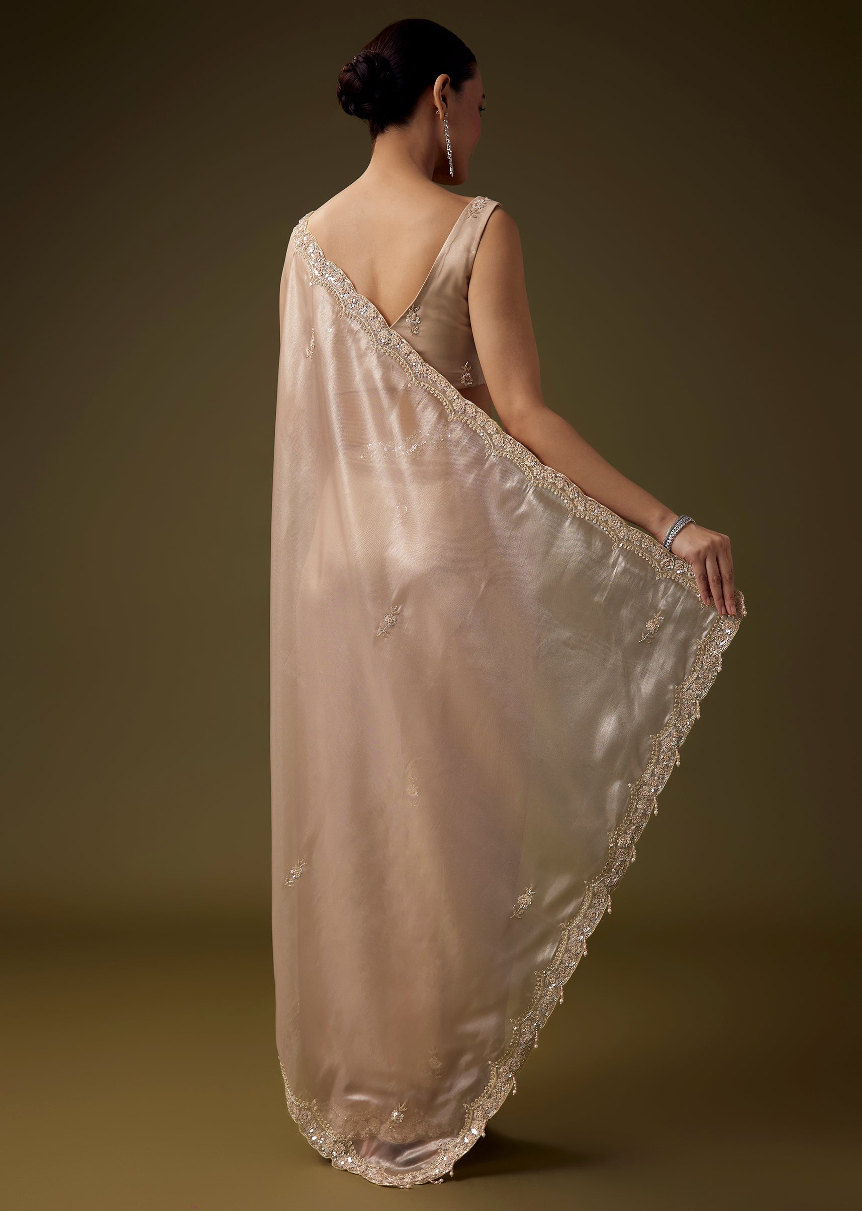 Fit Tips:Keep the pleats neatly defined for a fluid drape and select a well structured blouse to complement the saree’s delicate artistry.
