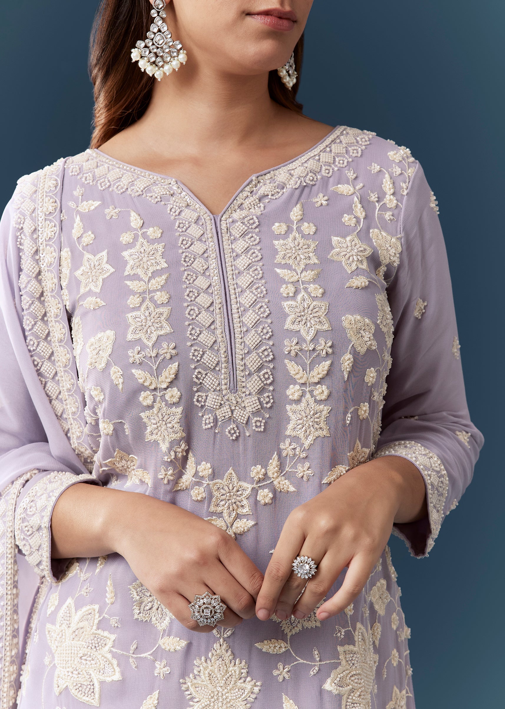 A gentle touch of elegance defines this lilac georgette kurta set, beautifully embellished with delicate bead accents and resham embroidery that add a subtle festive sheen. The three fourth sleeve... More Product Details