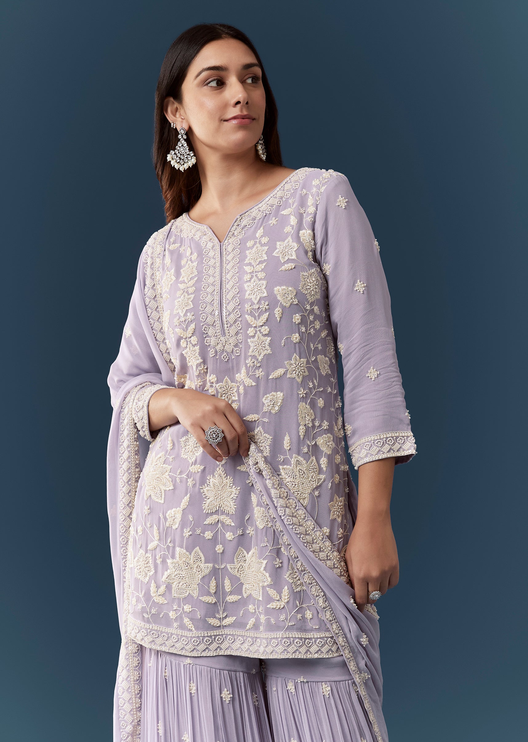 Ensure the kurta fits comfortably at the shoulders and bust and check that the sharara sits securely at the waist for easy graceful movement.