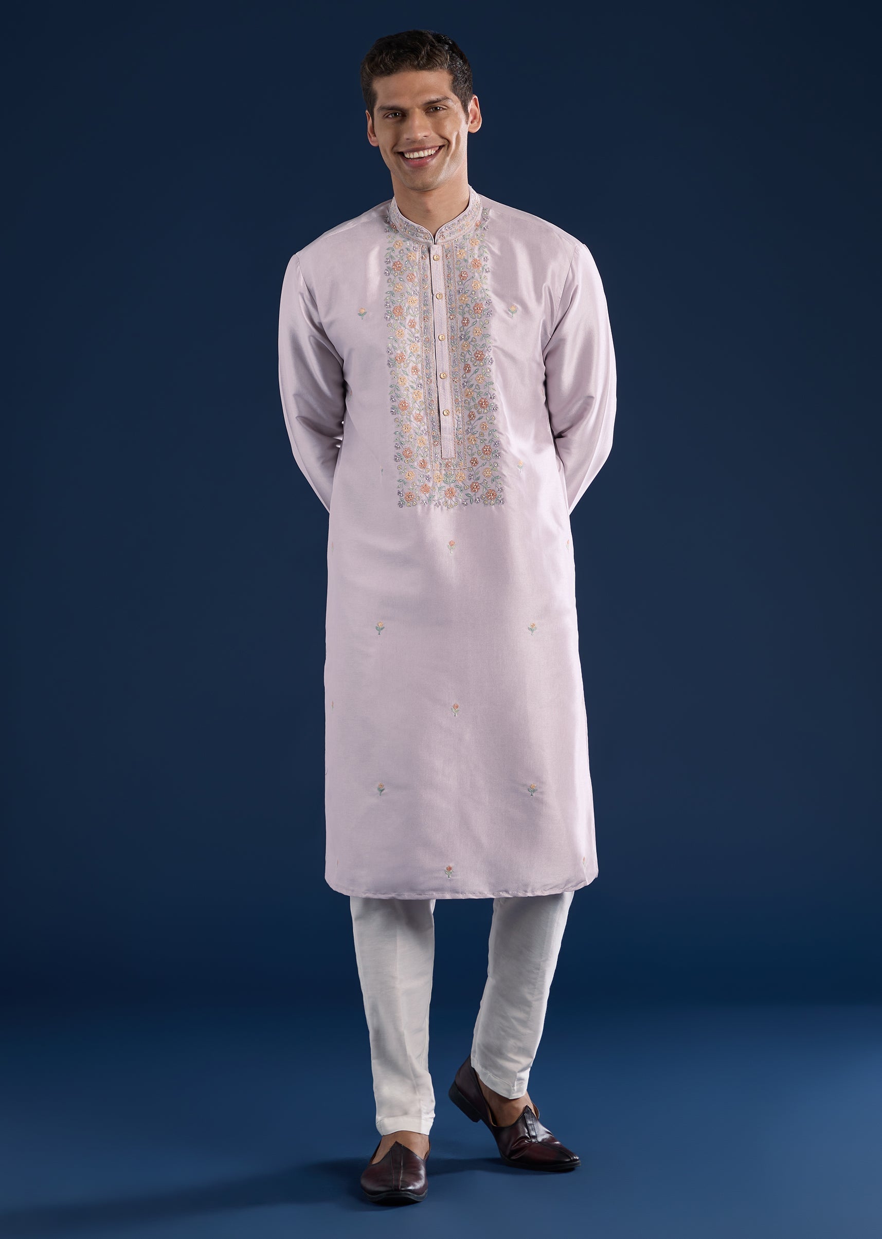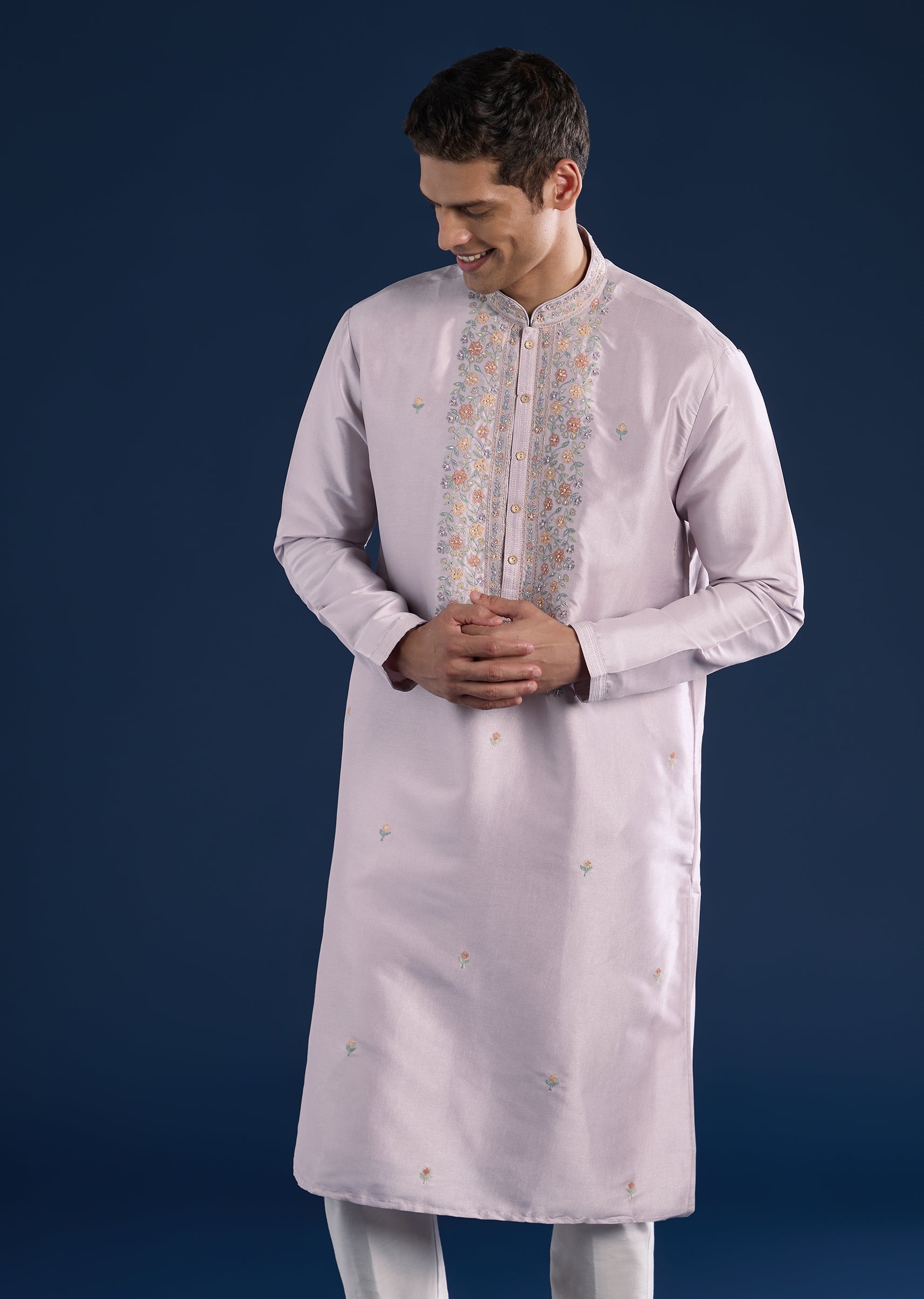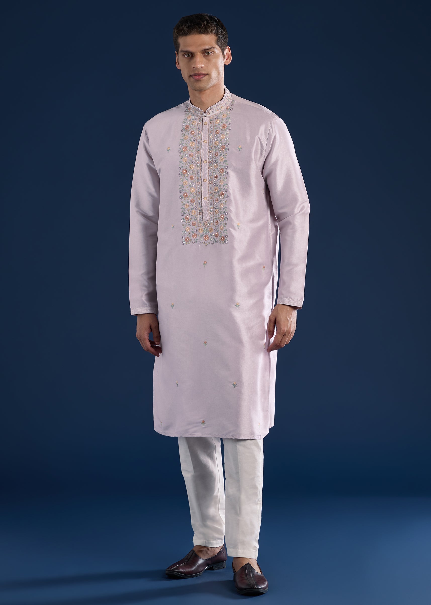 This lilac kurta set is crafted in art silk and detailed with resham thread and subtle motifs for a polished festive finish. Designed with a mandarin collar, full sleeves, and... More Product Details