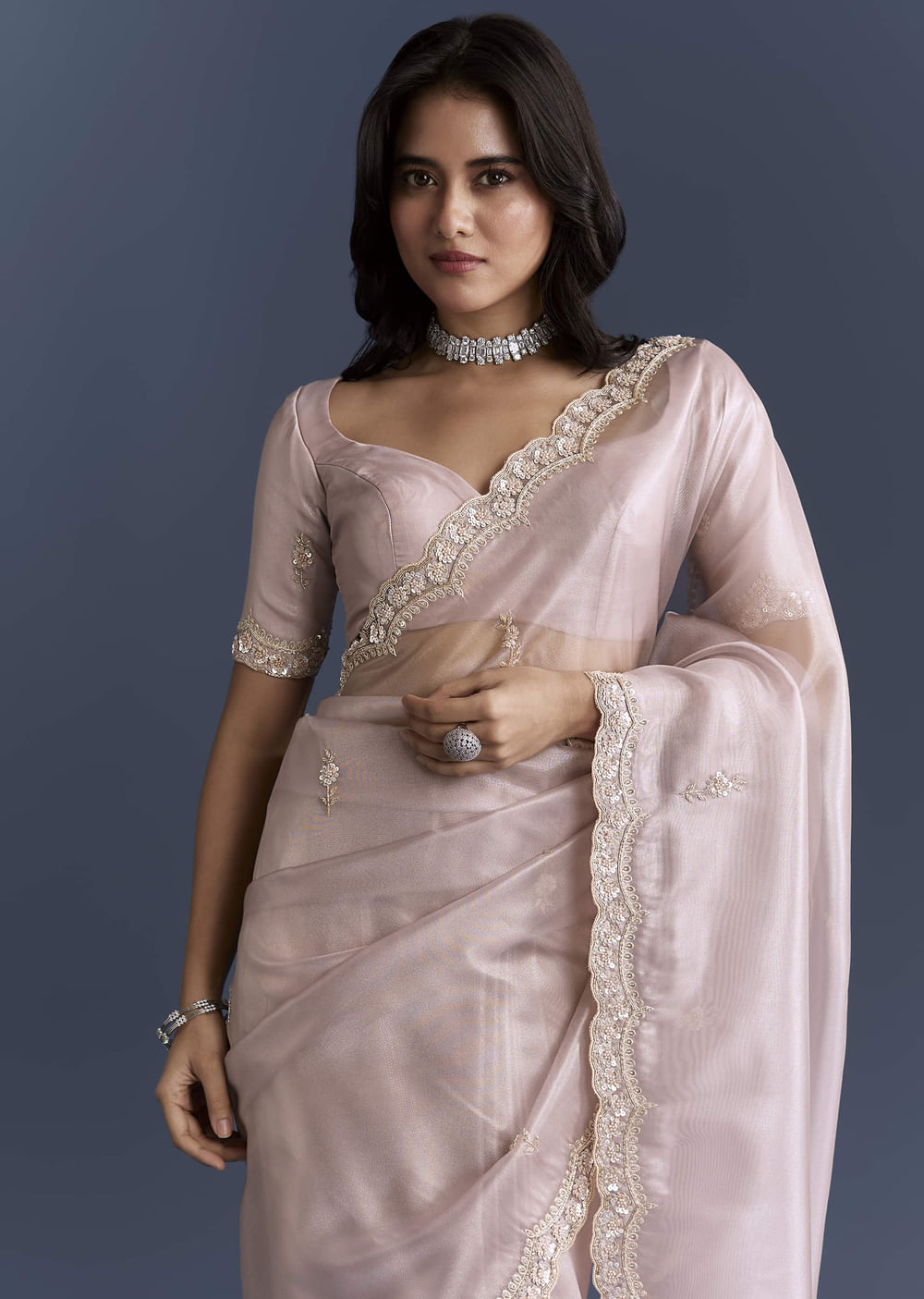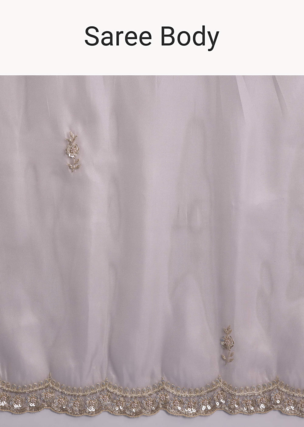 Romantic and light-catching, this lilac net saree carries butti across the body with a scalloped border hand-embroidered in cutdana, zardosi, sequins, beads and moti. The sheer base keeps everything soft... More Product Details