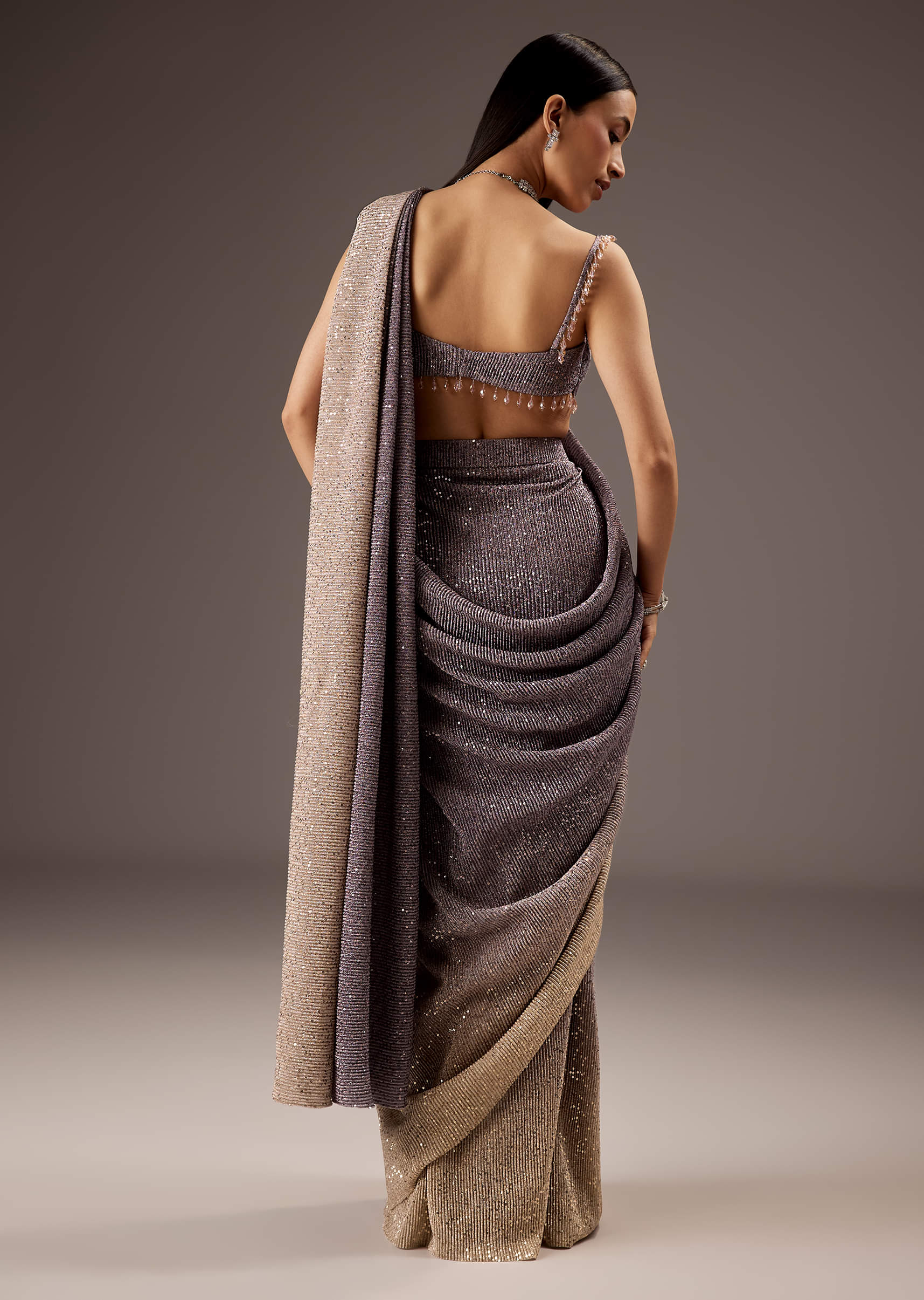 A lilac purple saree thats simple yet striking, paired with a layered blouse finished with dainty tassels for a playful touch. Ideal for sangeet, cocktail, or reception nights when you want to keep it elegant but fun. Awarded as the Most Trusted Brand, we're delivering styles you love, just as promised.