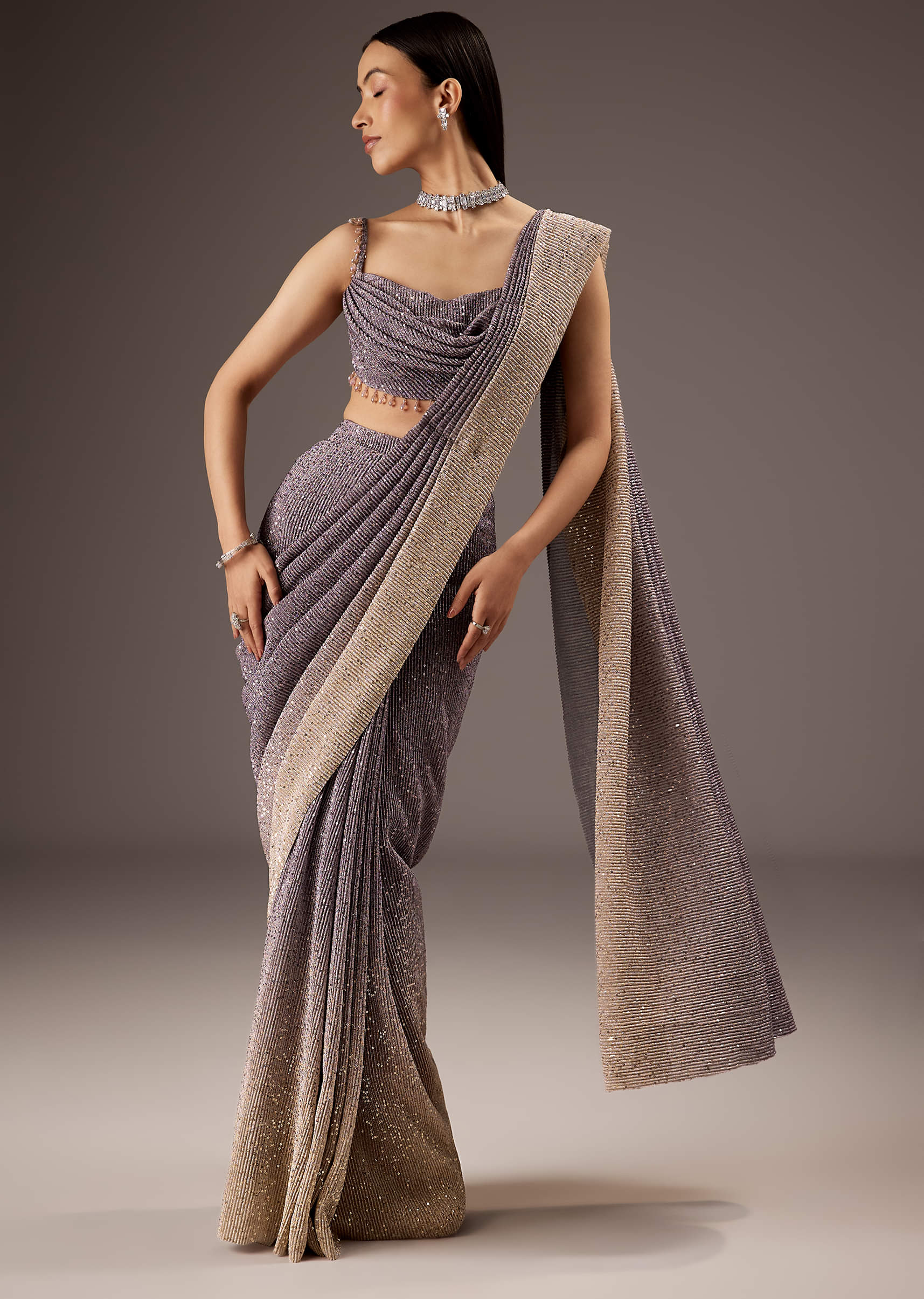 Lilac Purple Saree With Layered Blouse And Elegant Tassels