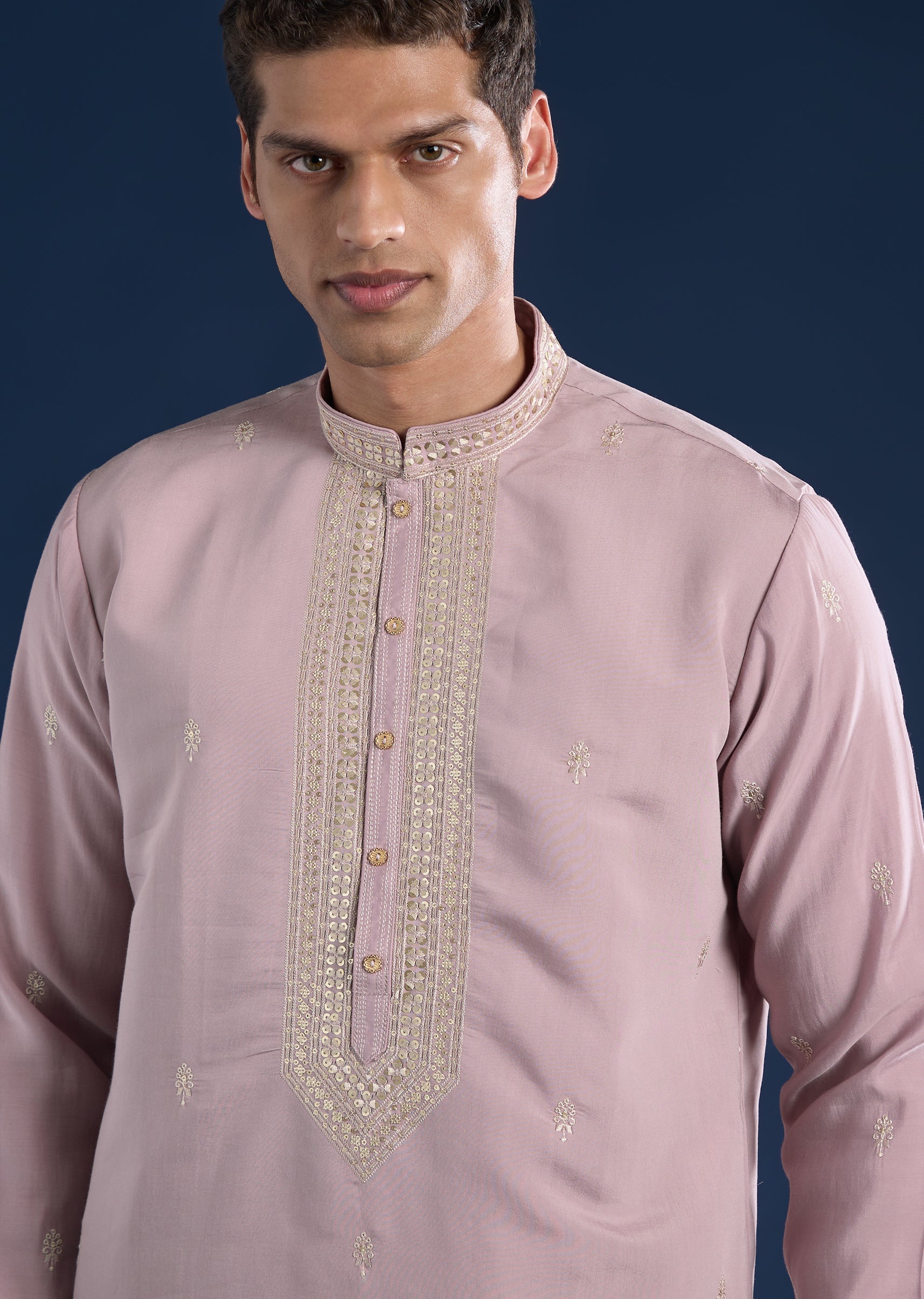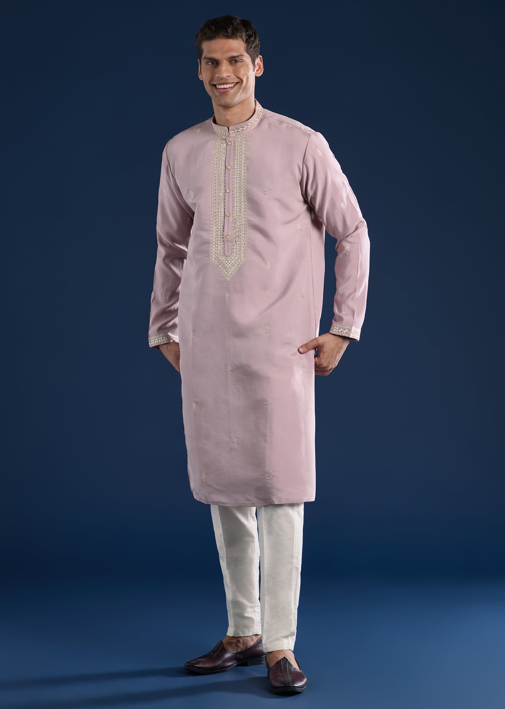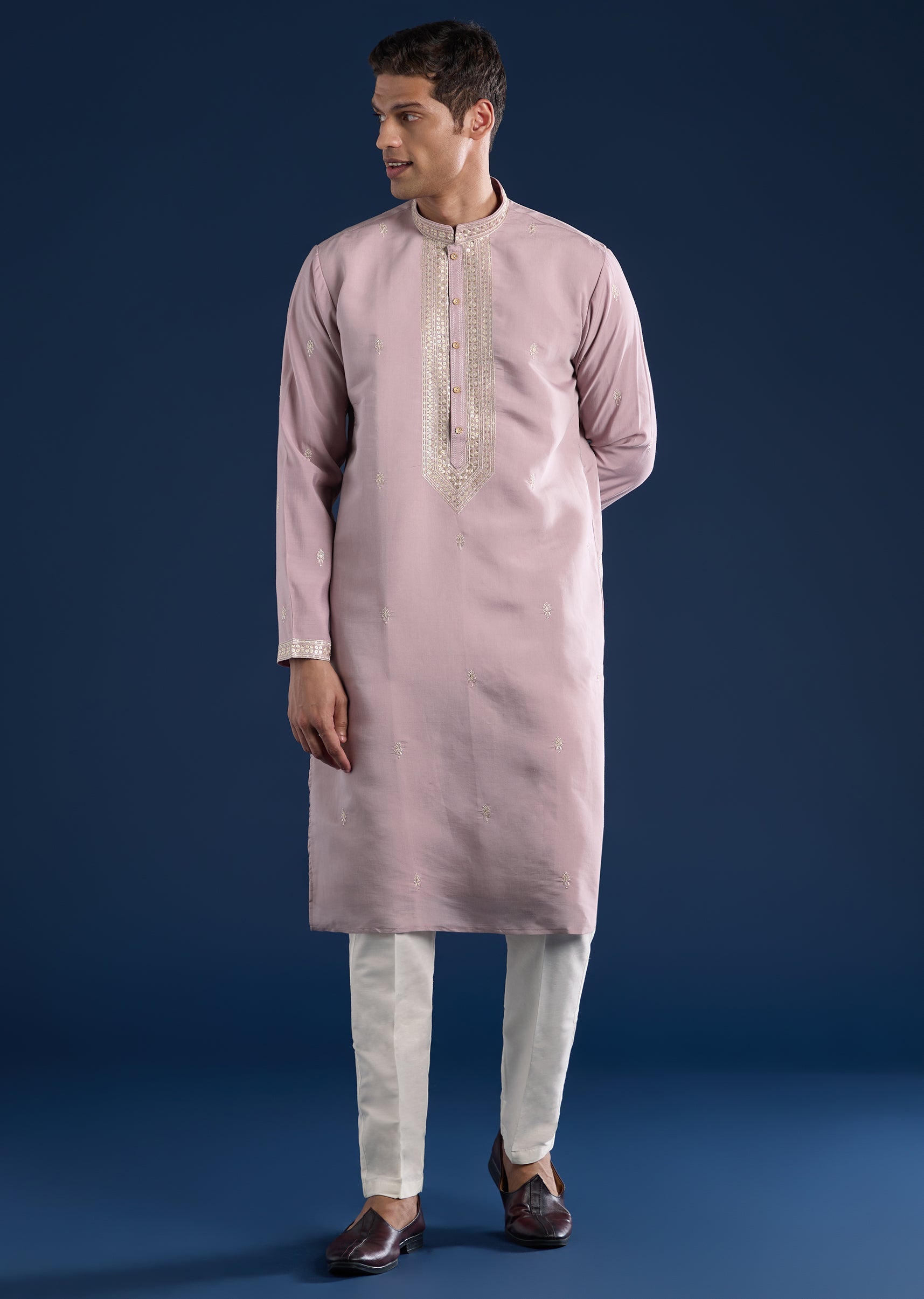 Crafted in art silk, this lilac kurta set features refined resham and sequin detailing for gentle festive sparkle. Designed with a mandarin collar, full sleeves, and side slits, it is... More Product Details