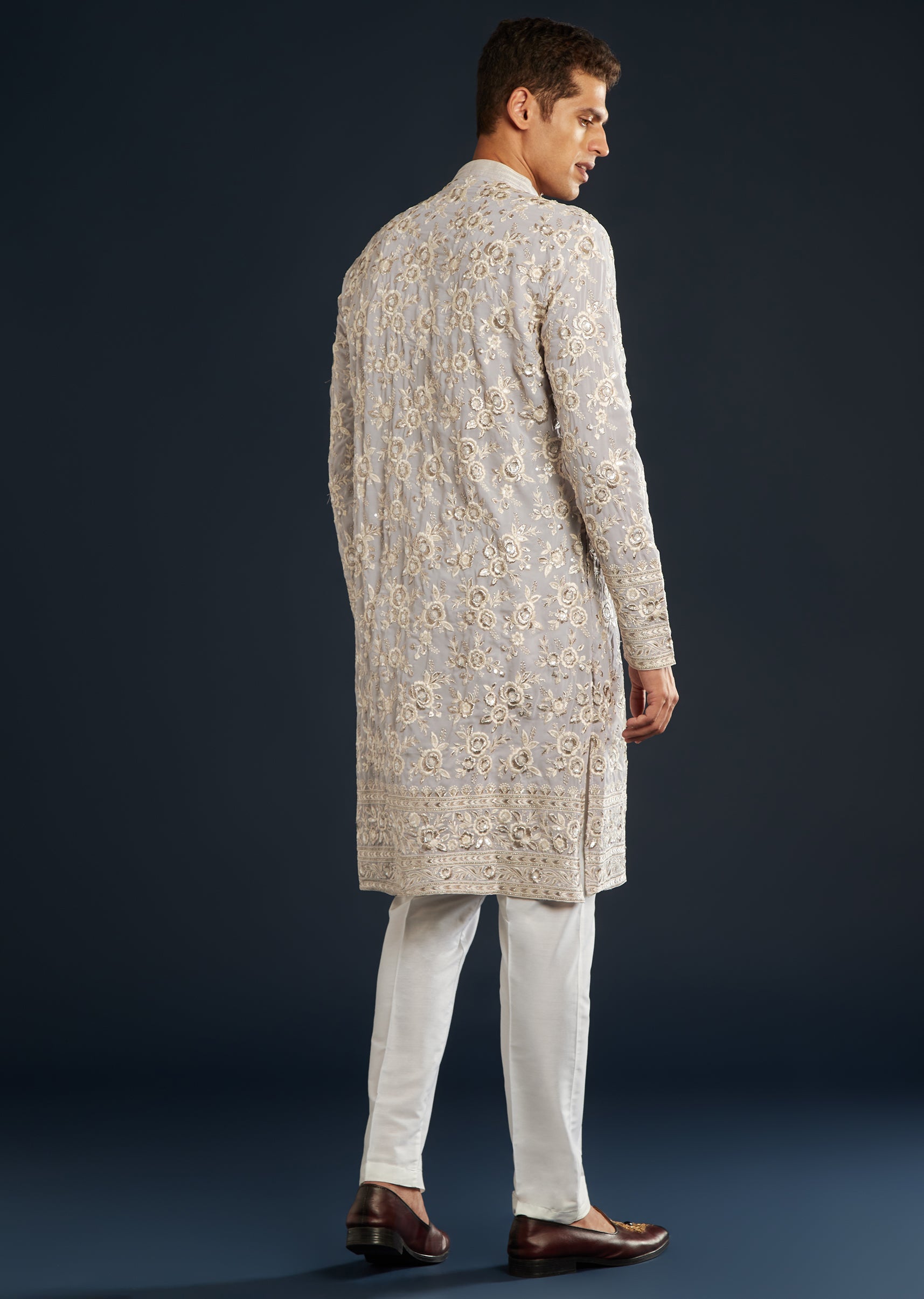 Lilac Silk Mens Kurta Set with Resham Sequin Work